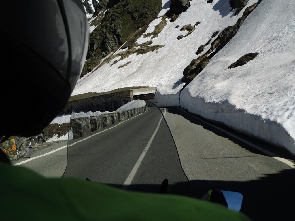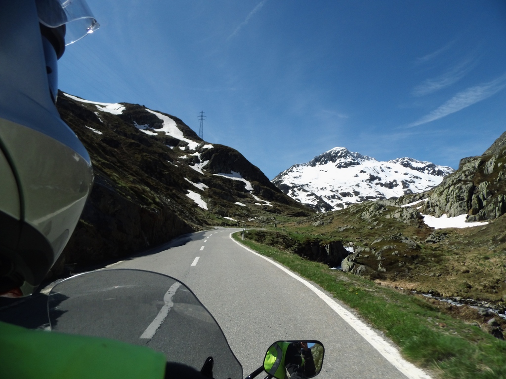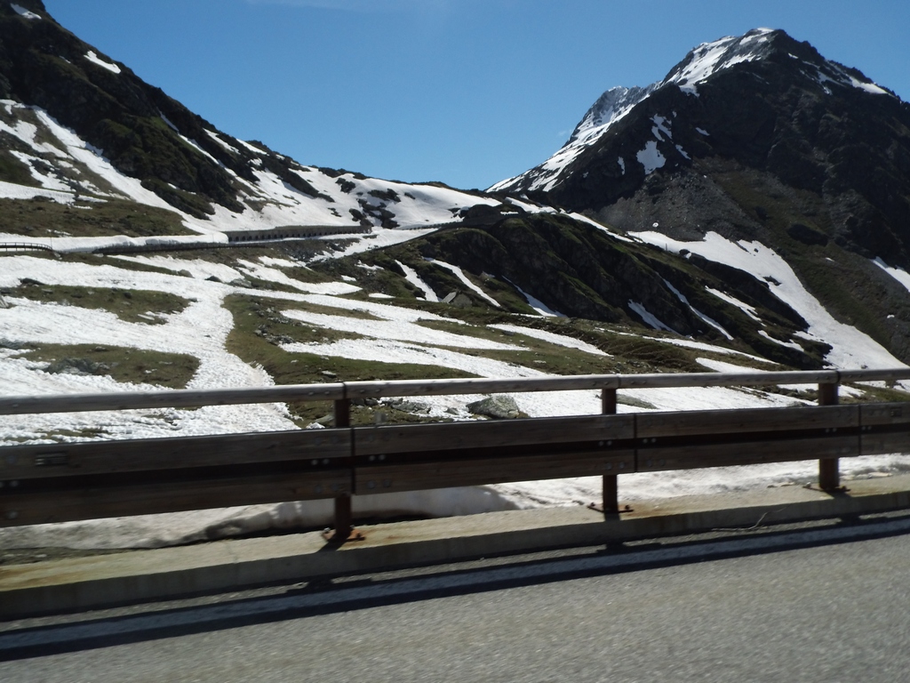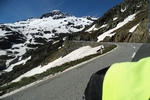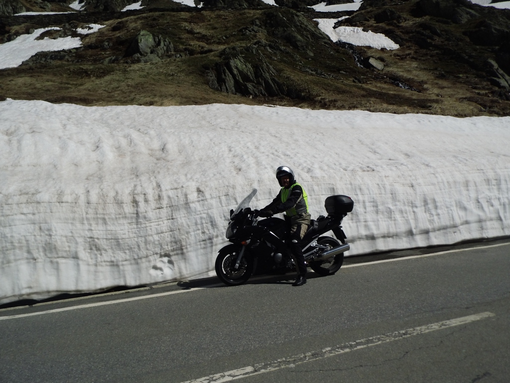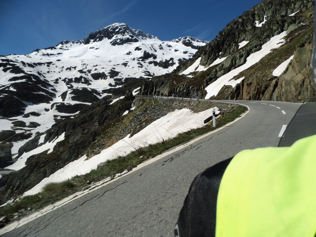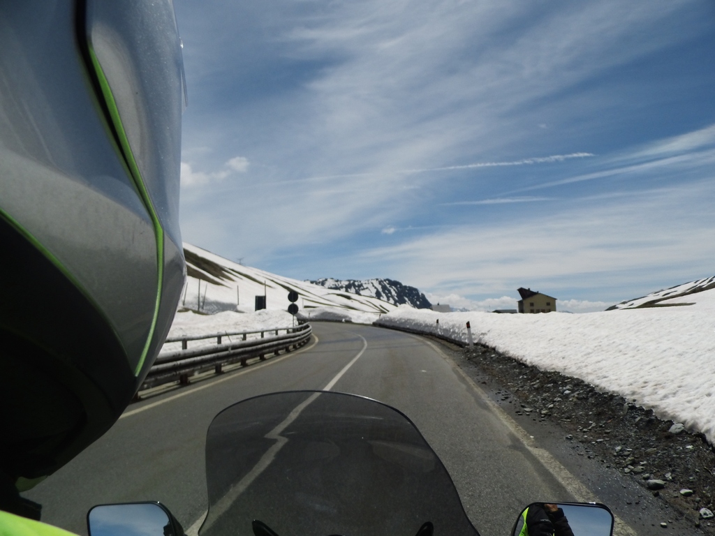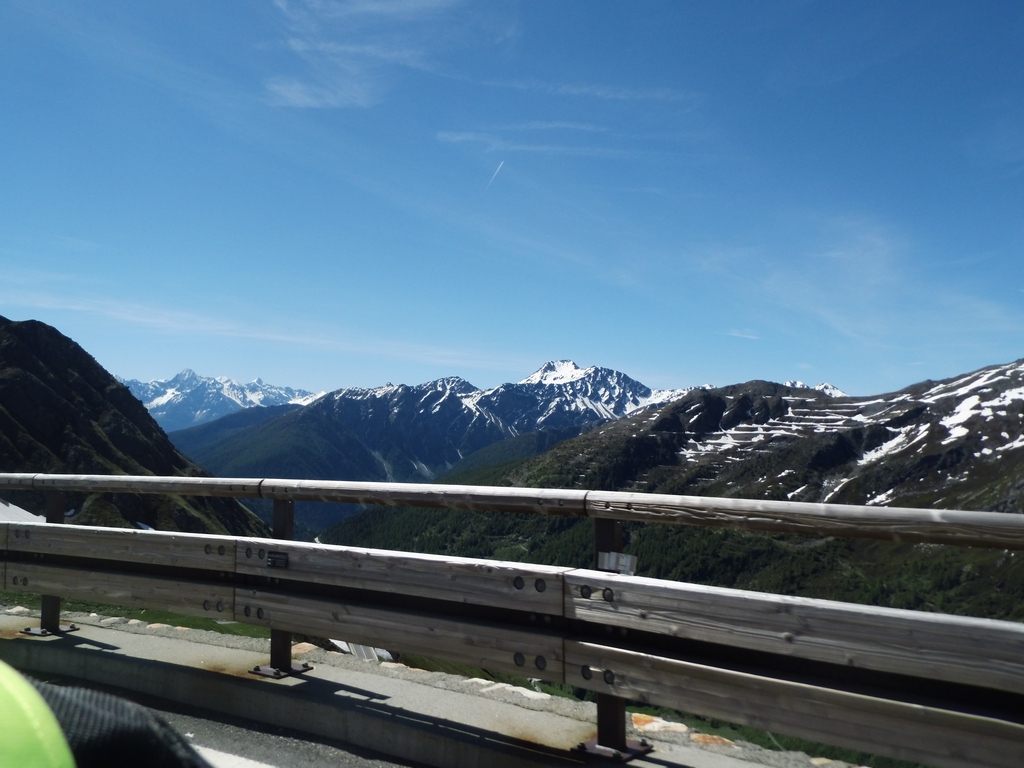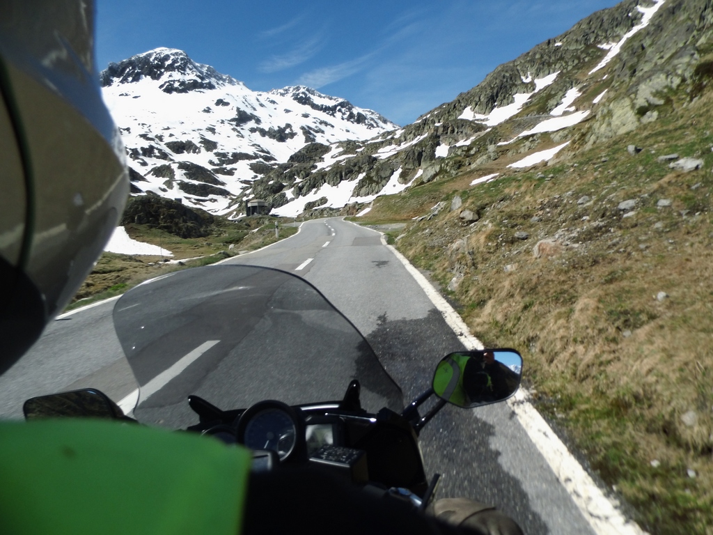 Na even zoeken komen we bij de San Bernardino pas. We hebben zaterdag de tunnel gedaan maar nu doen we de pas met de motor. Als we omhoog rijden gaan we de sneeuw en de kou tegemoet 5 graden, met alleen thermoondergoed aan en het textielpak, zonder wintervoering. Als we boven komen rijden we tussen de sneeuw door. Links en rechts van de weg ligt nog veel sneeuw. De top waar we met de motor kunnen rijden is 2066 meter. Het is echt genieten. Mels is hier al 2 keer geweest en ik een keer. Het blijft mooi. We rijden rustig verder.