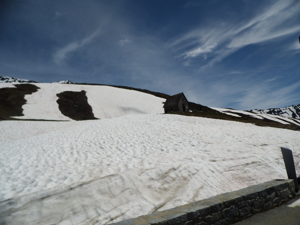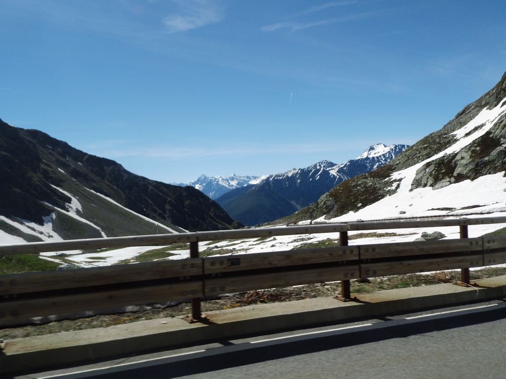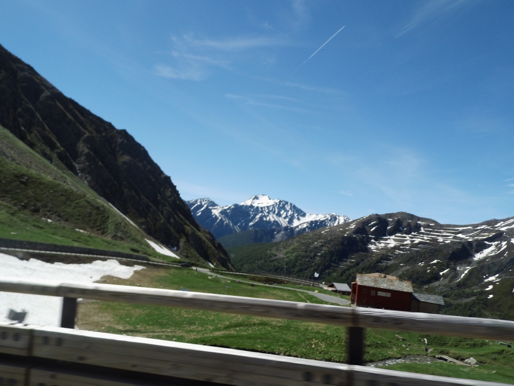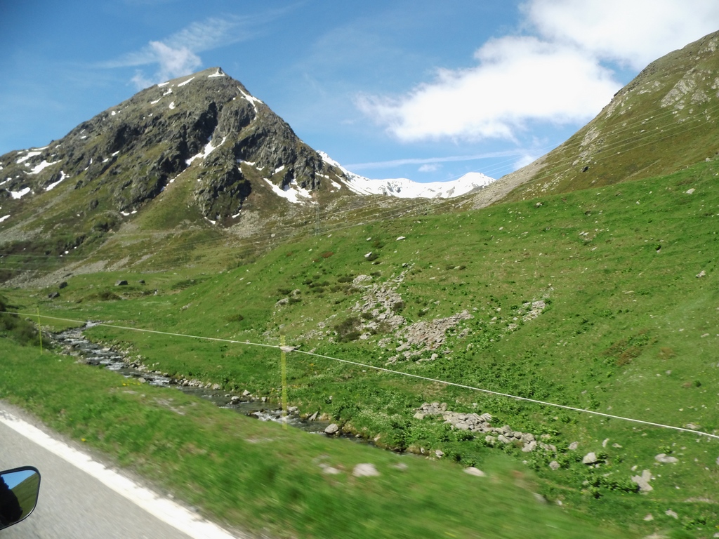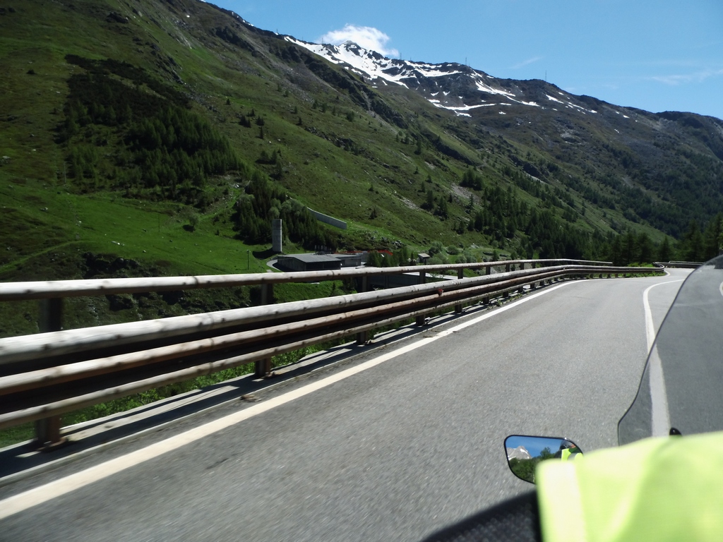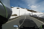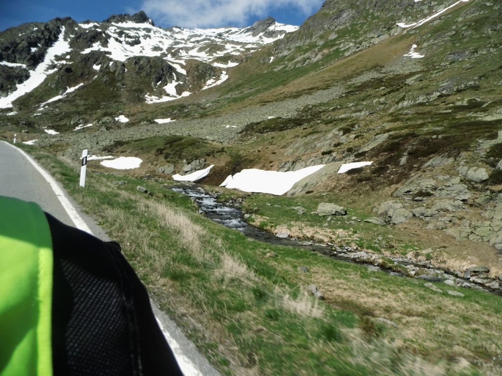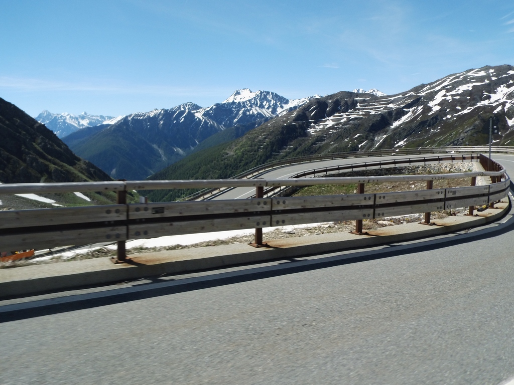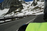 Na even zoeken komen we bij de San Bernardino pas. We hebben zaterdag de tunnel gedaan maar nu doen we de pas met de motor. Als we omhoog rijden gaan we de sneeuw en de kou tegemoet 5 graden, met alleen thermoondergoed aan en het textielpak, zonder wintervoering. Als we boven komen rijden we tussen de sneeuw door. Links en rechts van de weg ligt nog veel sneeuw. De top waar we met de motor kunnen rijden is 2066 meter. Het is echt genieten. Mels is hier al 2 keer geweest en ik een keer. Het blijft mooi. We rijden rustig verder.