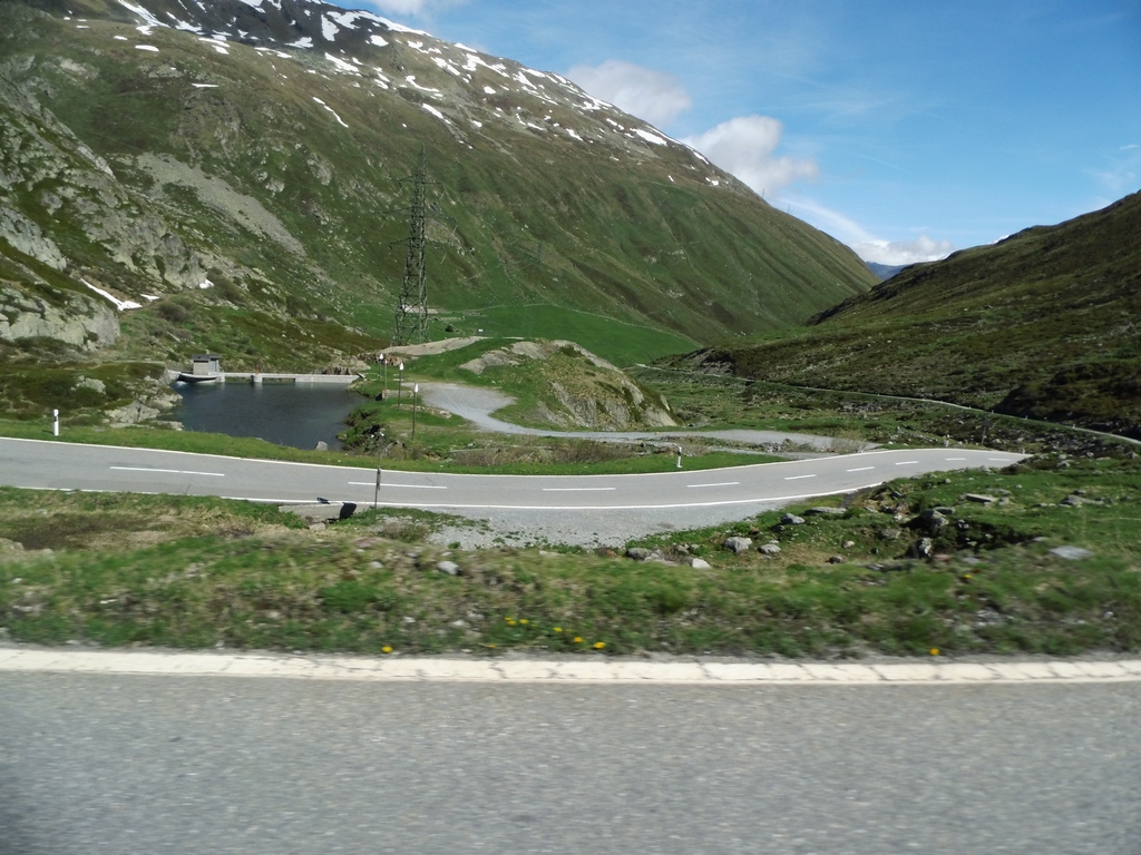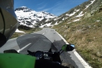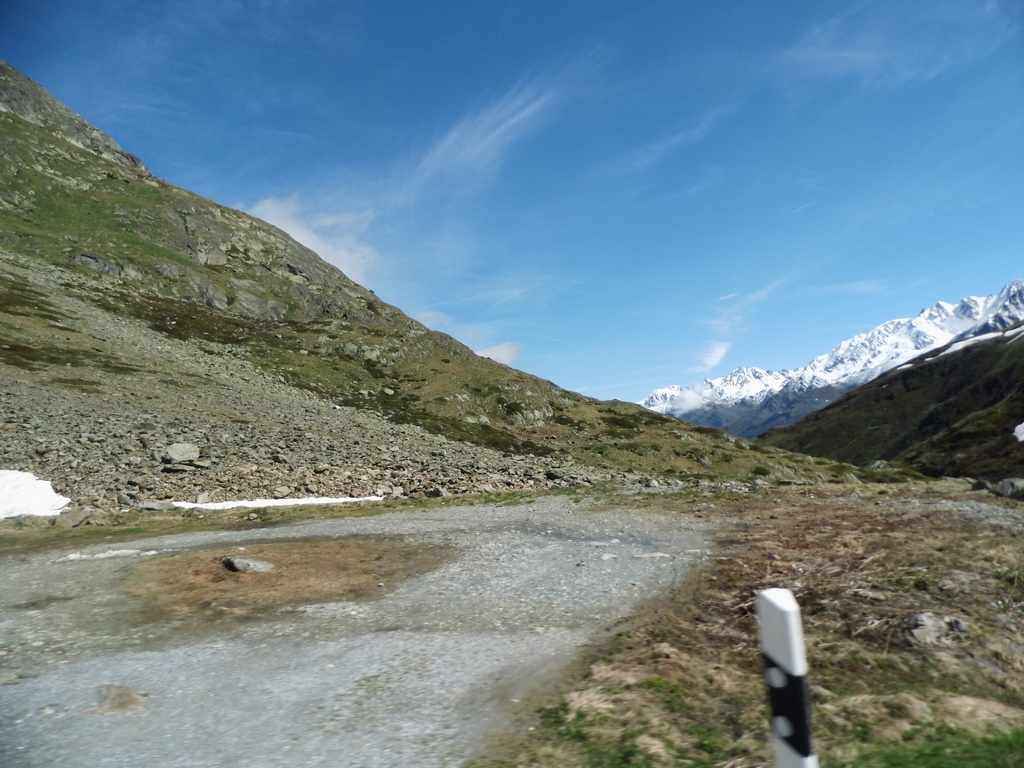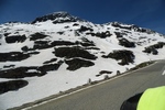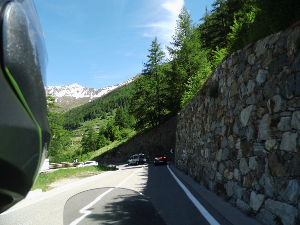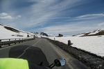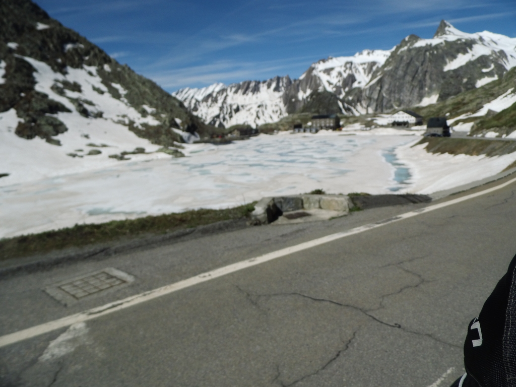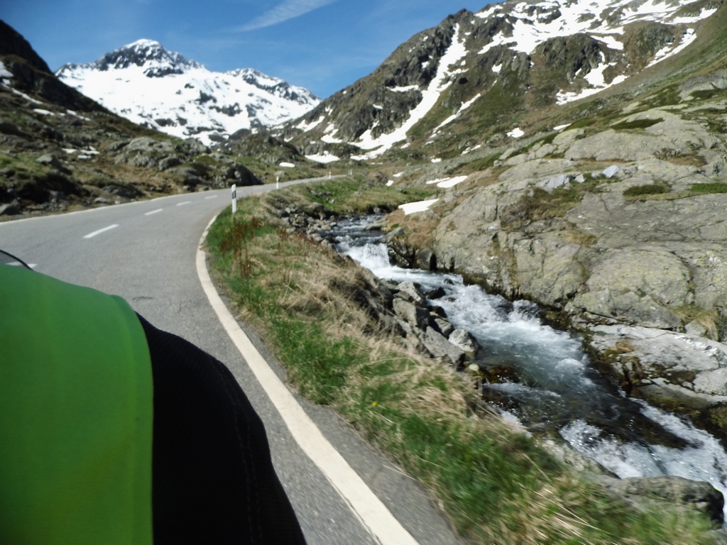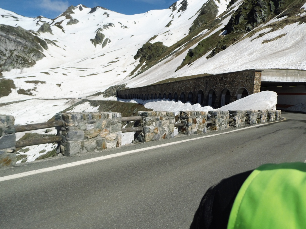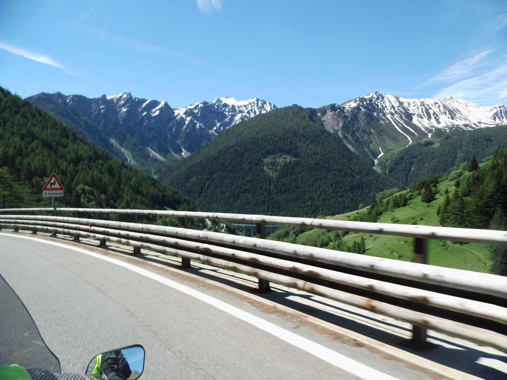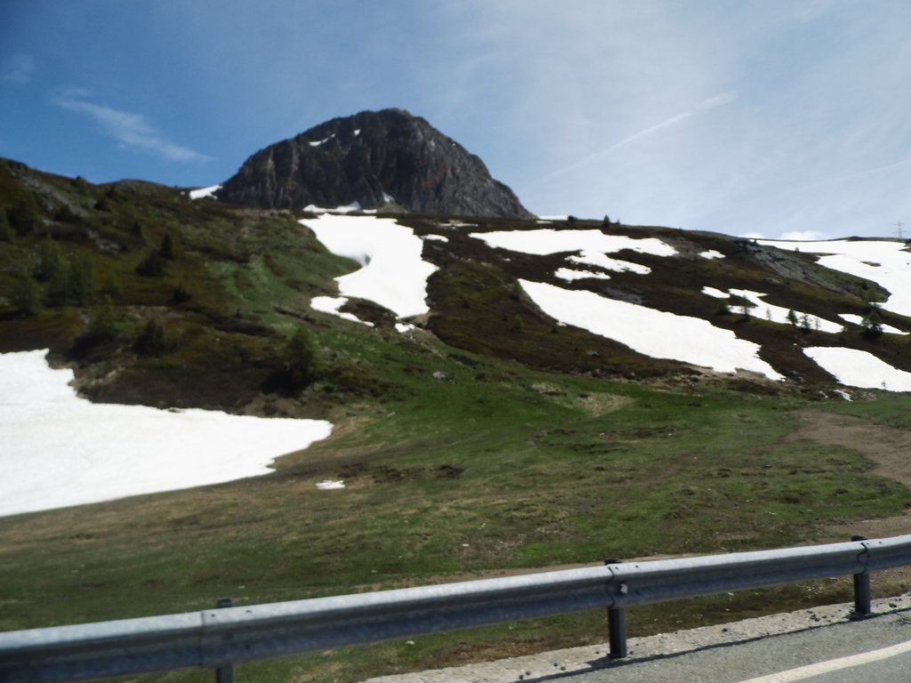 Na even zoeken komen we bij de San Bernardino pas. We hebben zaterdag de tunnel gedaan maar nu doen we de pas met de motor. Als we omhoog rijden gaan we de sneeuw en de kou tegemoet 5 graden, met alleen thermoondergoed aan en het textielpak, zonder wintervoering. Als we boven komen rijden we tussen de sneeuw door. Links en rechts van de weg ligt nog veel sneeuw. De top waar we met de motor kunnen rijden is 2066 meter. Het is echt genieten. Mels is hier al 2 keer geweest en ik een keer. Het blijft mooi. We rijden rustig verder.