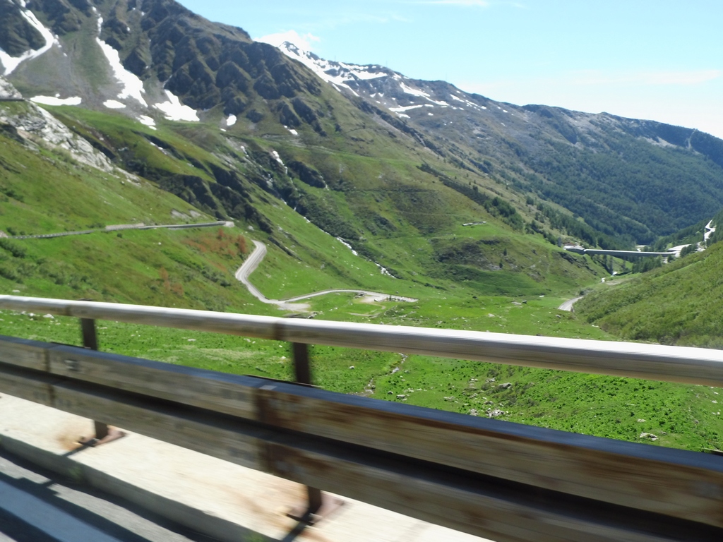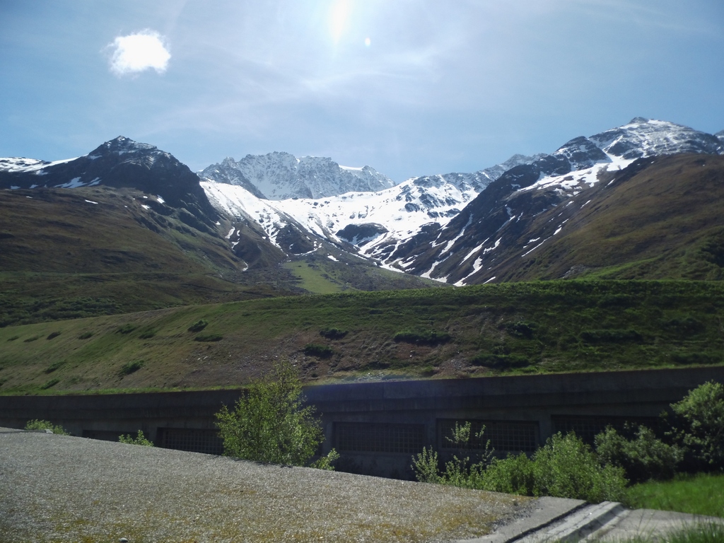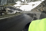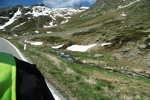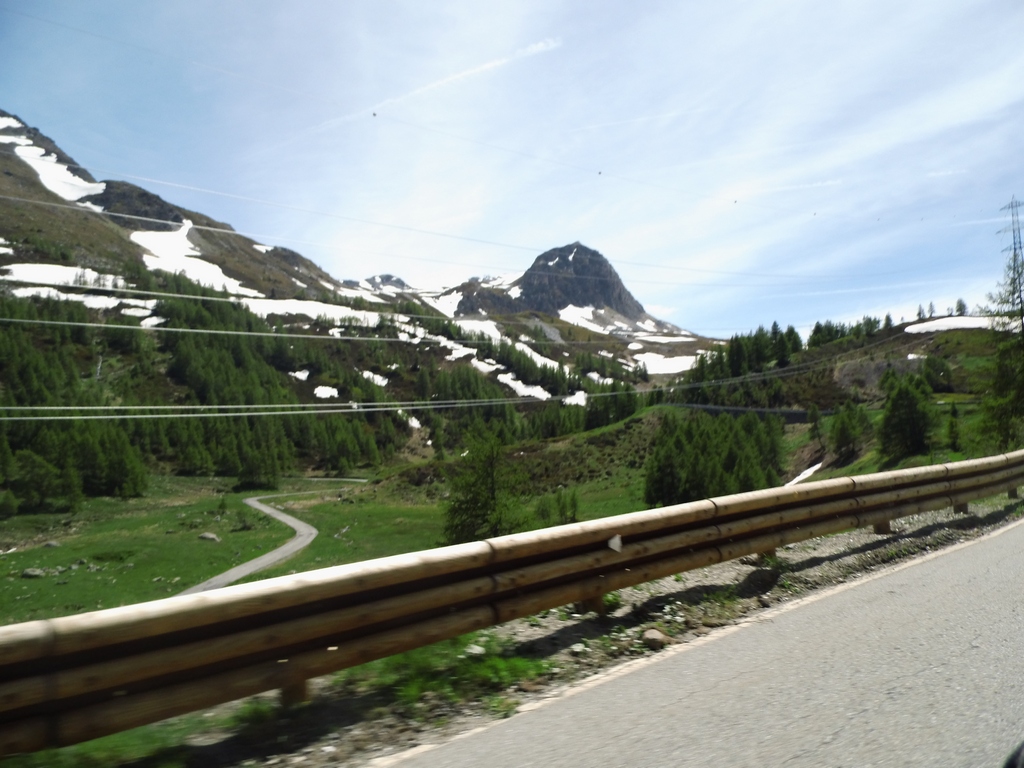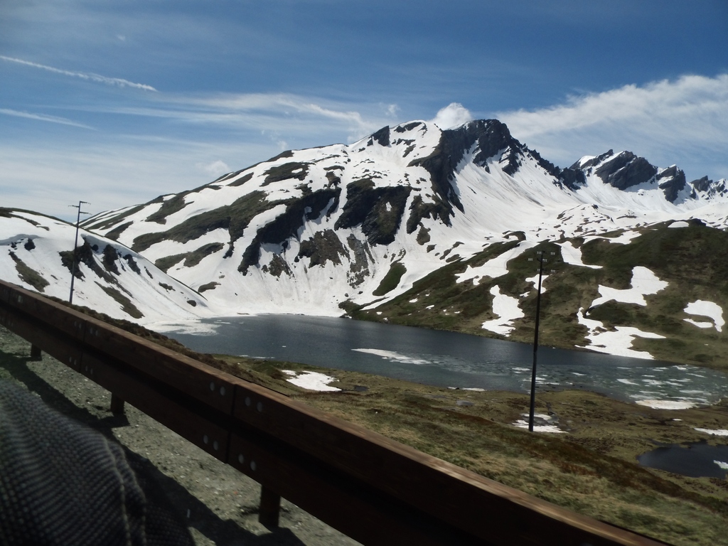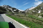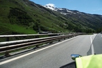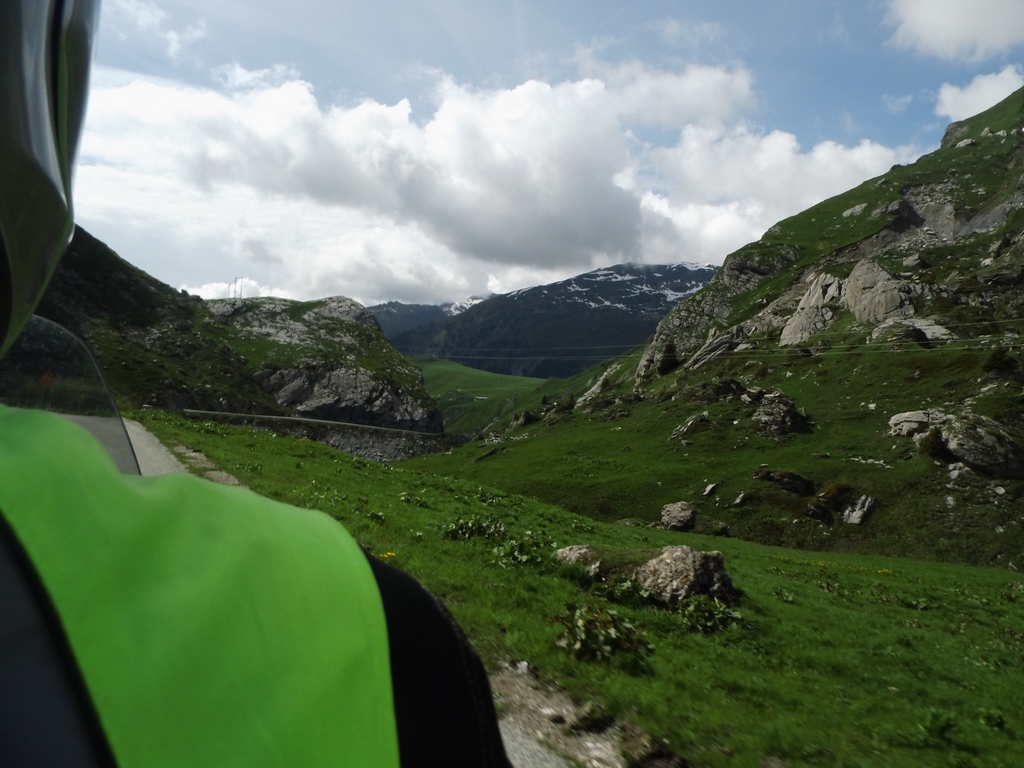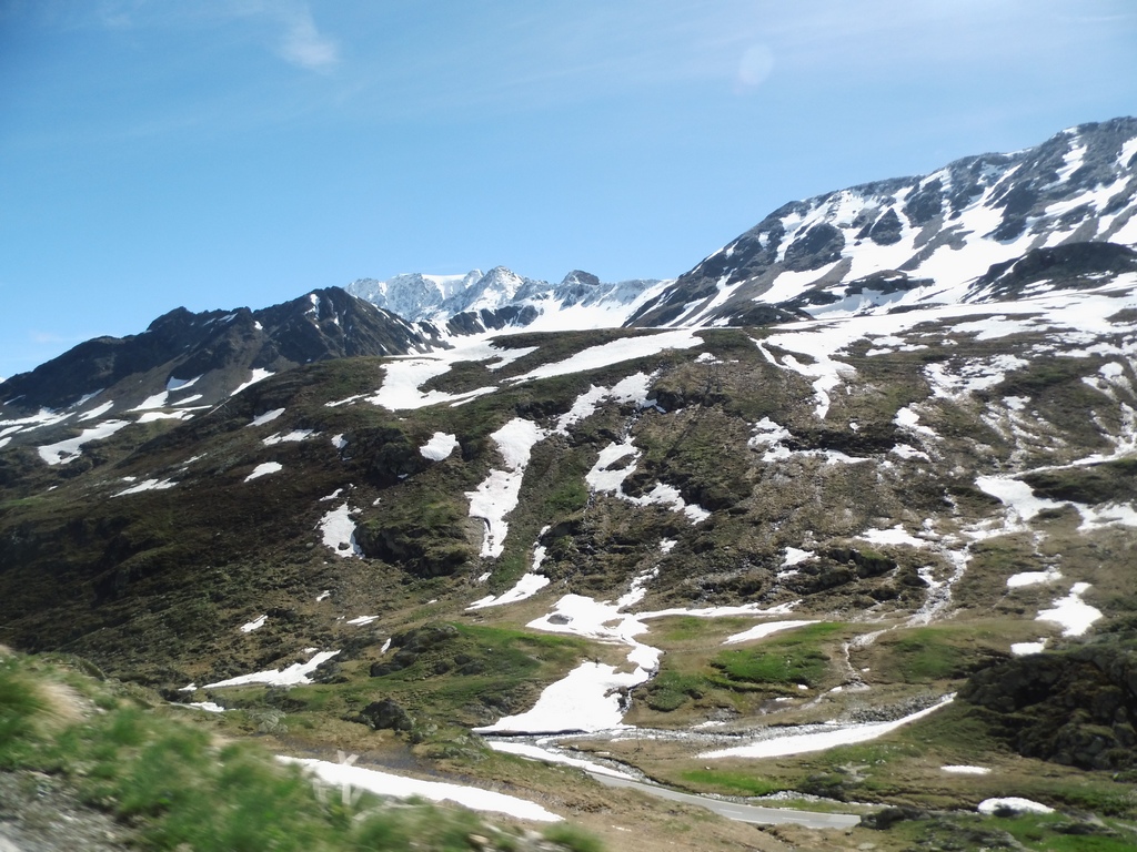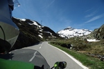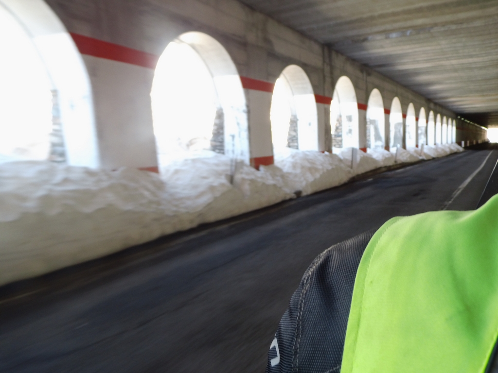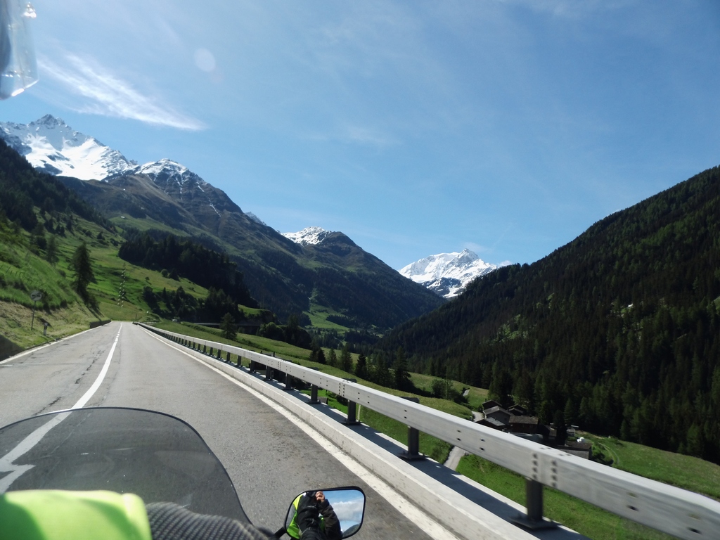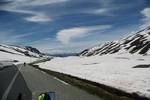 Na even zoeken komen we bij de San Bernardino pas. We hebben zaterdag de tunnel gedaan maar nu doen we de pas met de motor. Als we omhoog rijden gaan we de sneeuw en de kou tegemoet 5 graden, met alleen thermoondergoed aan en het textielpak, zonder wintervoering. Als we boven komen rijden we tussen de sneeuw door. Links en rechts van de weg ligt nog veel sneeuw. De top waar we met de motor kunnen rijden is 2066 meter. Het is echt genieten. Mels is hier al 2 keer geweest en ik een keer. Het blijft mooi. We rijden rustig verder.