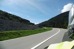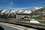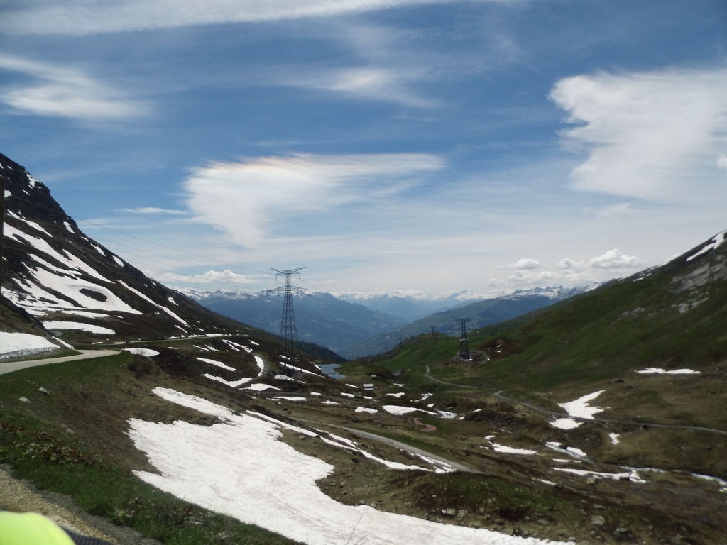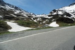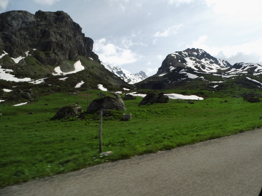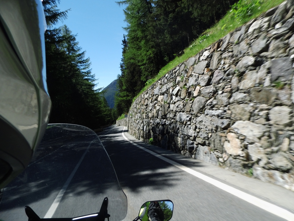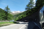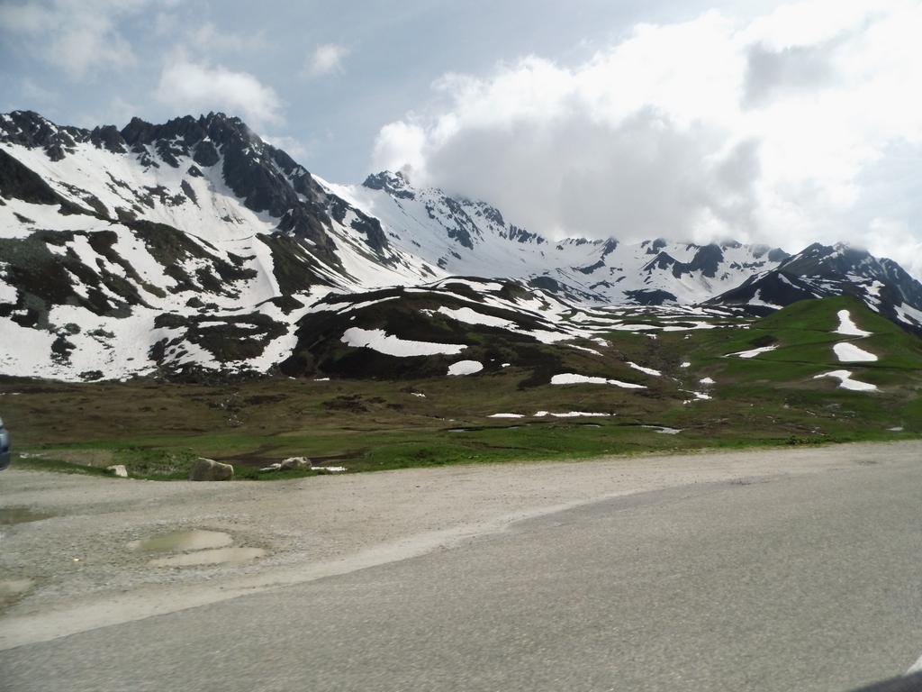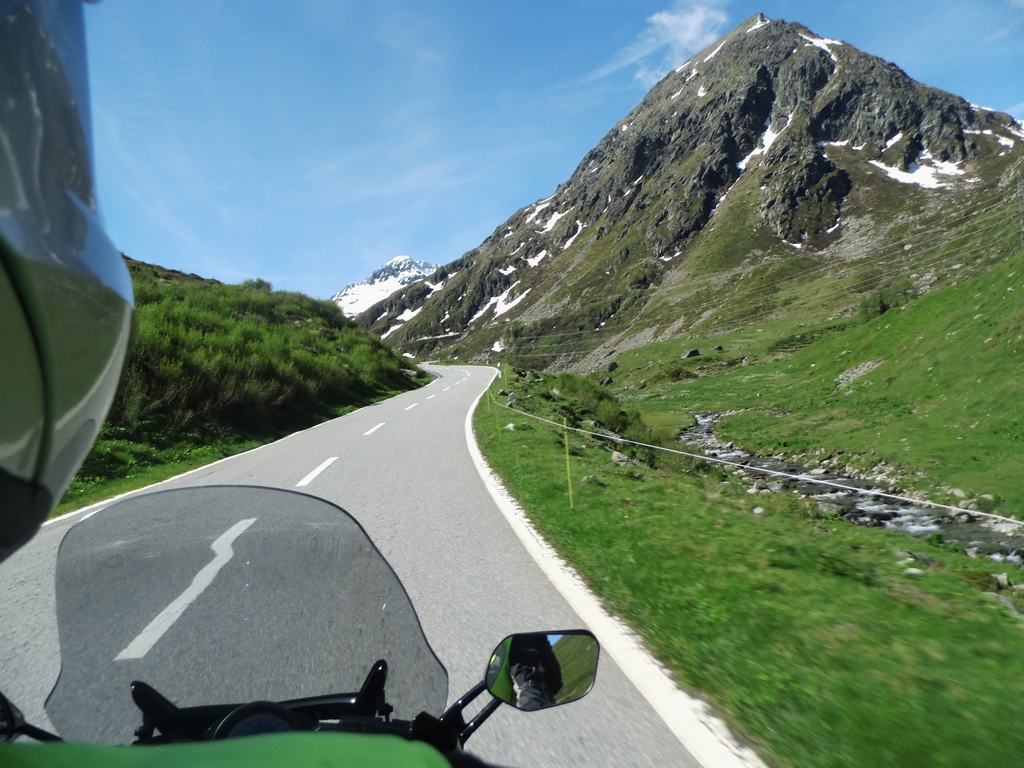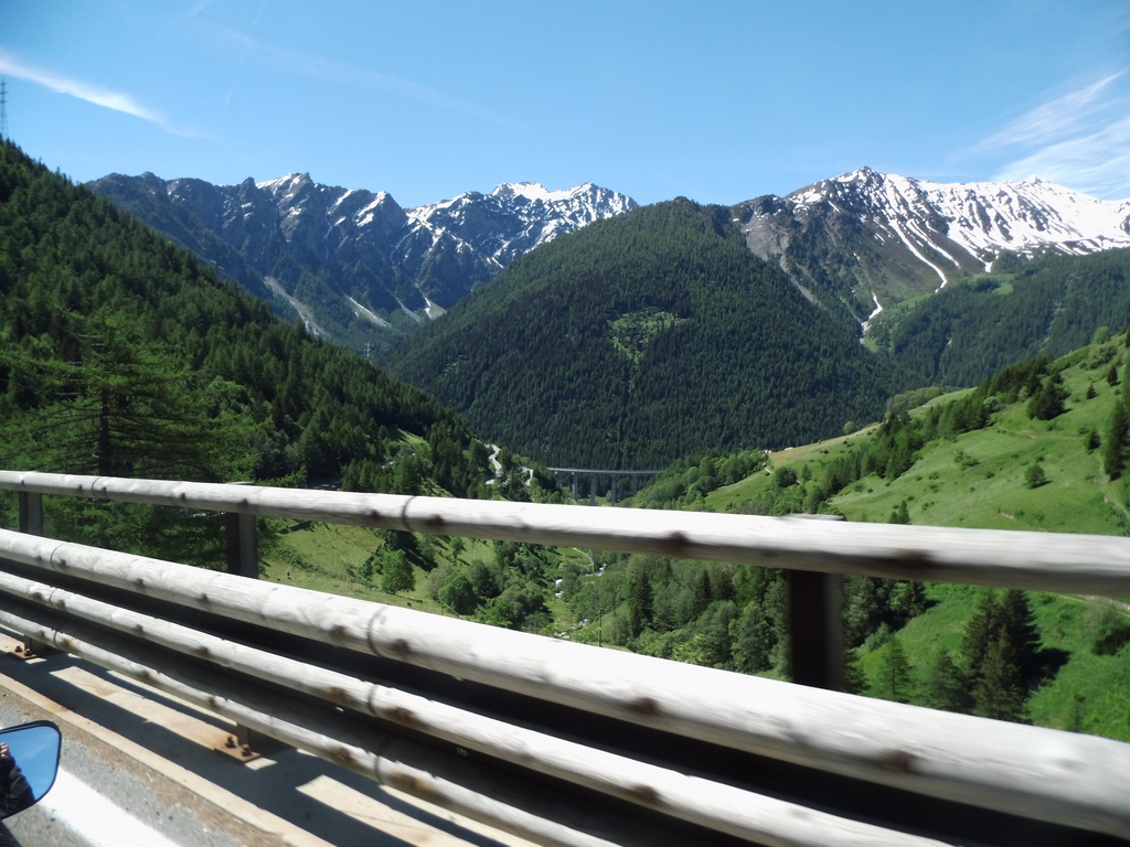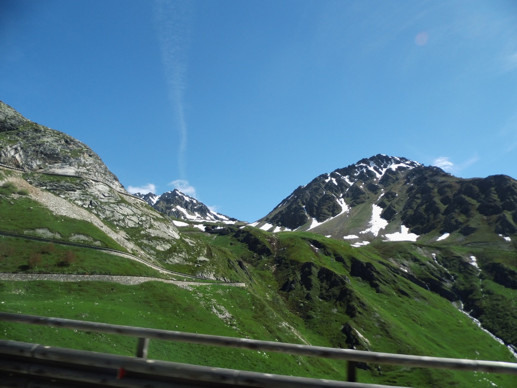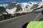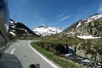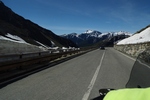 Na even zoeken komen we bij de San Bernardino pas. We hebben zaterdag de tunnel gedaan maar nu doen we de pas met de motor. Als we omhoog rijden gaan we de sneeuw en de kou tegemoet 5 graden, met alleen thermoondergoed aan en het textielpak, zonder wintervoering. Als we boven komen rijden we tussen de sneeuw door. Links en rechts van de weg ligt nog veel sneeuw. De top waar we met de motor kunnen rijden is 2066 meter. Het is echt genieten. Mels is hier al 2 keer geweest en ik een keer. Het blijft mooi. We rijden rustig verder.