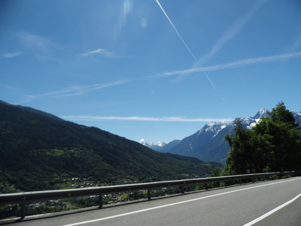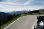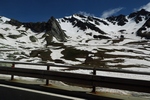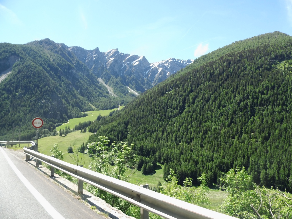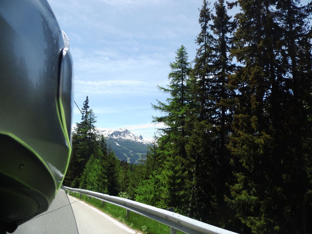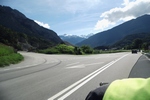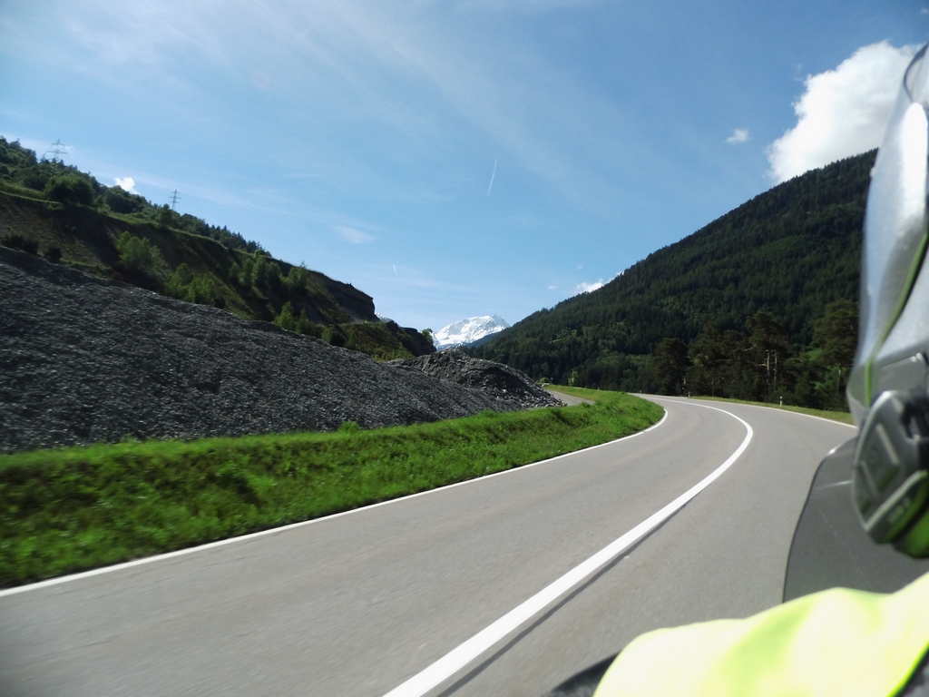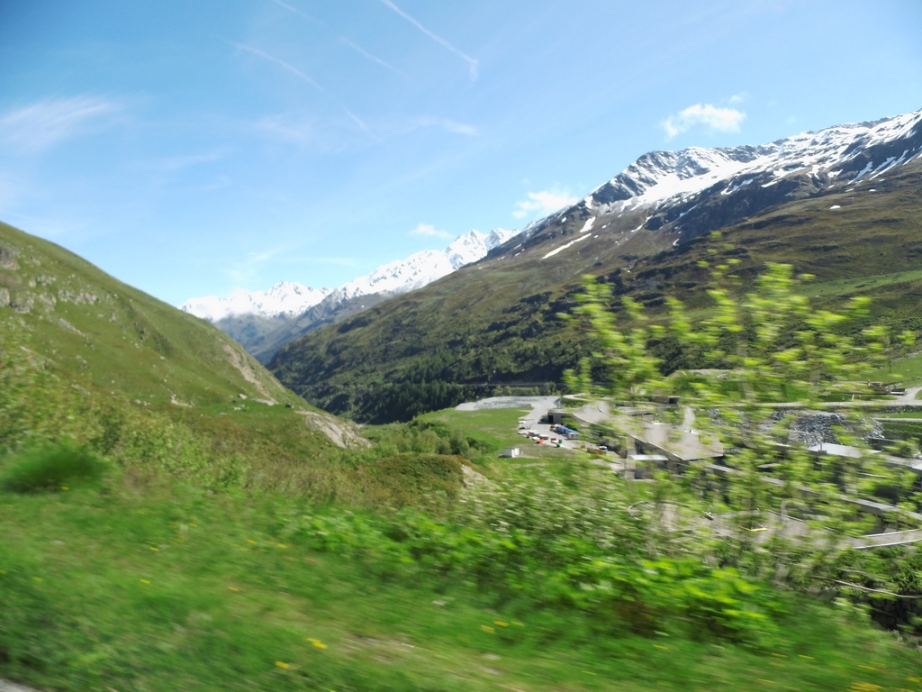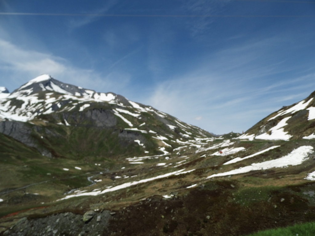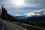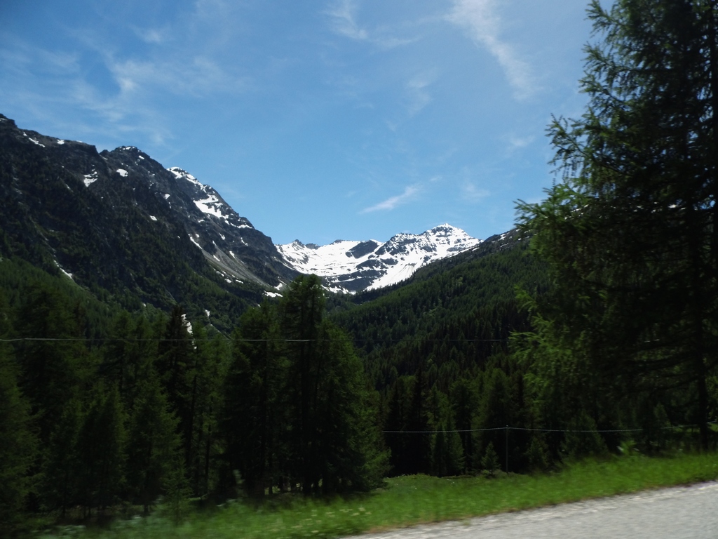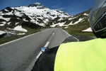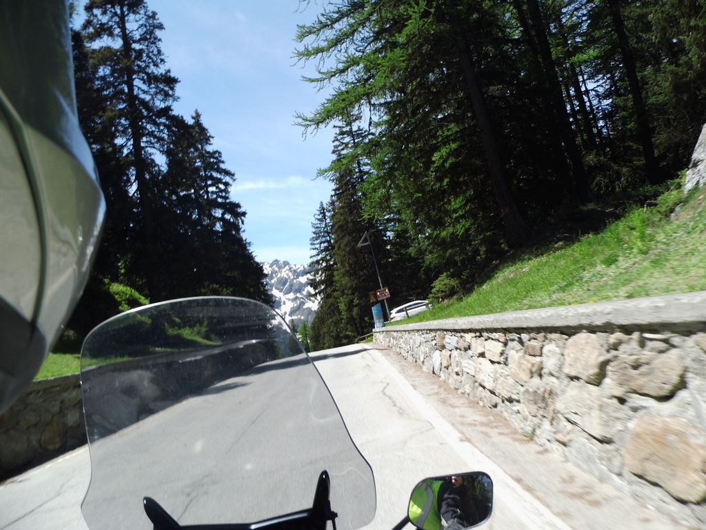 Na even zoeken komen we bij de San Bernardino pas. We hebben zaterdag de tunnel gedaan maar nu doen we de pas met de motor. Als we omhoog rijden gaan we de sneeuw en de kou tegemoet 5 graden, met alleen thermoondergoed aan en het textielpak, zonder wintervoering. Als we boven komen rijden we tussen de sneeuw door. Links en rechts van de weg ligt nog veel sneeuw. De top waar we met de motor kunnen rijden is 2066 meter. Het is echt genieten. Mels is hier al 2 keer geweest en ik een keer. Het blijft mooi. We rijden rustig verder.