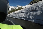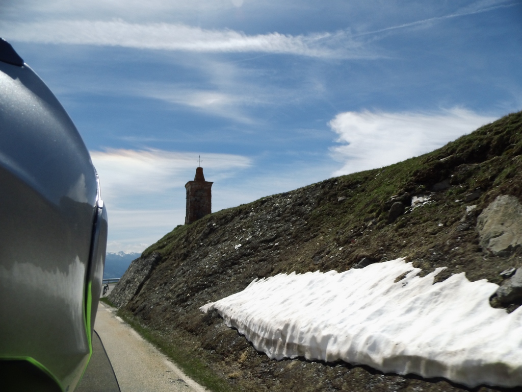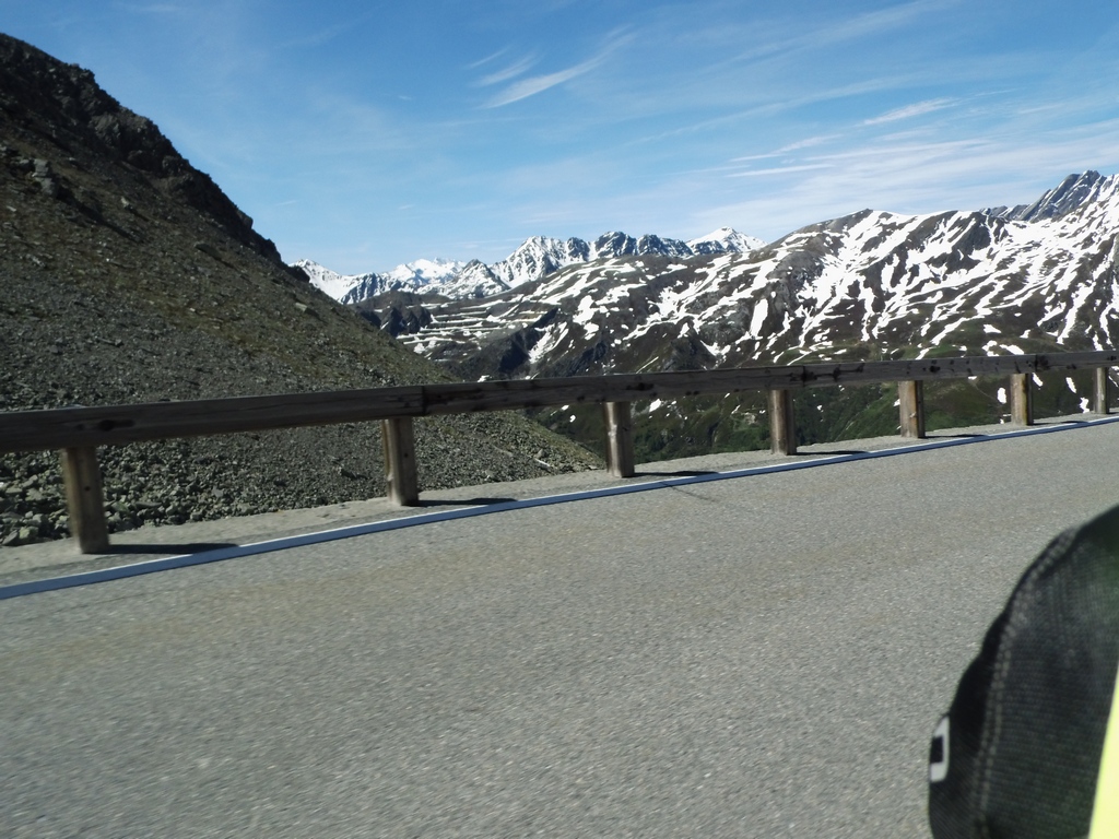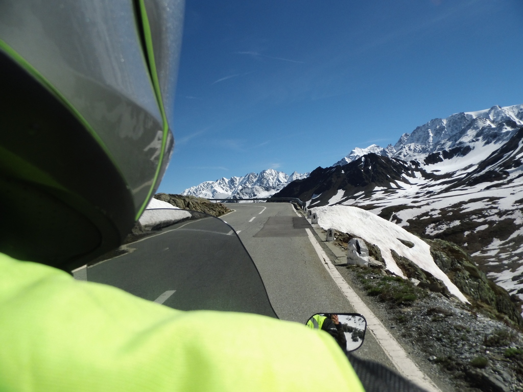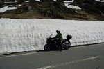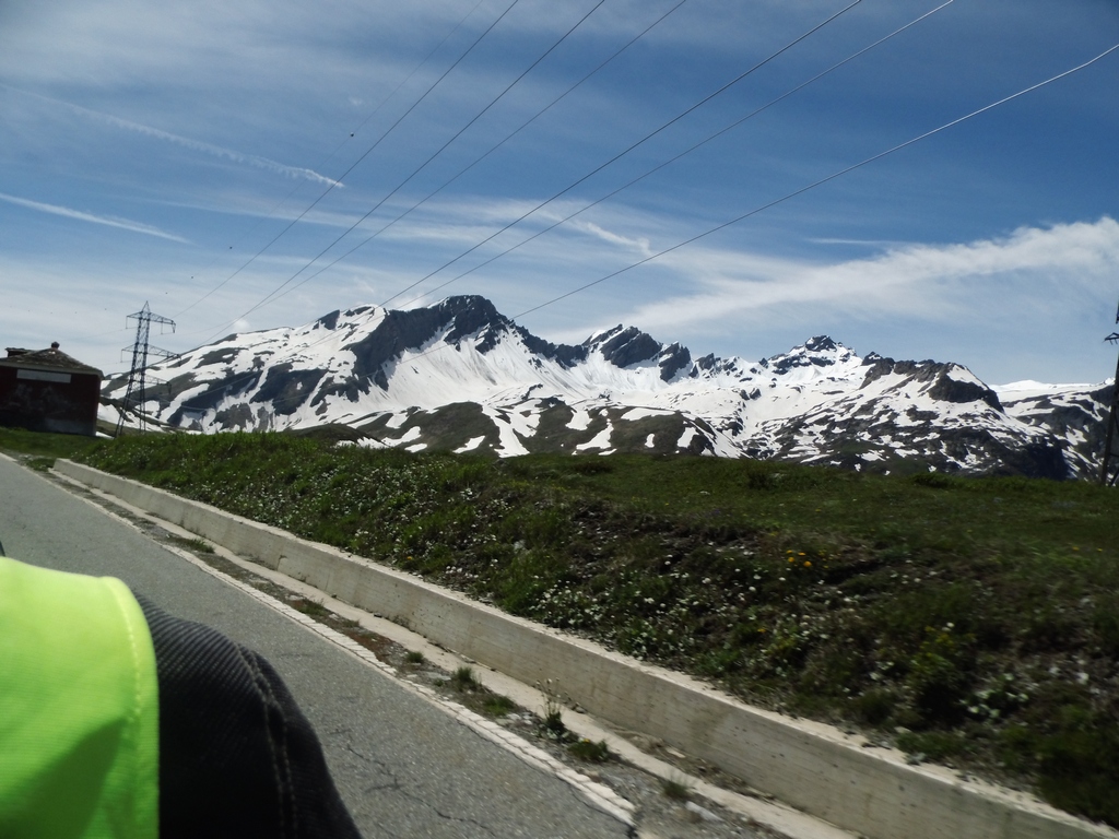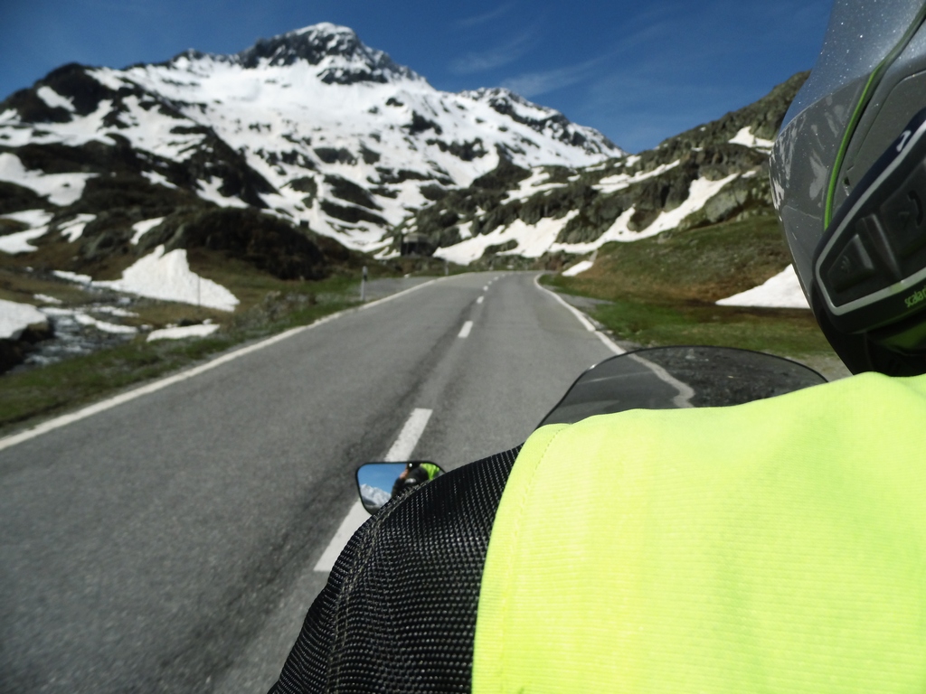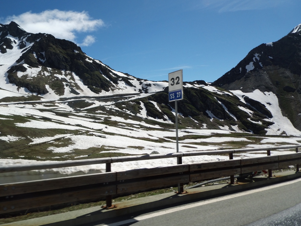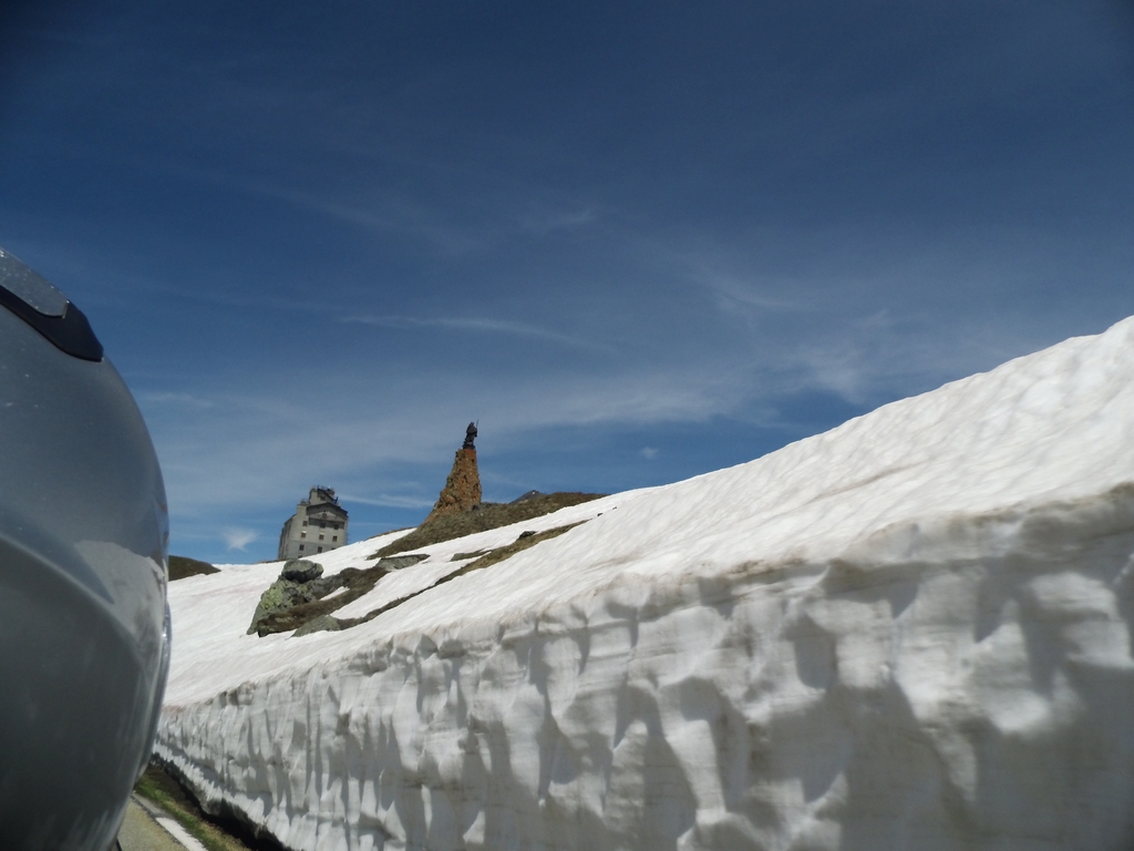 Echt genieten zegt Mels. Met deze motor hoeft hij niet meer hard te rijden maar is het genieten. We rijden van pas tot pas. Dan komen we bij de piccollo San Bernardino. Als we deze oprijden is het uitzicht nog mooier als bij de grote San Bernardino pas. We komen hier tot een hoofgte van 2188 meter. Even in de sneeuw staan. En ja hoor, een mok en magneetje mogen niet ontbreken.