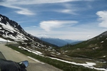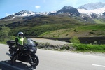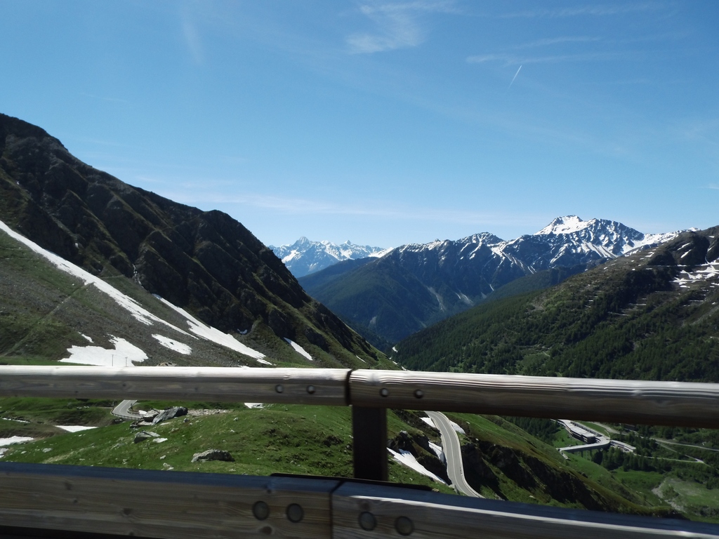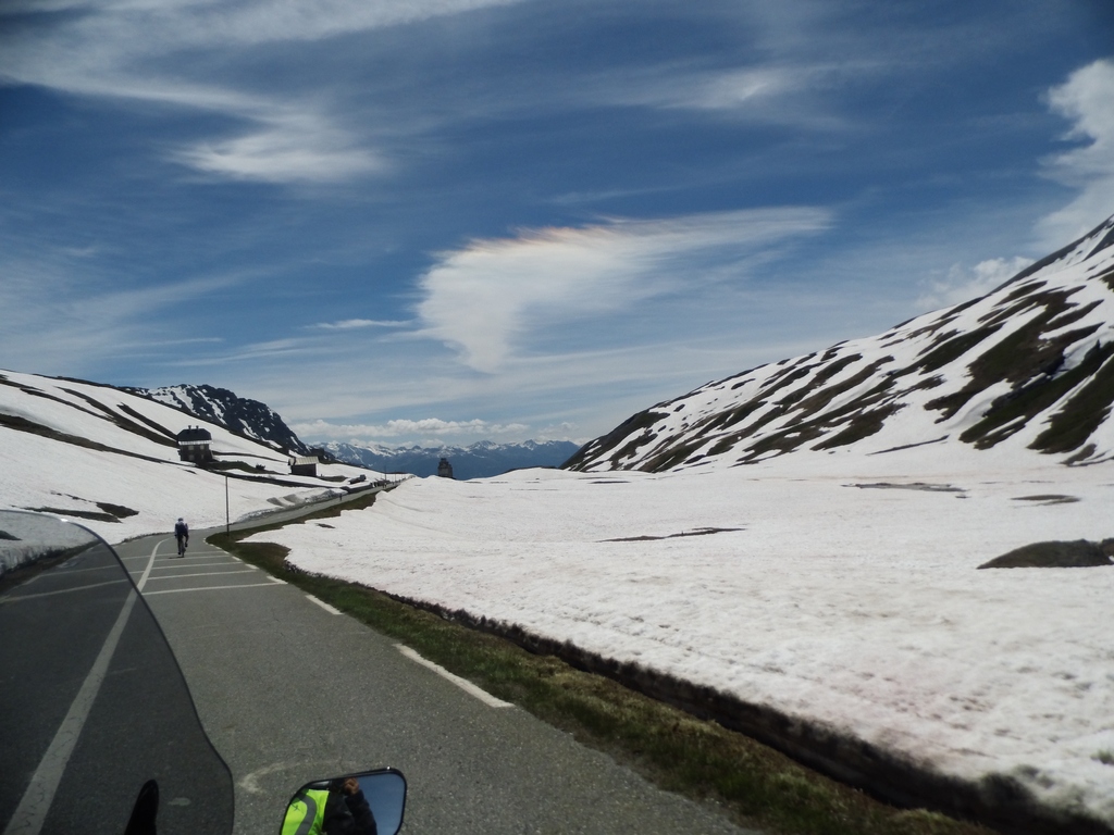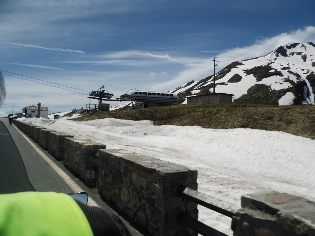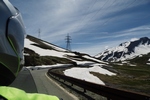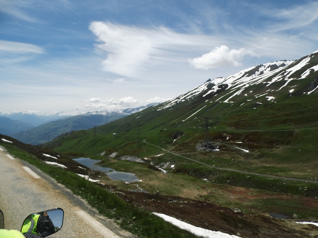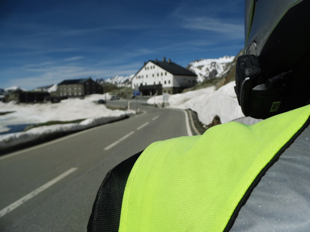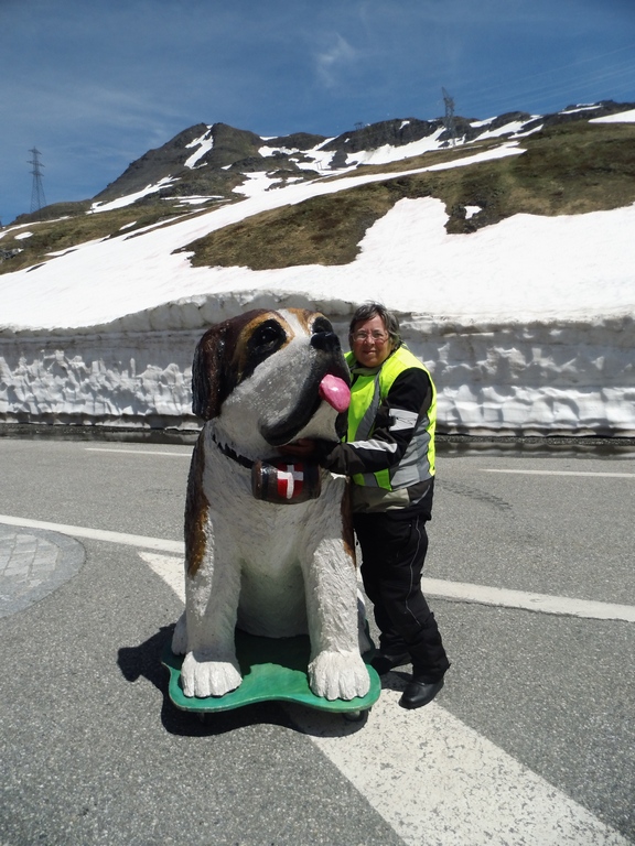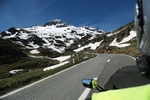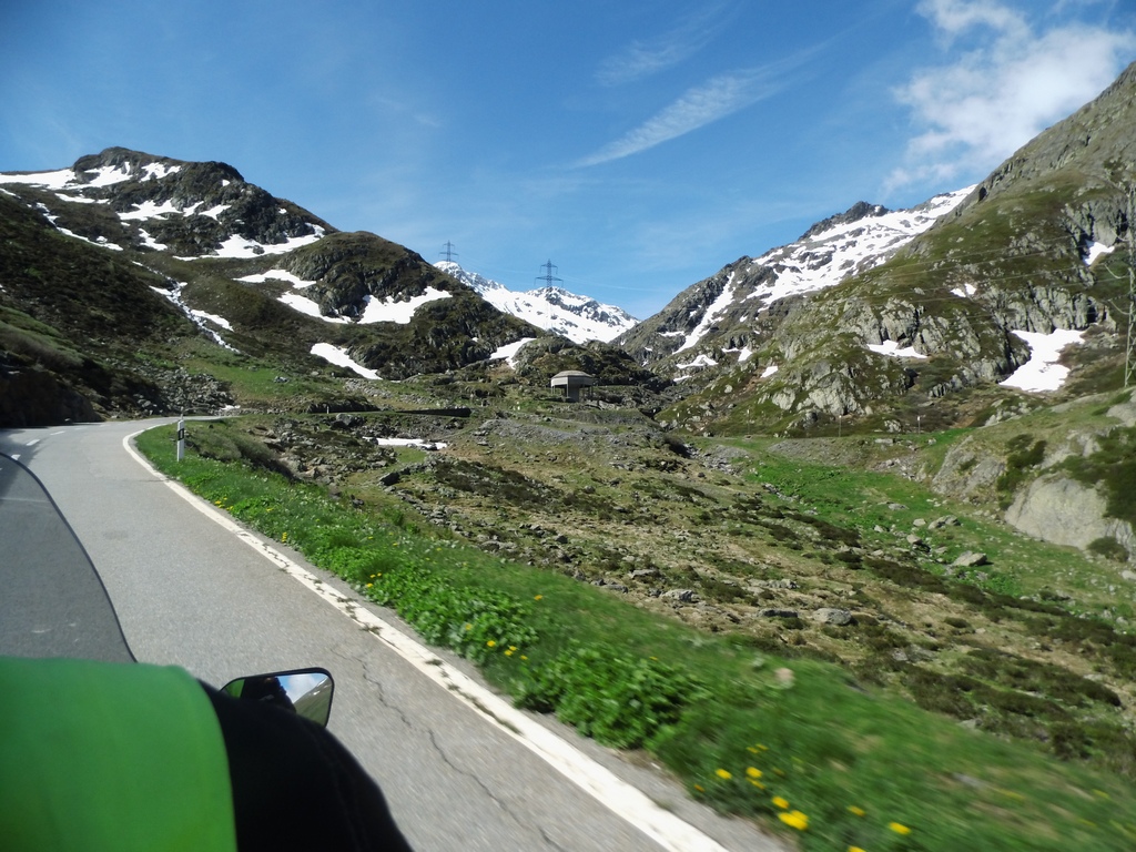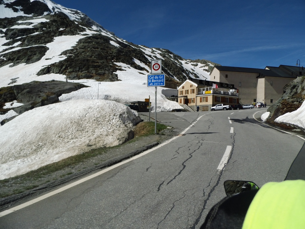 Echt genieten zegt Mels. Met deze motor hoeft hij niet meer hard te rijden maar is het genieten. We rijden van pas tot pas. Dan komen we bij de piccollo San Bernardino. Als we deze oprijden is het uitzicht nog mooier als bij de grote San Bernardino pas. We komen hier tot een hoofgte van 2188 meter. Even in de sneeuw staan. En ja hoor, een mok en magneetje mogen niet ontbreken.