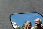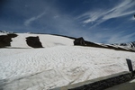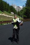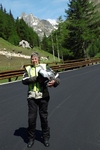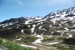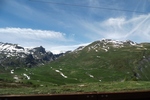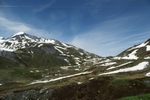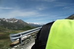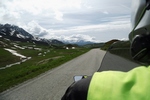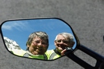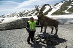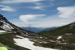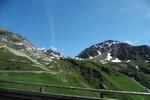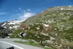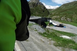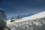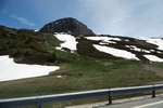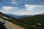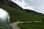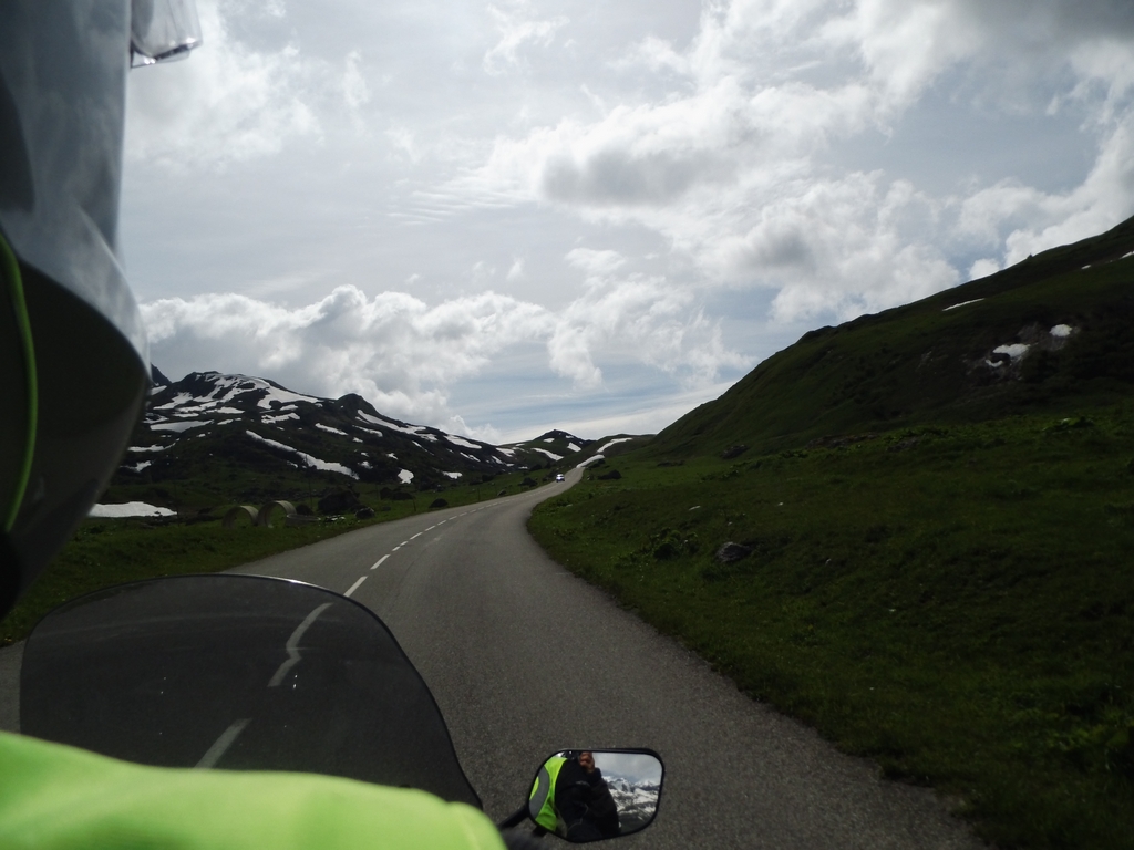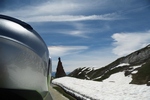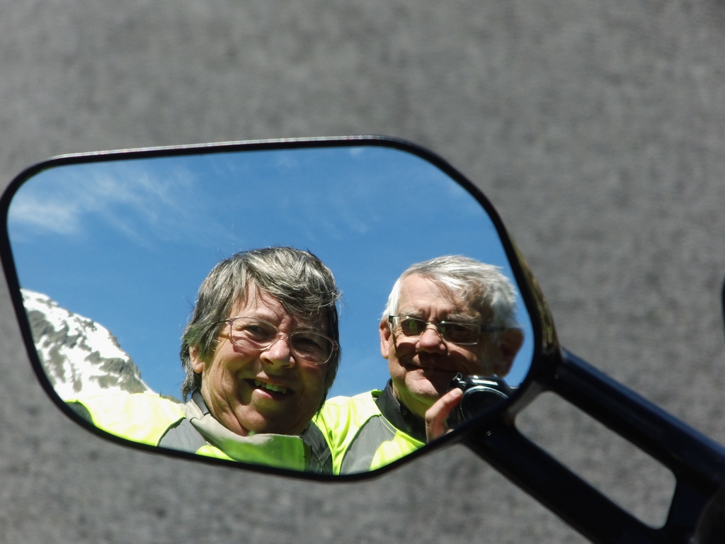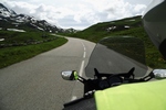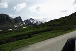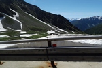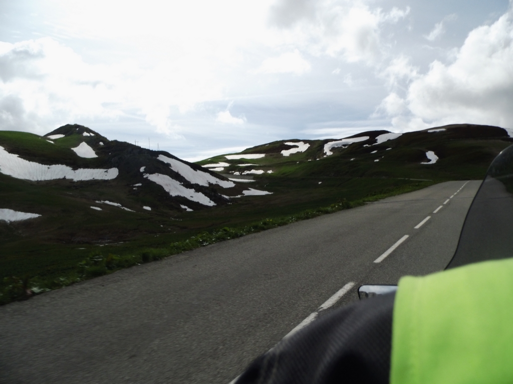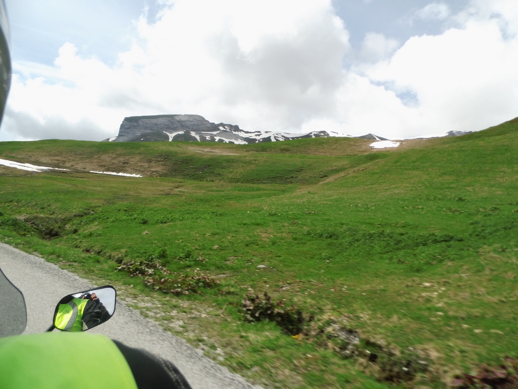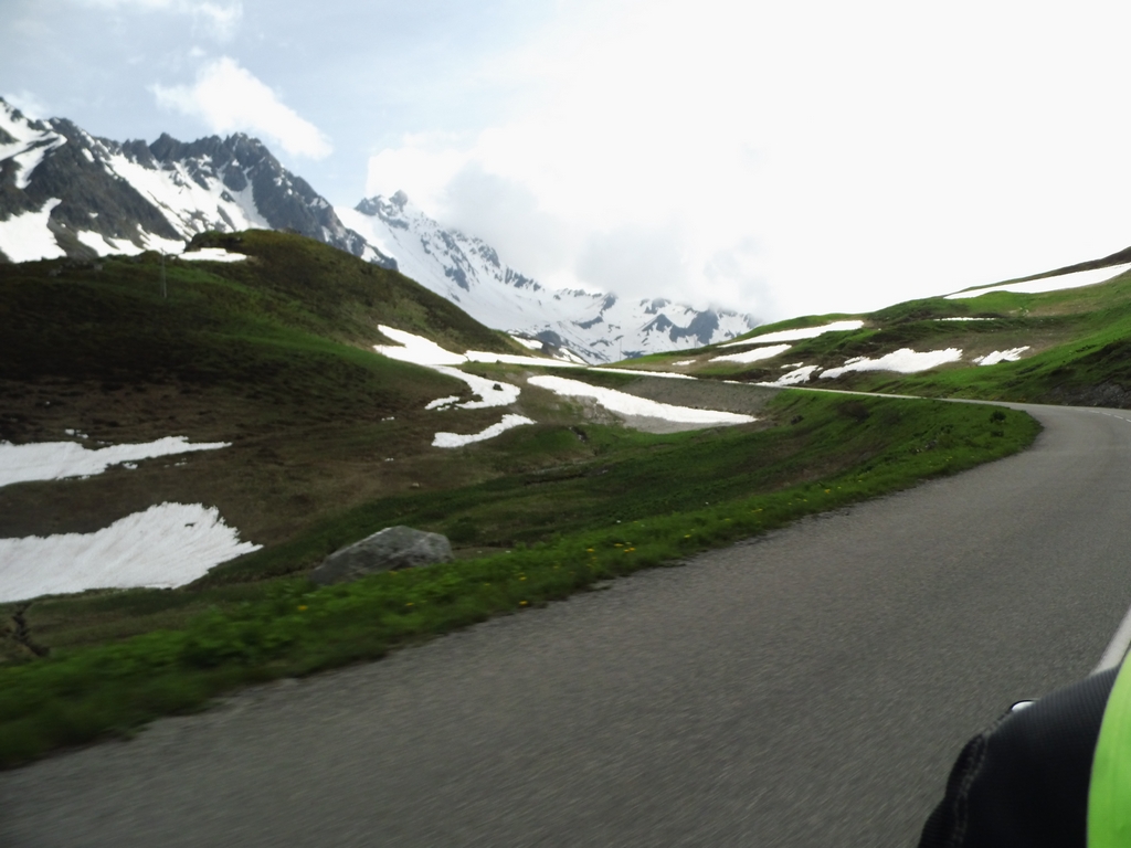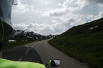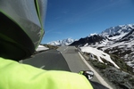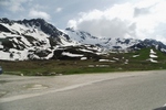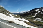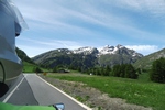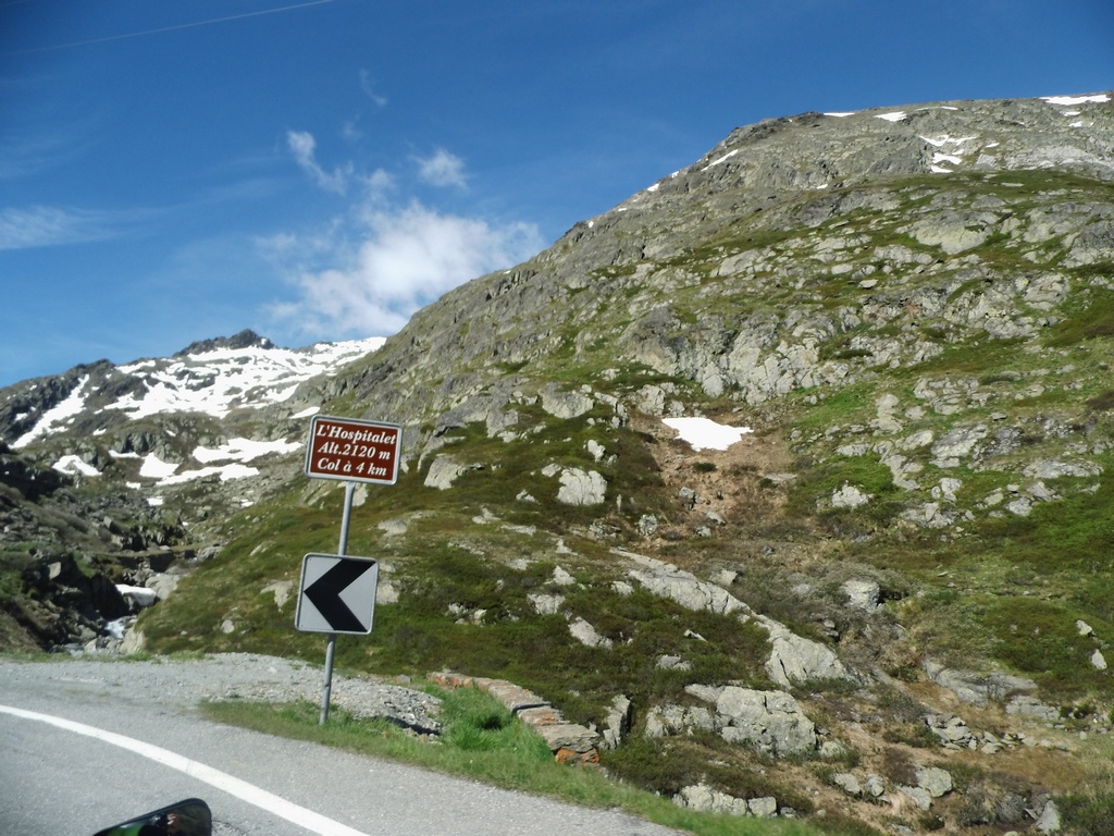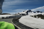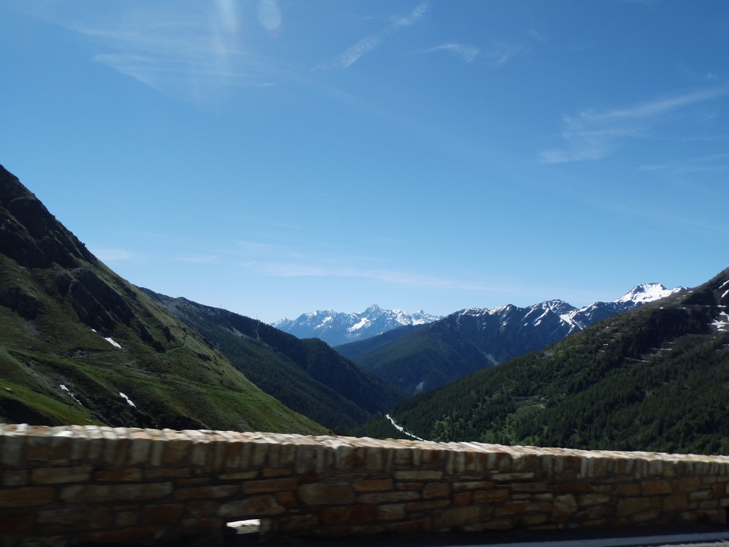 Echt genieten zegt Mels. Met deze motor hoeft hij niet meer hard te rijden maar is het genieten. We rijden van pas tot pas. Dan komen we bij de piccollo San Bernardino. Als we deze oprijden is het uitzicht nog mooier als bij de grote San Bernardino pas. We komen hier tot een hoofgte van 2188 meter. Even in de sneeuw staan. En ja hoor, een mok en magneetje mogen niet ontbreken.