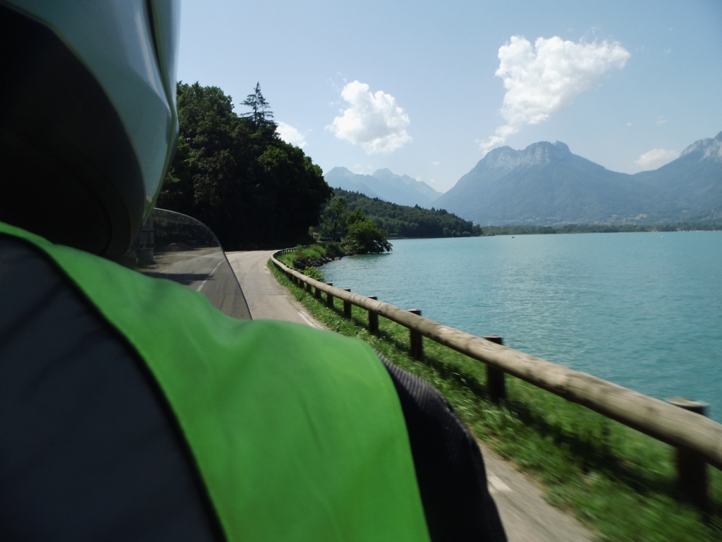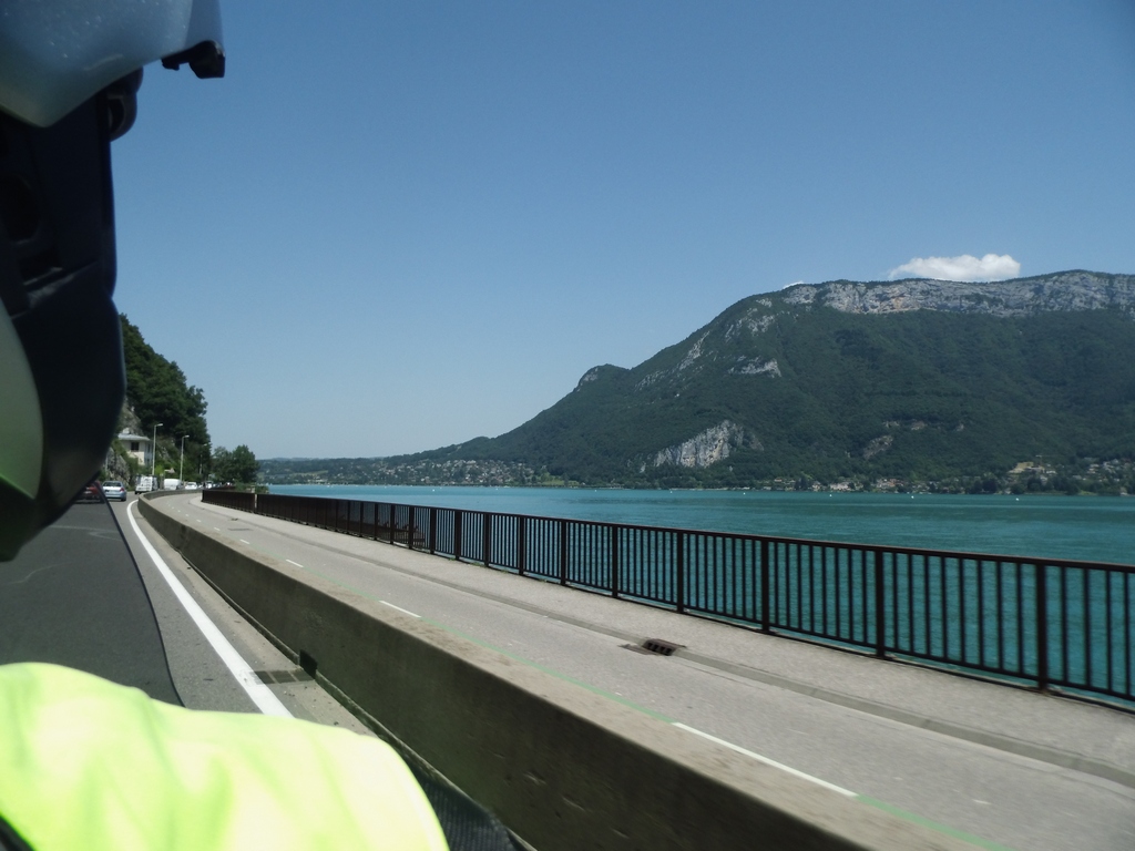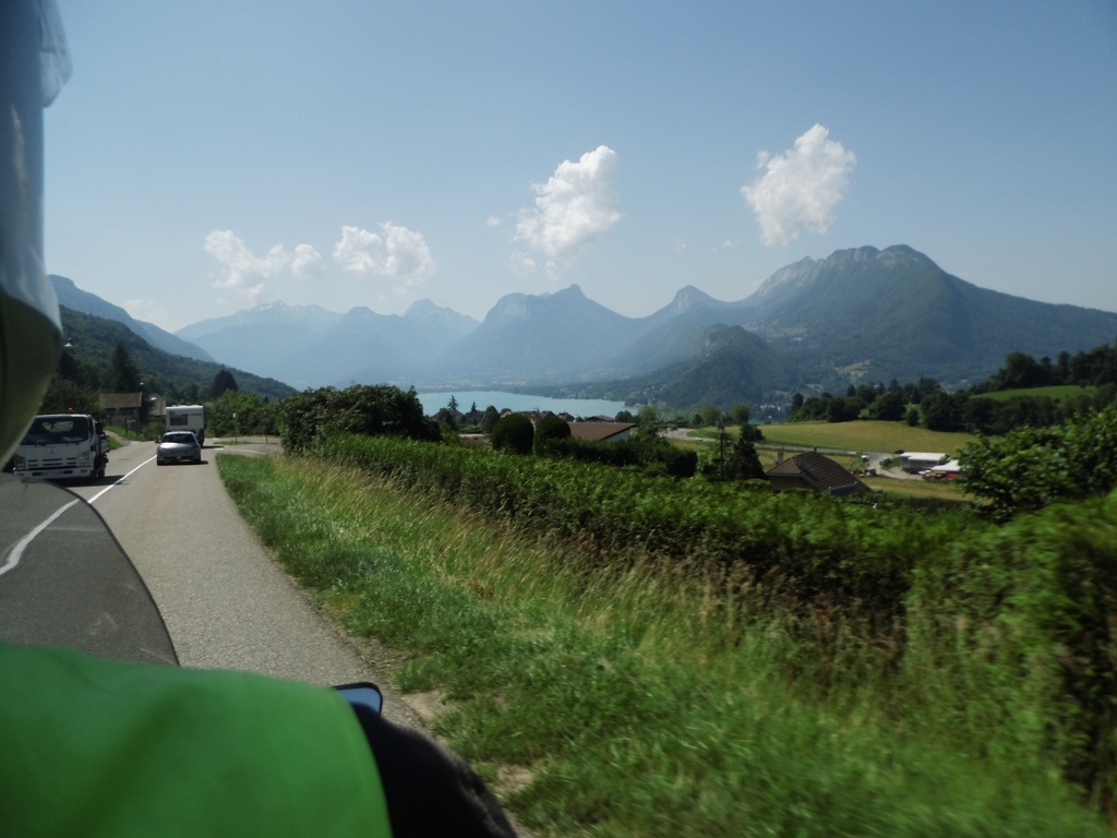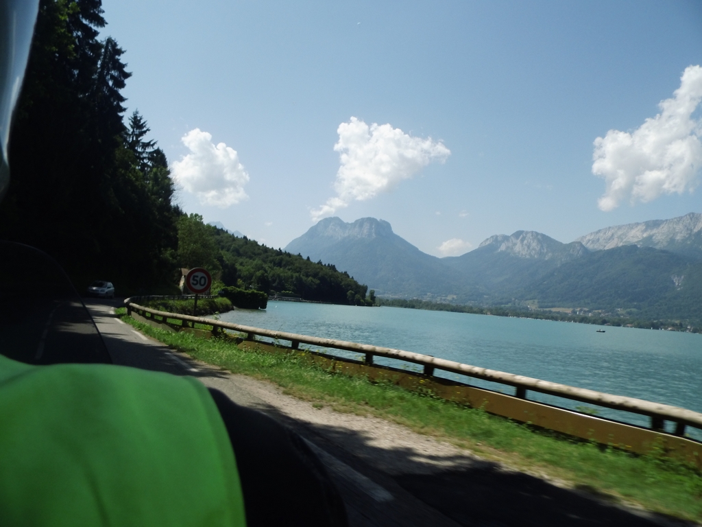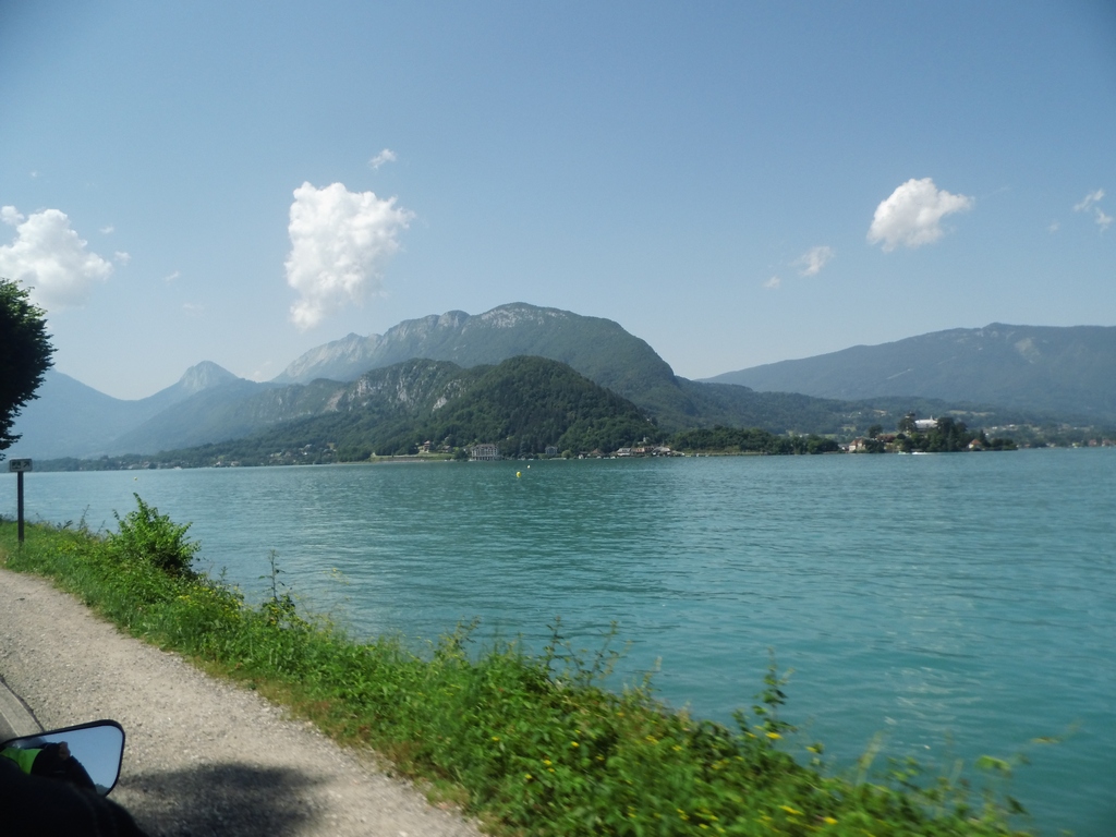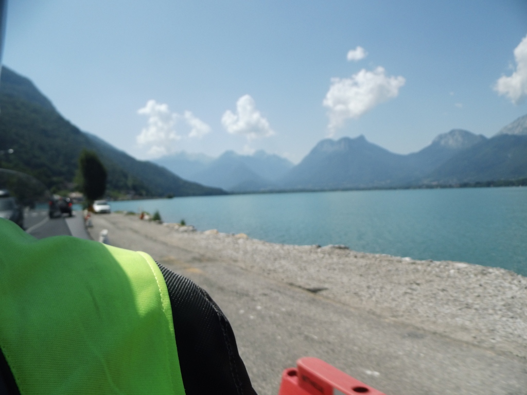 We gaan vandaag naar het meer van Annassy. Via binnen door weggetjes komen we bij het meer aan. Onderweg zien we dat hier de tour fe France door plaatsjes komt. Het zonnetjes schijnt. Het is een mooie dag. Blauwe lucht. Prachtig meer. De omgeving is ook heel mooi. Je rijdt zo langs het water. Als je de motor ergens zou parkeren kan men direct het water inlopen. Nergens geen hekken of poortjes. Iedereen kan zo gaan zwemmen. We rijden de bergen weer in en nemen nog enkele cols. Dan geeft Mels aan dat we moeten gaan tanken. We besluiten om een col niet te nemen en naar de stad Annassy te rijden en daar een tankstation te zoeken. Nadat we getankt hebben nog even pauze nemen. Iets drinken en appeltje eten. Het is warm. 33 graden. Niet lekker om stil te staan in de stad. We besluiten om terug naar het hotel te rijden.
