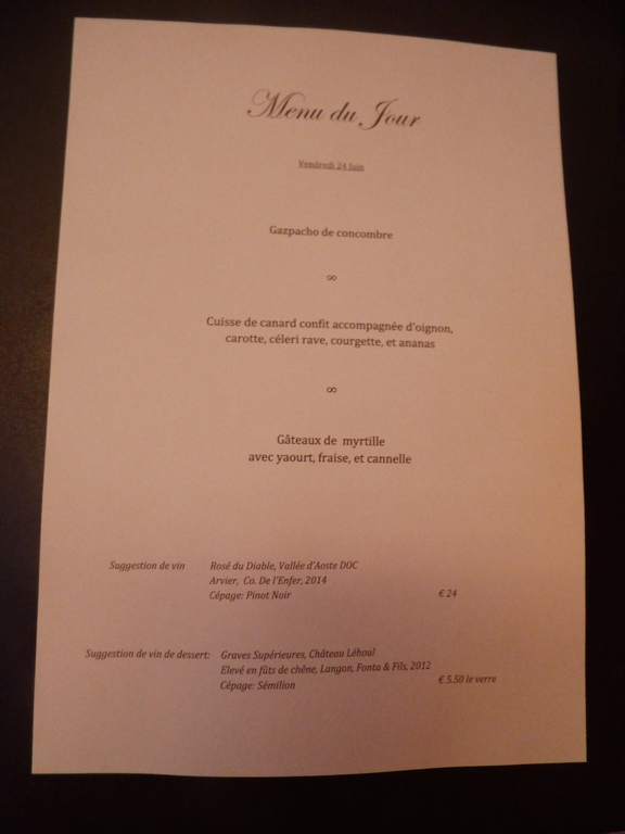 Het is dan snel zes uur. Eten. We krijgen eerst weer een amuse (tomaten salsa en komkommersalde) dan koude komkommersoep, eendenpoot met aardappelen en groenten, en als toetje een bosbessentaartje met een gedroogde tomatenschil en enkele aardbeiën. Om 20:00 uur kijken we nog even het nieuws van Nederland. We kijken nog even tv maar Toos vallen de ogen dicht. We besluiten om maar naar boven te gaan. Eerst even de rekening betalen en een praatje met Marieke gemaakt. We besluiten om nog een rondje rondom het hotel te maken.