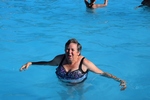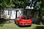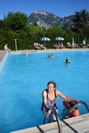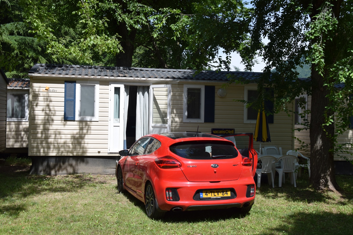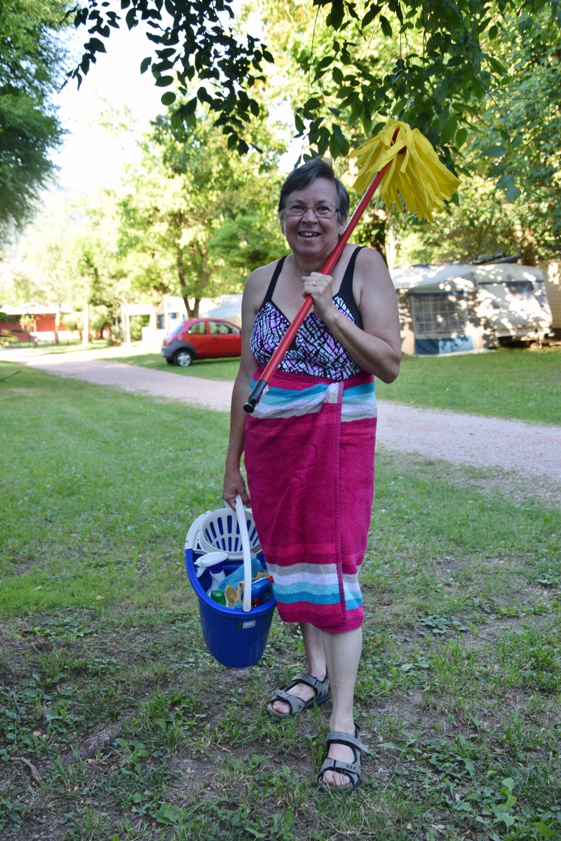 Nog even bij de supermarkt aan voor enkele etenswaar. Auto vol tanken voor morgen en op naar de camping. Hier nog even een poetsemmer oppikken want het huisje poetsen we zelf. We besluiten nog even naar het prive strand te gaan van de camping maar na een half uur wandelen nog niets. Terug naar de camping en naar de receptie toe. Nog eens gevraagd waar het strand is maar dat er nergens bordjes staan en de beschrijving klopt ook niet. Dan maar naar het zwembad want weer naar het dag strand te lopen hebben we geen zin in. Als we bij het zwembad komen is er geen ligbed. We besluiten maar om op een bankje te gaan zitten. Toos “plonst” nog even in het water zodat Mels enkele foto’s kan maken. Maar even later, het is bijna 18:00 uur wordt het zwembad opgeruimd en het wordt gesloten. Terug naar het huisje. Even iets eten. Mels gaat even kijken of er nog bericht is van Vacansoleil. De nachtportier heeft een sleutel van ons huisje op de camping in Frankrijk. Tevens vragen ze ons om hoe laat we ongeveer dat zijn maar daar kunnen we niet definiet een afspraak over maken schrijft Mels hun. Je weet niet wat je op de weg tegenkomt. Mels gaat zich even douchen. Ondertussen poetst Toos al een gedeelte van het huisje. Dan gaat Toos zich douchen. Het is inderdaad lekker warm water bij de grote camping douches. We hebben niet in het huisje gedoucht omdat we deze goed moesten poetsen, geen haren of kalk vlekken mochten er meer zijn. Bij deze dus, we hebben er ons niet gedoucht dus niets te zien of te vinden.