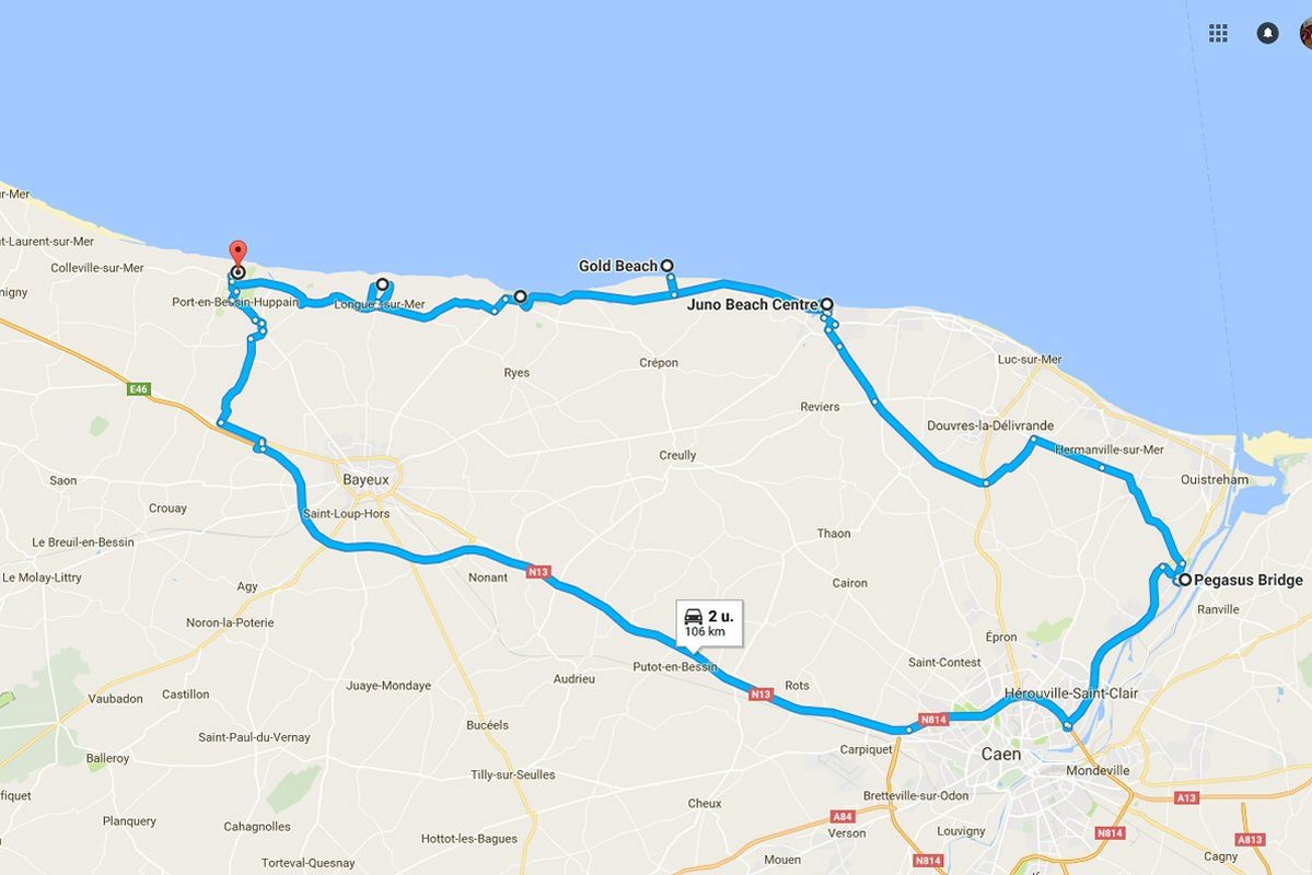 Verslag van Camping Port’land – Pegasus Bridge – Sword Beach – Juno Beach – Gold Beach – Arromanches-les-Bains – Longues-sur-Mer (110 Km) De route: Vorige dag Volgende dag