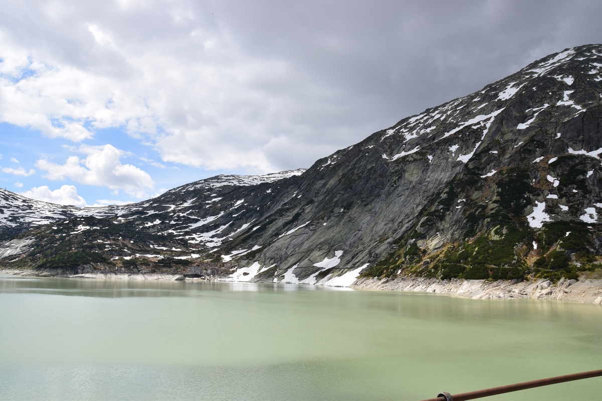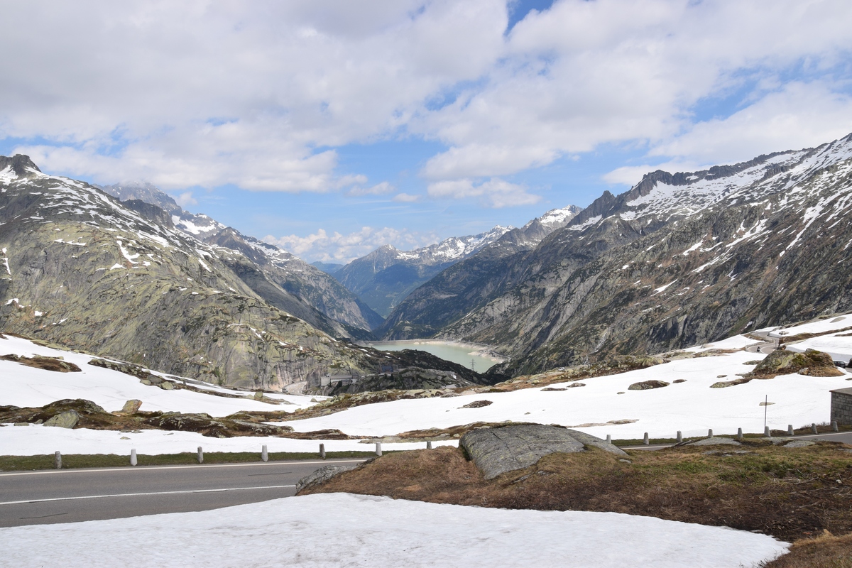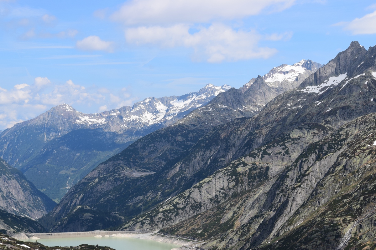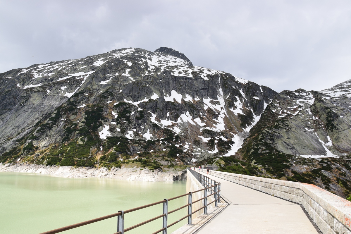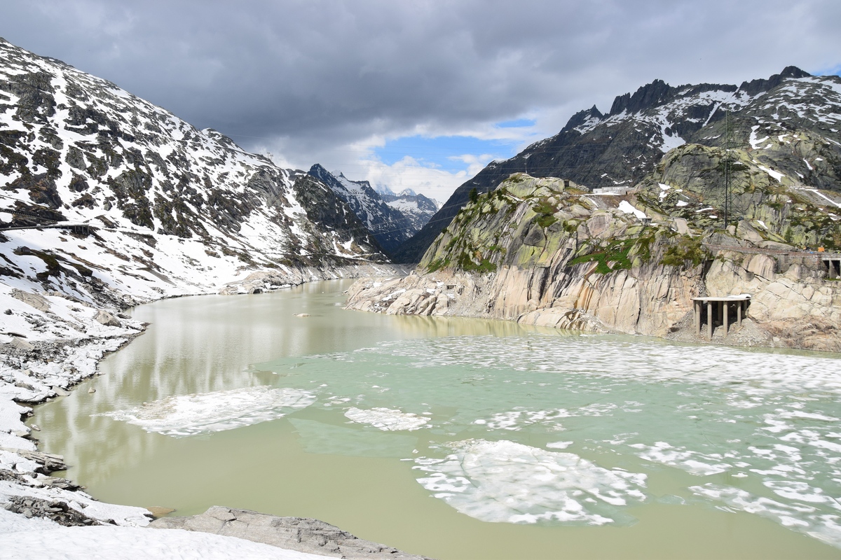 Grimselsee / Räterichsbodensee Vanuit het noorden kan de pashoogte bereikt worden via het Haslital. Vanuit Innertkirchen moet over een afstand van 25 kilometer een hoogteverschil van bijna 1500 meter overwonnen worden. De weg is goed uitgebouwd, breed en nergens bijzonder steil. Bij Handeck voert sinds 1926 de steilste kabeltrein van Europa, de Gelmerbahn naar de Gelmersee en overspant een hangbrug (Handeckfallbrücke) het op deze plaats zeer smalle dal. Nabij de pashoogte liggen drie grote stuwmeren: de Grimselsee, de Räterichsbodensee en de Oberaarsee. Deze laatste is via een zes kilometer lange zijweg te bereiken. In dit meer wordt het smeltwater van de Oberaargletsjer opgevangen die op de oostflank van de 4.274 meter hoge Finsteraarhorn ligt. Het hospiz van de Grimselpas ligt op een rotspunt op een schiereiland in de Grimselsee op 1.980 meter hoogte, van waaruit men ook de Rhônegletsjer ziet liggen.