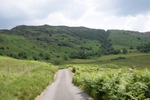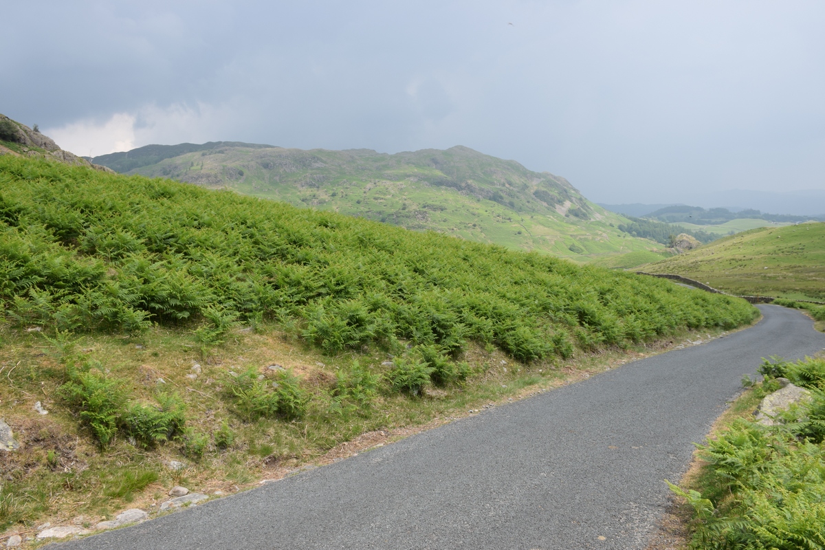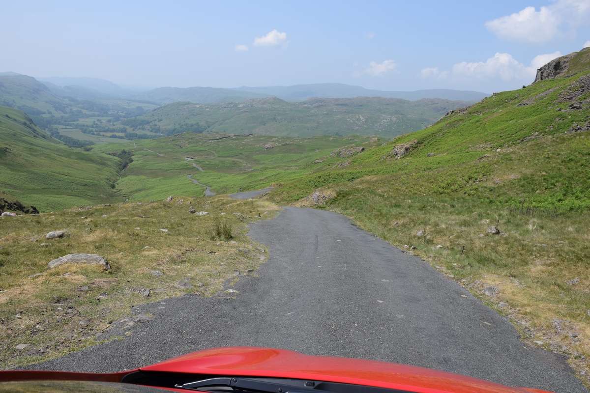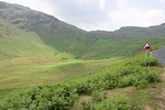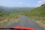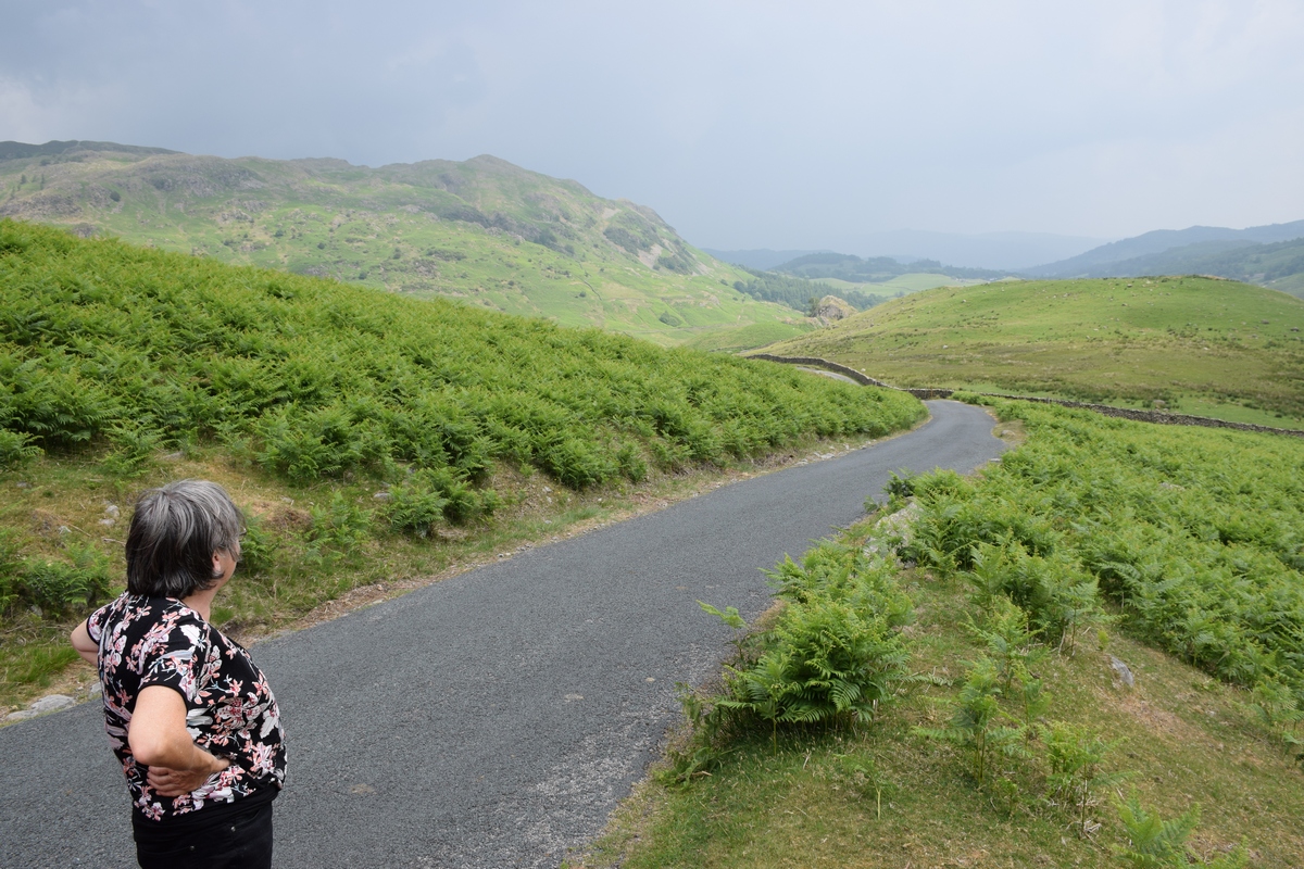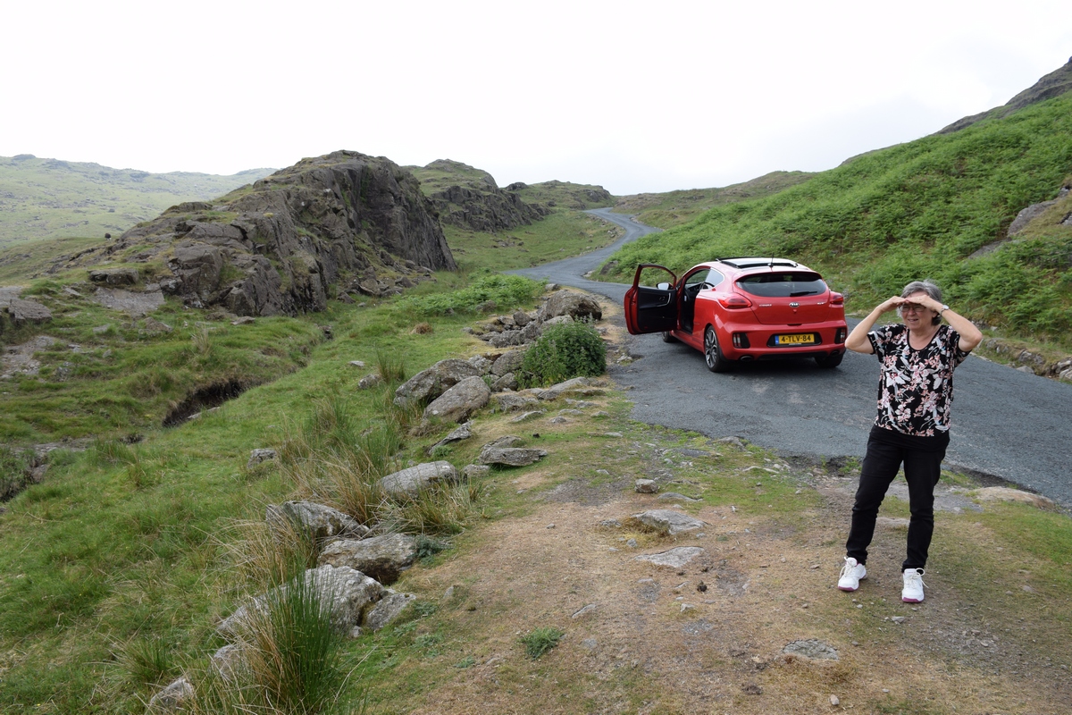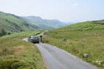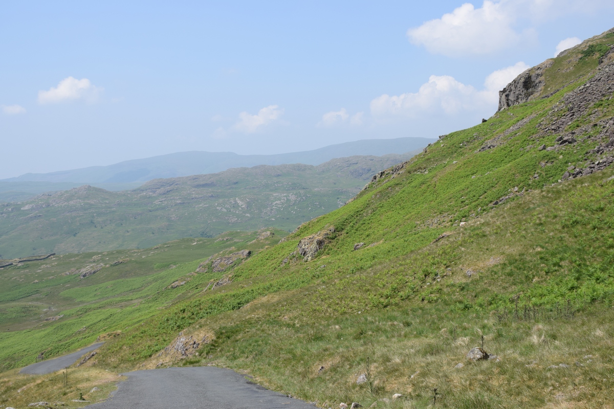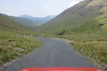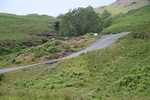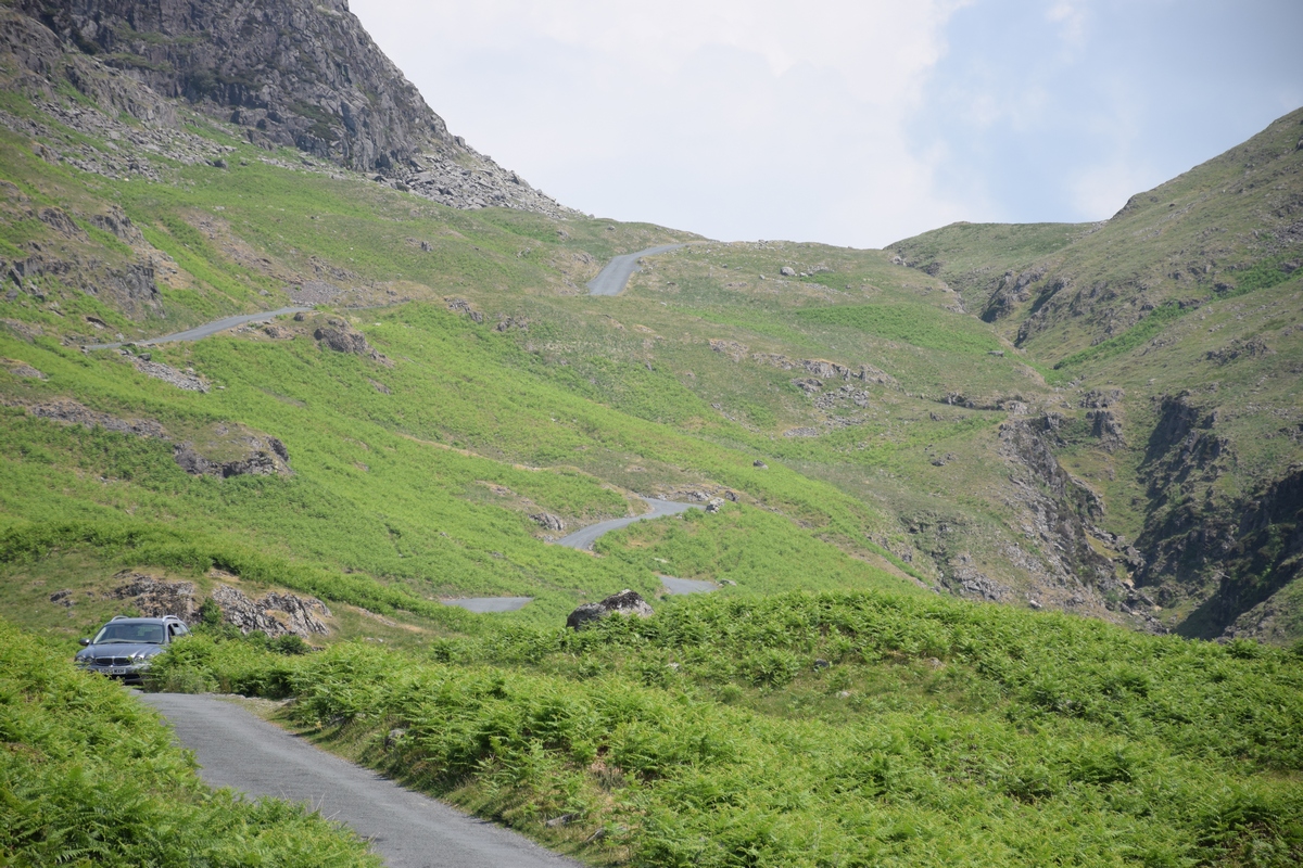Het is ongeveer 21 graden als we verder rijden. We rijden over wildroosters. Langs de weg in de weilanden lopen en liggen overal schapen met hun jongen. Bij Wynrose Pads is een wegomlegging. Hier moeten we zelf de wegen uitzoeken hoe we verder gaan. Het lukt ons. We komen dan ook nog 30 % hellingen tegen. De bergen gaan tot 1440 meter hoogte. We gaan door naar Hardknottpass. Die gaat ook 30 % omhoog. Overal zien we alleen maar varens. Dan zien we een schaap met lam midden op de straat. De ooi laat daar rustig het lam drinken.