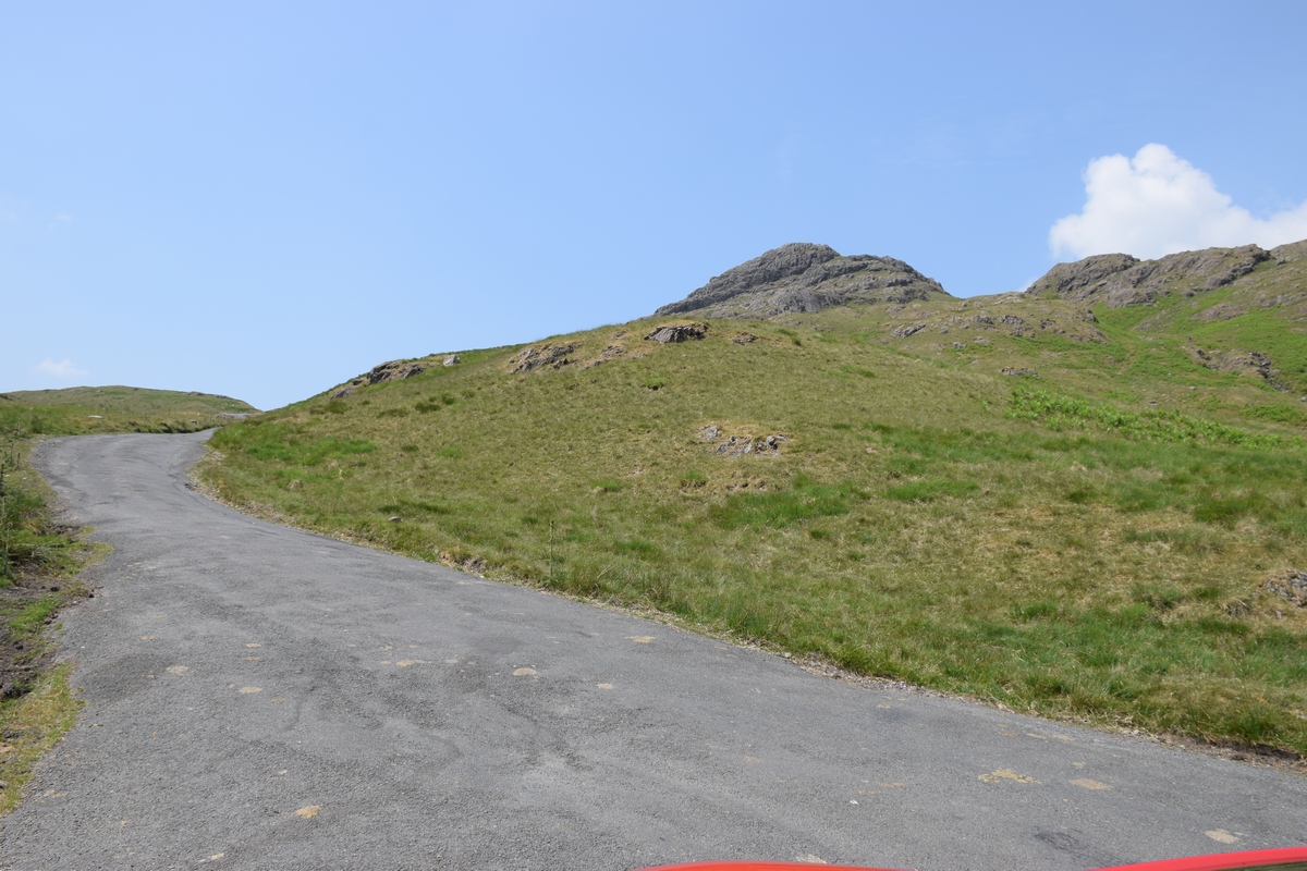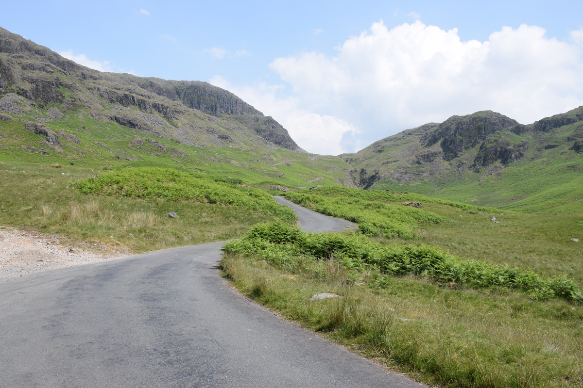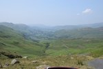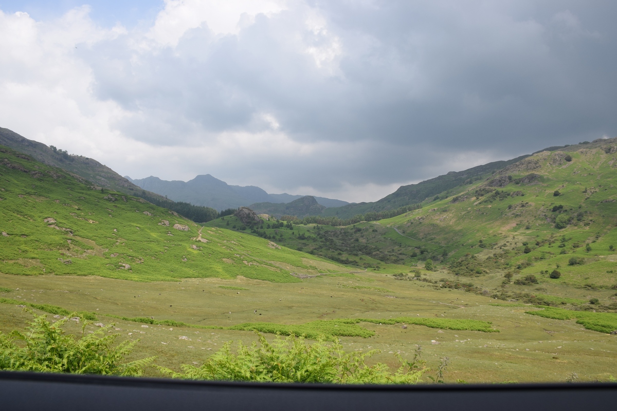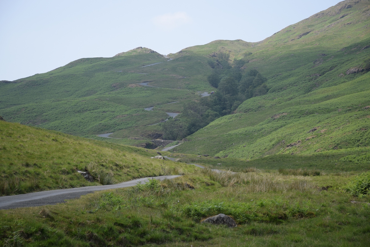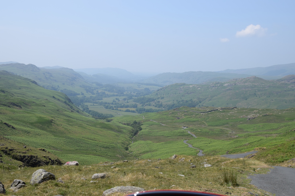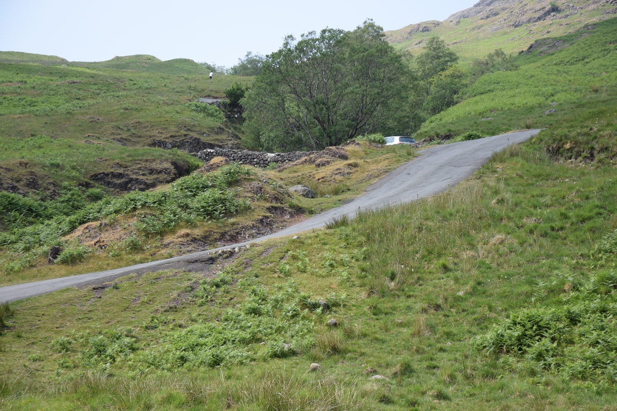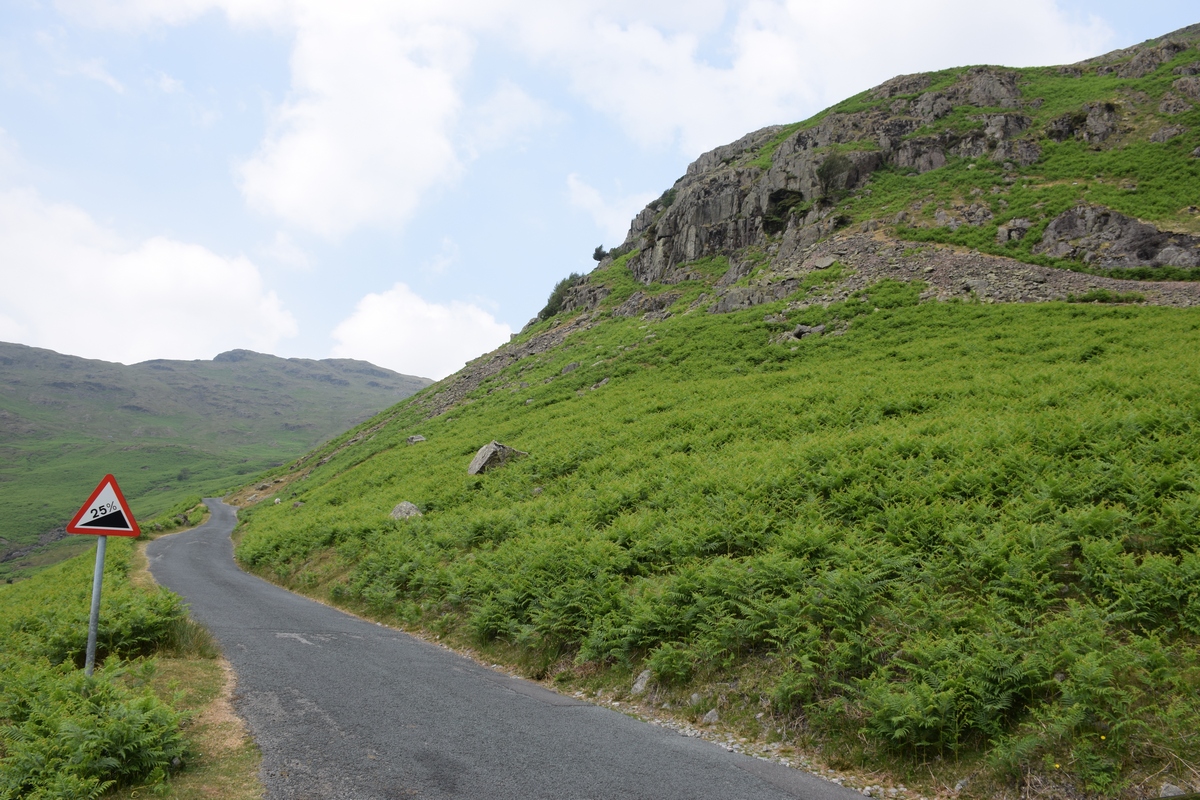 Het is ongeveer 21 graden als we verder rijden. We rijden over wildroosters. Langs de weg in de weilanden lopen en liggen overal schapen met hun jongen. Bij Wynrose Pads is een wegomlegging. Hier moeten we zelf de wegen uitzoeken hoe we verder gaan. Het lukt ons. We komen dan ook nog 30 % hellingen tegen. De bergen gaan tot 1440 meter hoogte. We gaan door naar Hardknottpass. Die gaat ook 30 % omhoog. Overal zien we alleen maar varens. Dan zien we een schaap met lam midden op de straat. De ooi laat daar rustig het lam drinken.