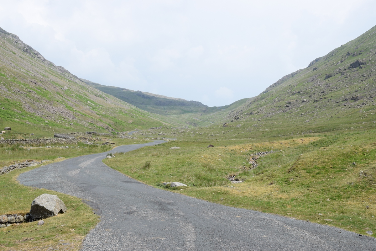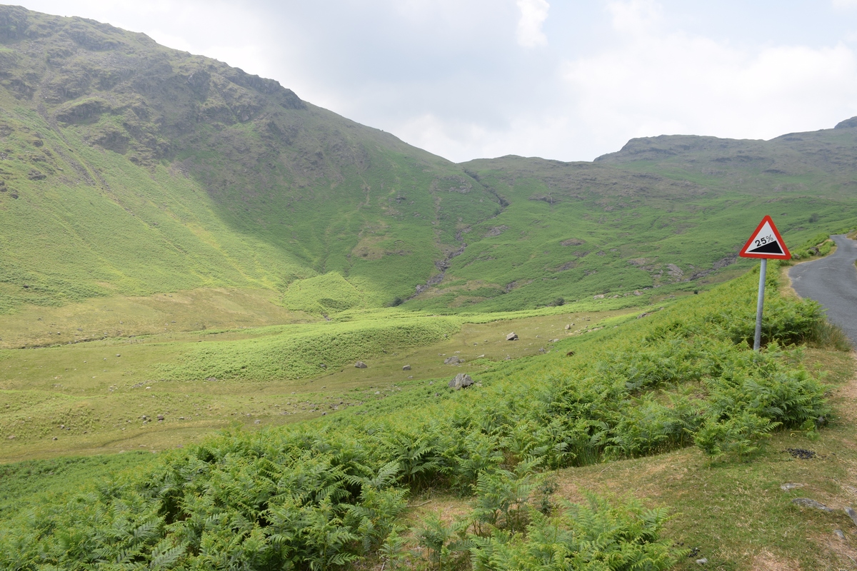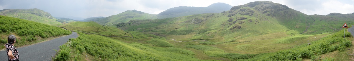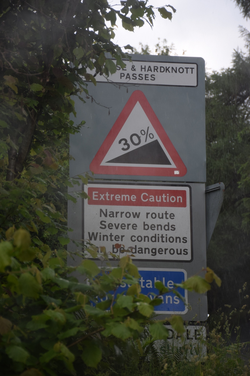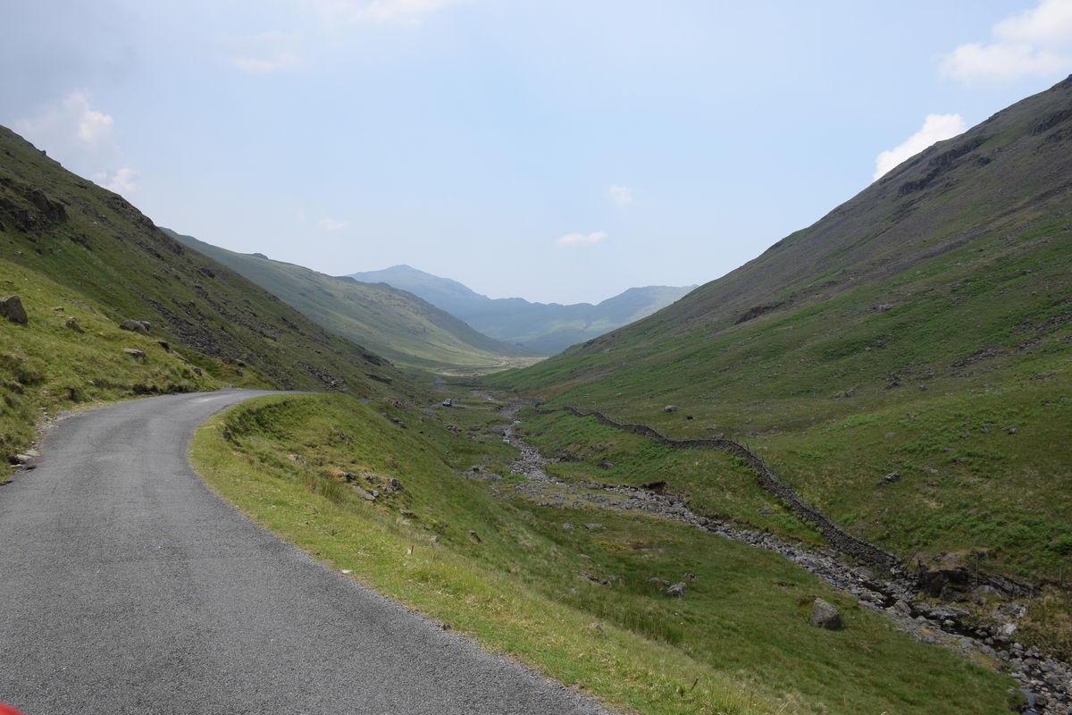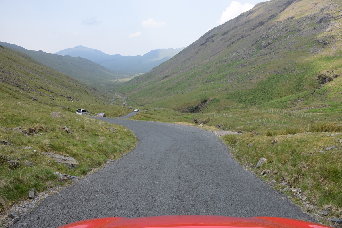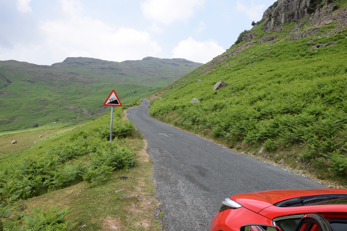Het is ongeveer 21 graden als we verder rijden. We rijden over wildroosters. Langs de weg in de weilanden lopen en liggen overal schapen met hun jongen. Bij Wynrose Pads is een wegomlegging. Hier moeten we zelf de wegen uitzoeken hoe we verder gaan. Het lukt ons. We komen dan ook nog 30 % hellingen tegen. De bergen gaan tot 1440 meter hoogte. We gaan door naar Hardknottpass. Die gaat ook 30 % omhoog. Overal zien we alleen maar varens. Dan zien we een schaap met lam midden op de straat. De ooi laat daar rustig het lam drinken.