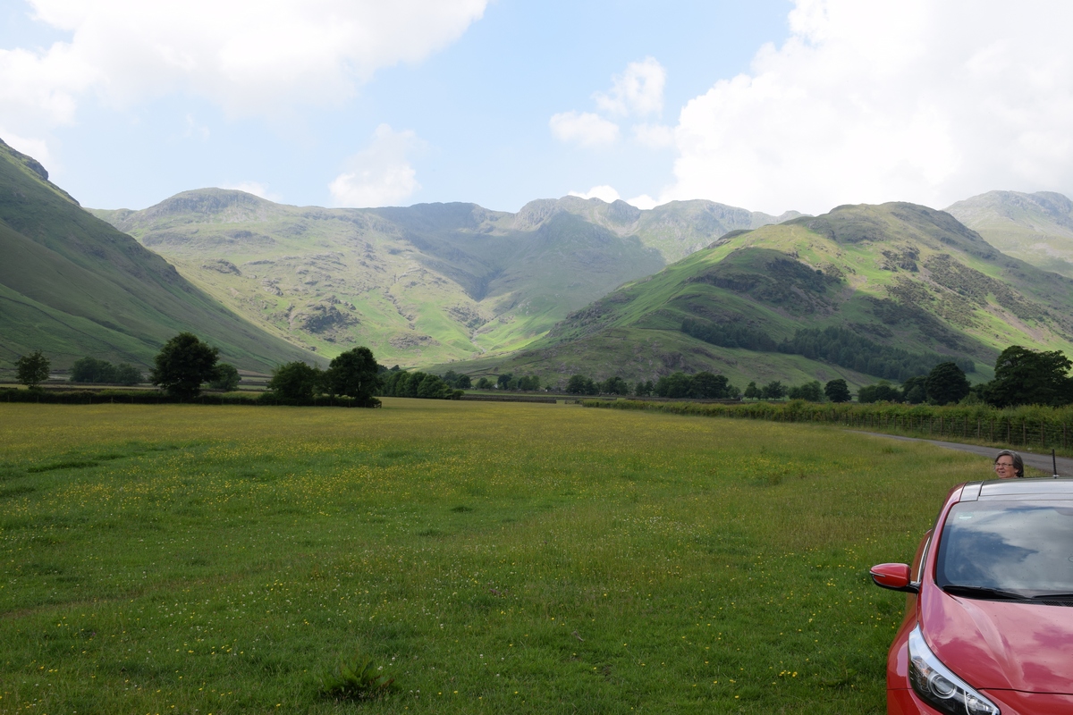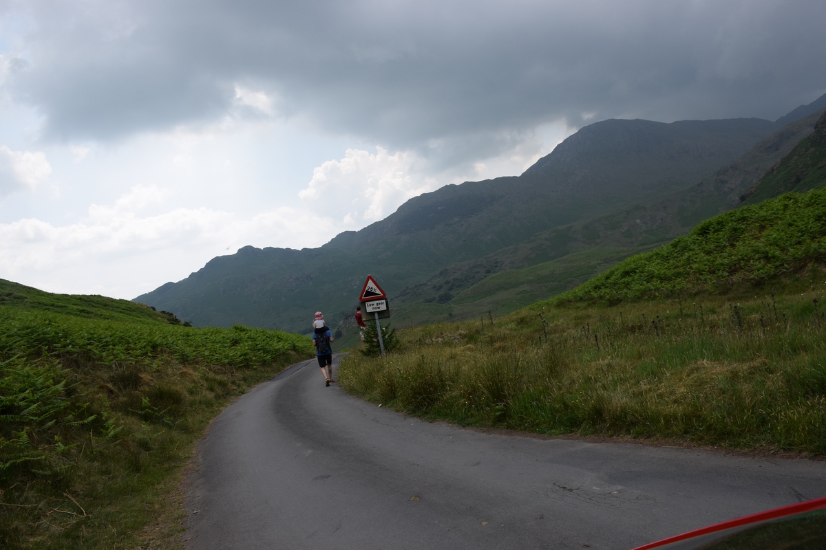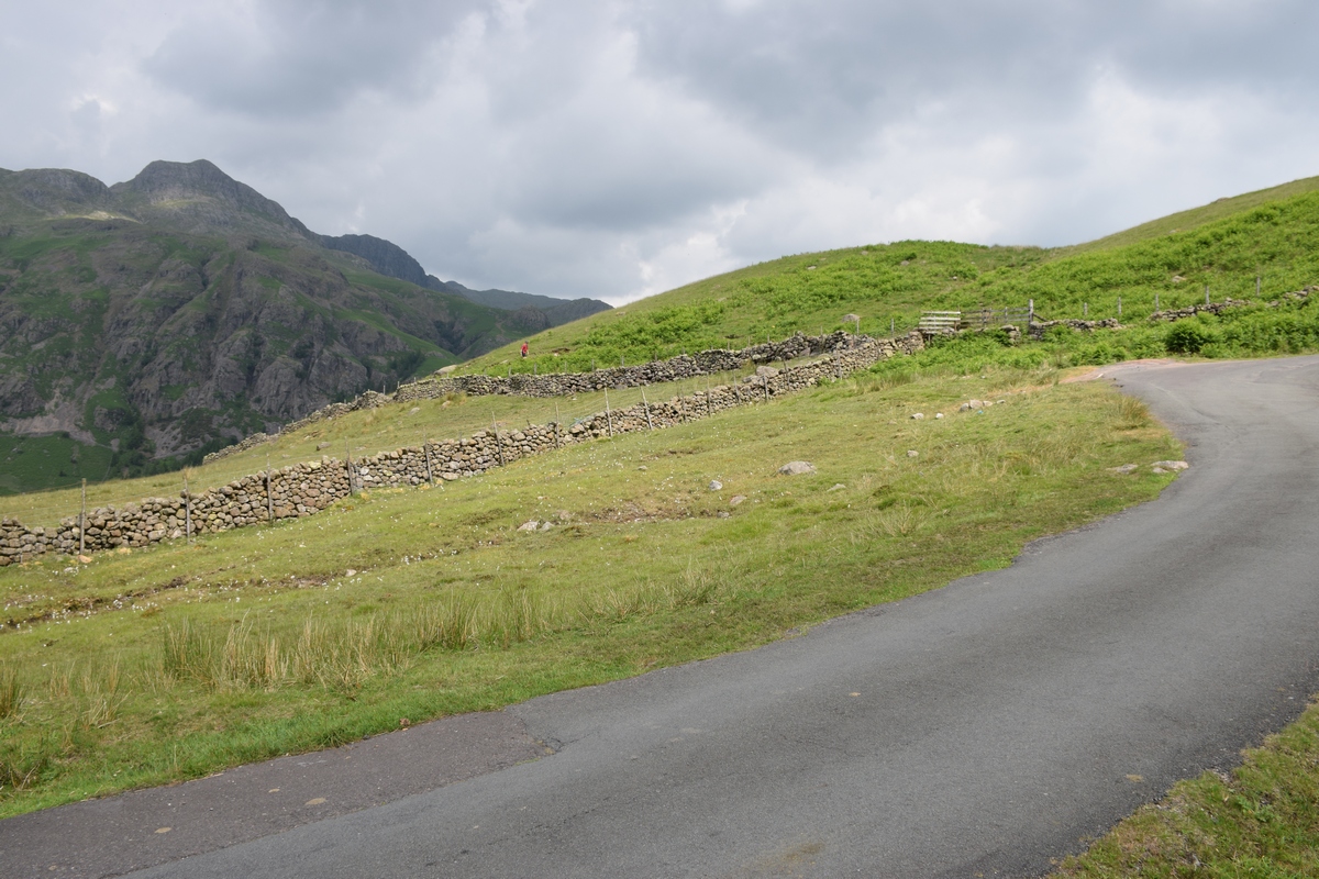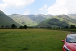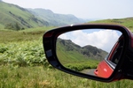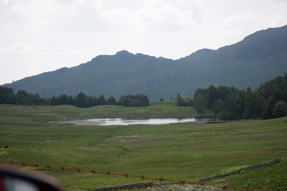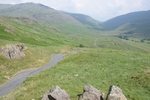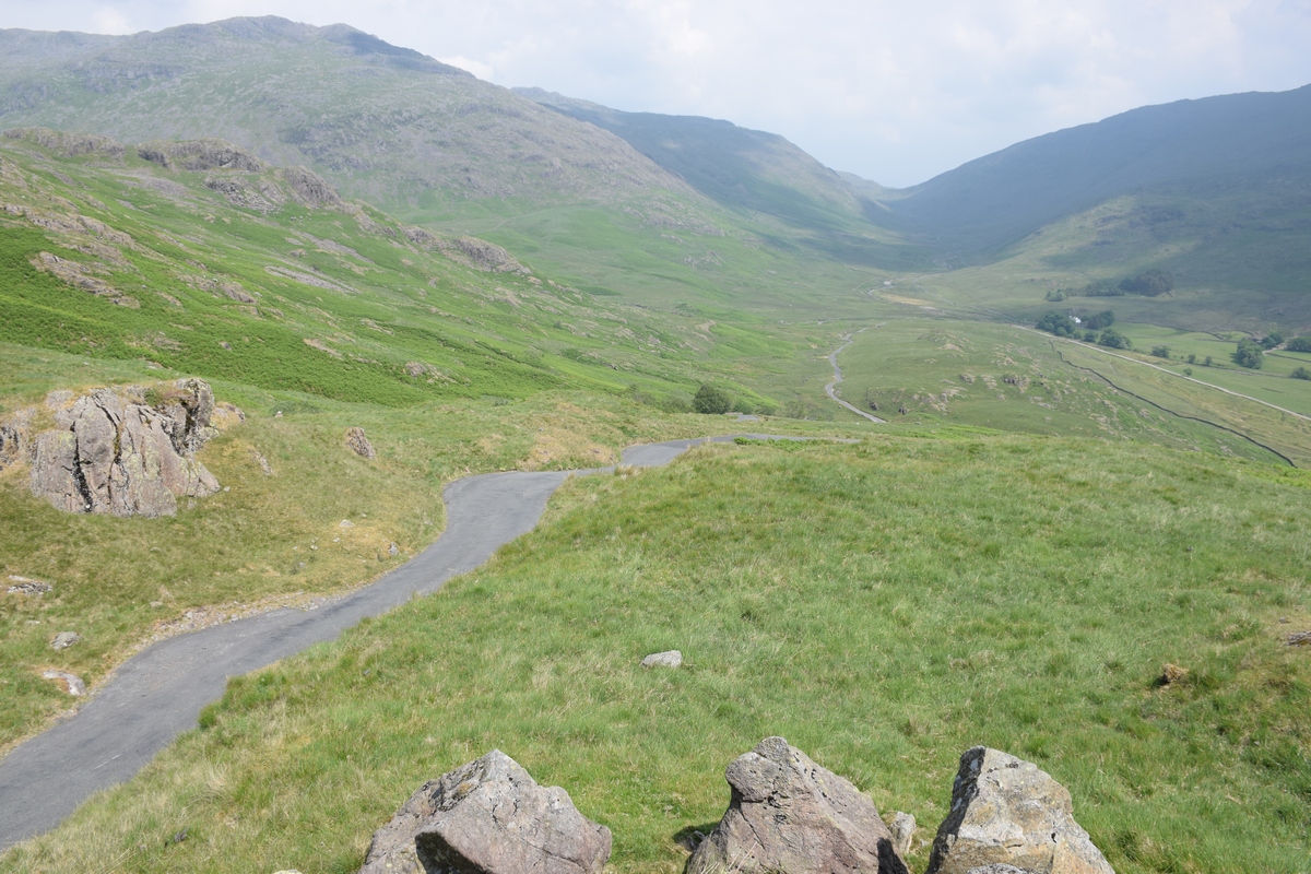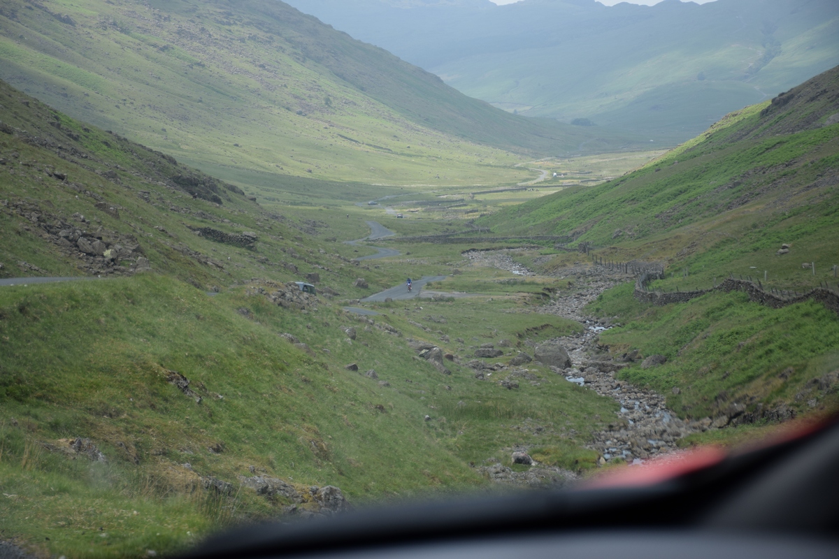 Het is ongeveer 21 graden als we verder rijden. We rijden over wildroosters. Langs de weg in de weilanden lopen en liggen overal schapen met hun jongen. Bij Wynrose Pads is een wegomlegging. Hier moeten we zelf de wegen uitzoeken hoe we verder gaan. Het lukt ons. We komen dan ook nog 30 % hellingen tegen. De bergen gaan tot 1440 meter hoogte. We gaan door naar Hardknottpass. Die gaat ook 30 % omhoog. Overal zien we alleen maar varens. Dan zien we een schaap met lam midden op de straat. De ooi laat daar rustig het lam drinken.
