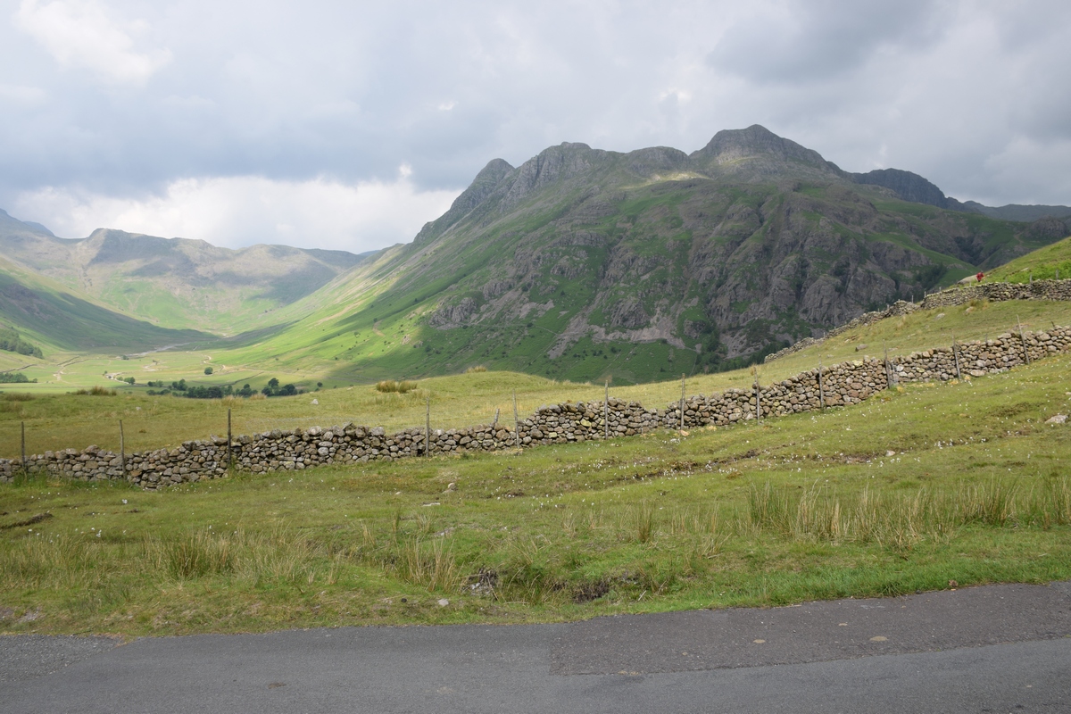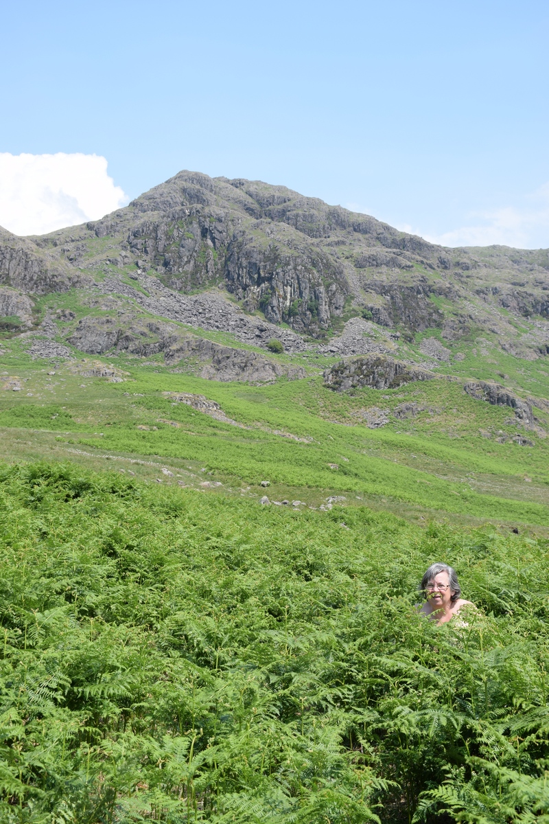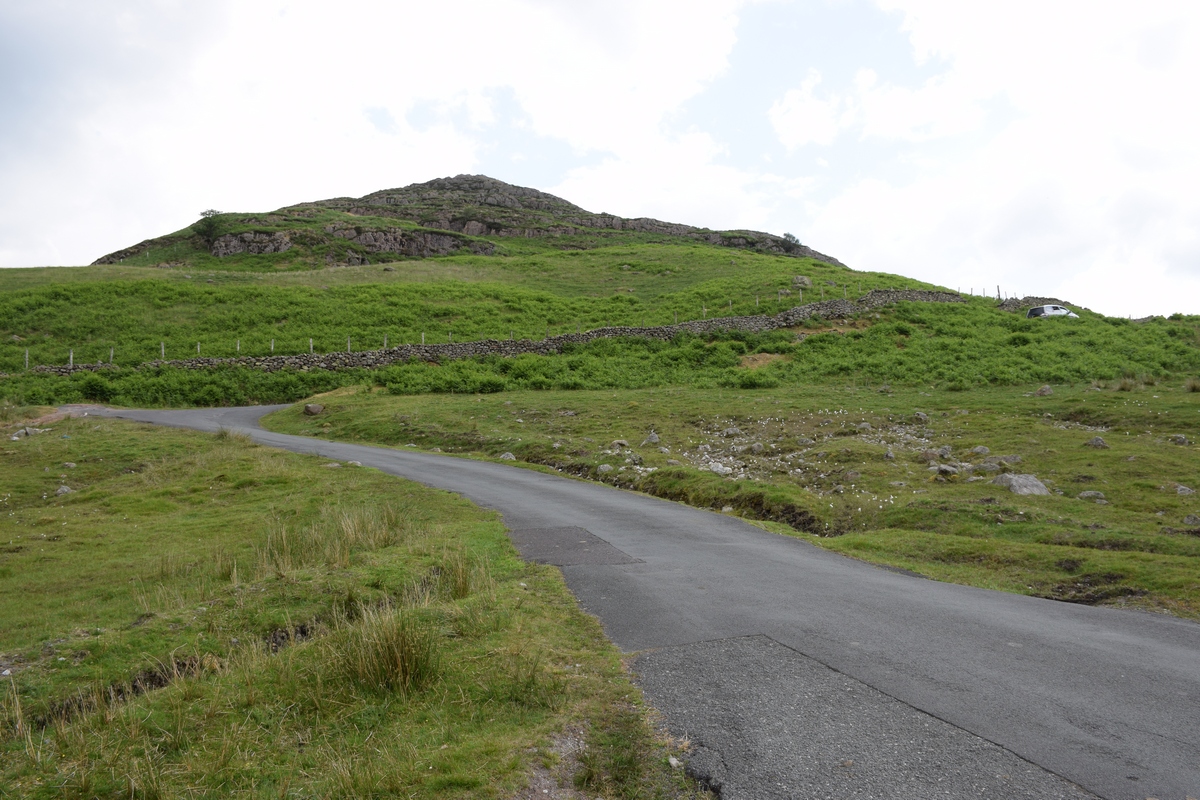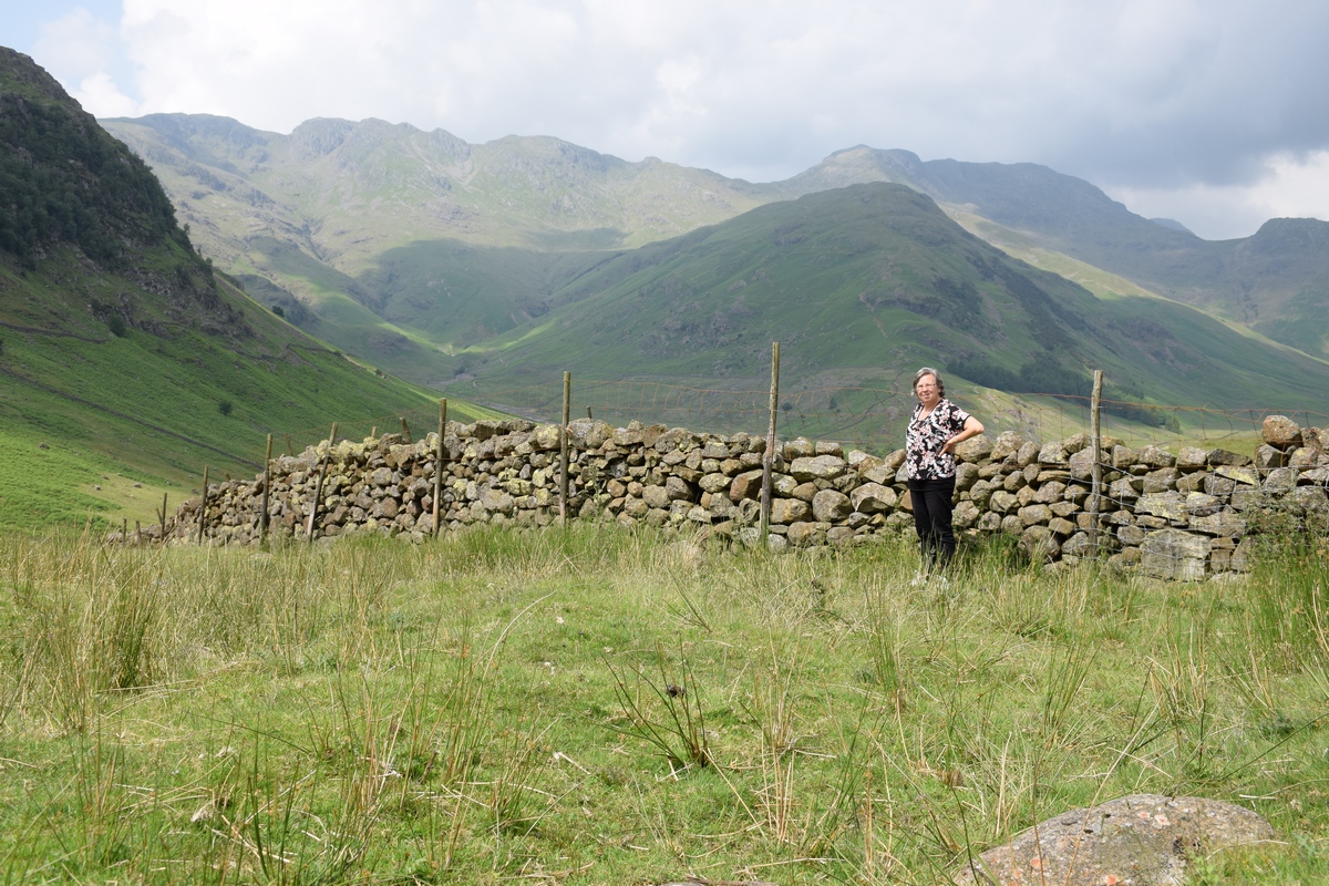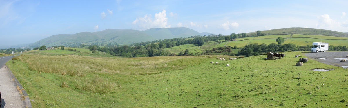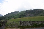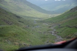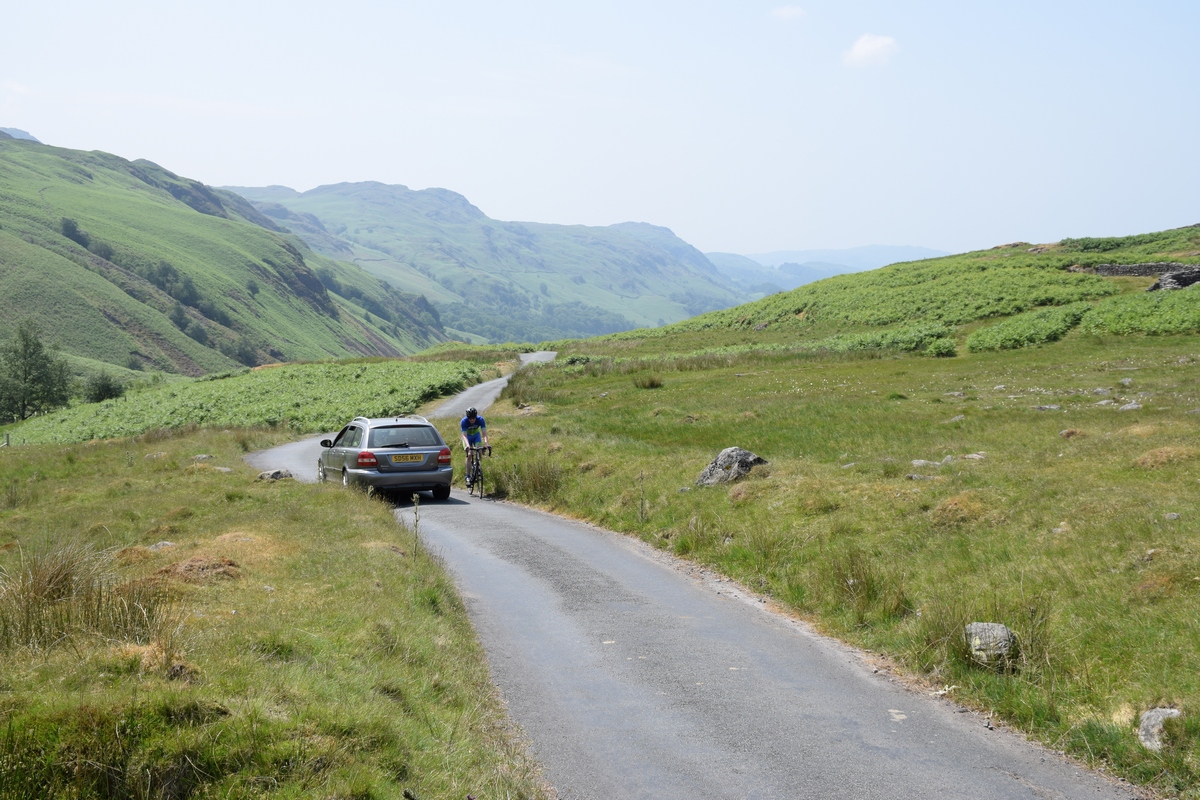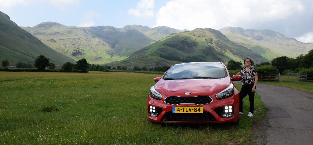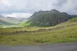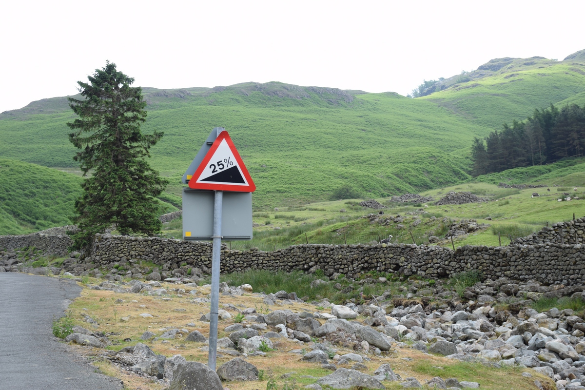 Het is ongeveer 21 graden als we verder rijden. We rijden over wildroosters. Langs de weg in de weilanden lopen en liggen overal schapen met hun jongen. Bij Wynrose Pads is een wegomlegging. Hier moeten we zelf de wegen uitzoeken hoe we verder gaan. Het lukt ons. We komen dan ook nog 30 % hellingen tegen. De bergen gaan tot 1440 meter hoogte. We gaan door naar Hardknottpass. Die gaat ook 30 % omhoog. Overal zien we alleen maar varens. Dan zien we een schaap met lam midden op de straat. De ooi laat daar rustig het lam drinken.