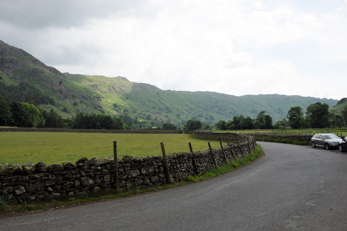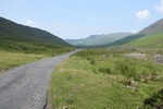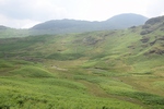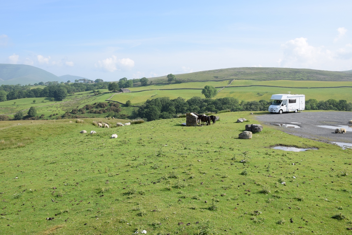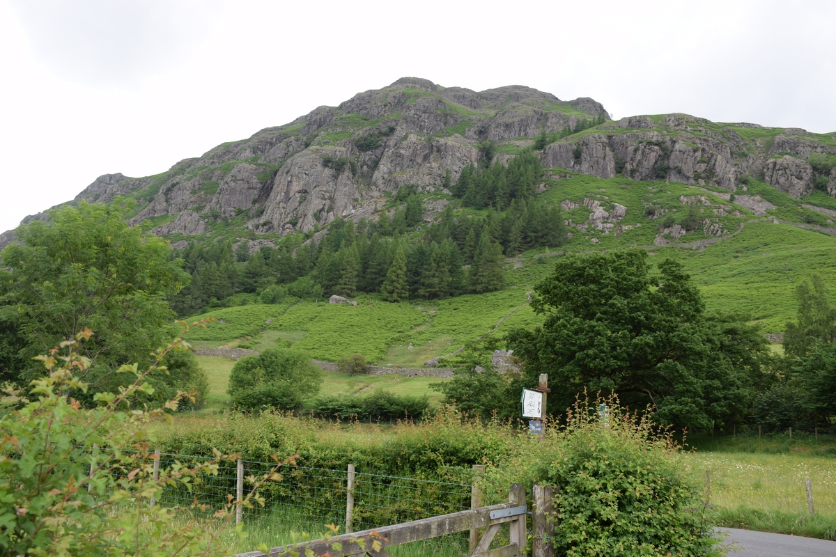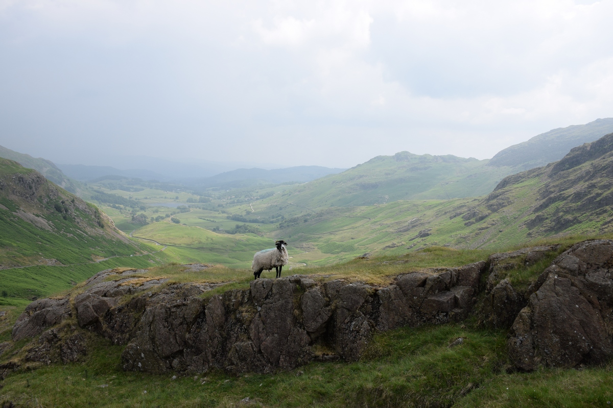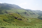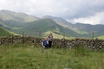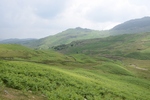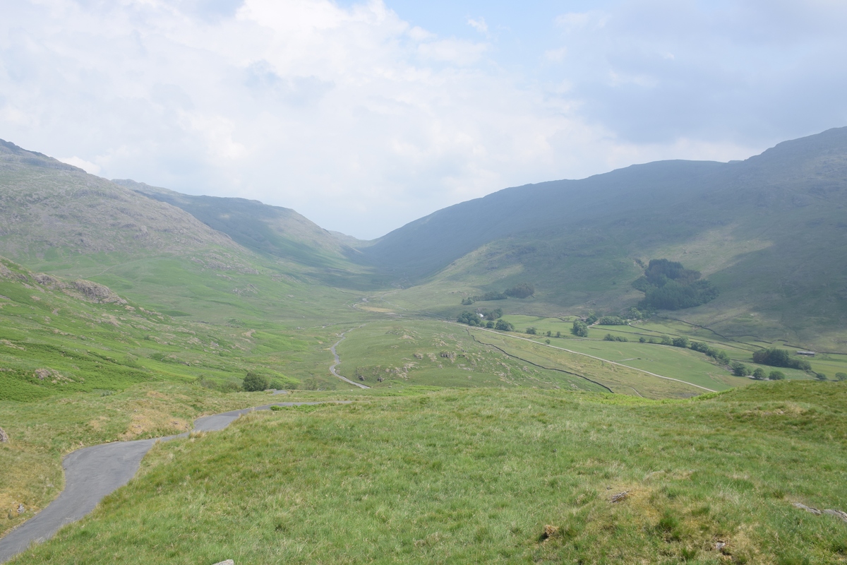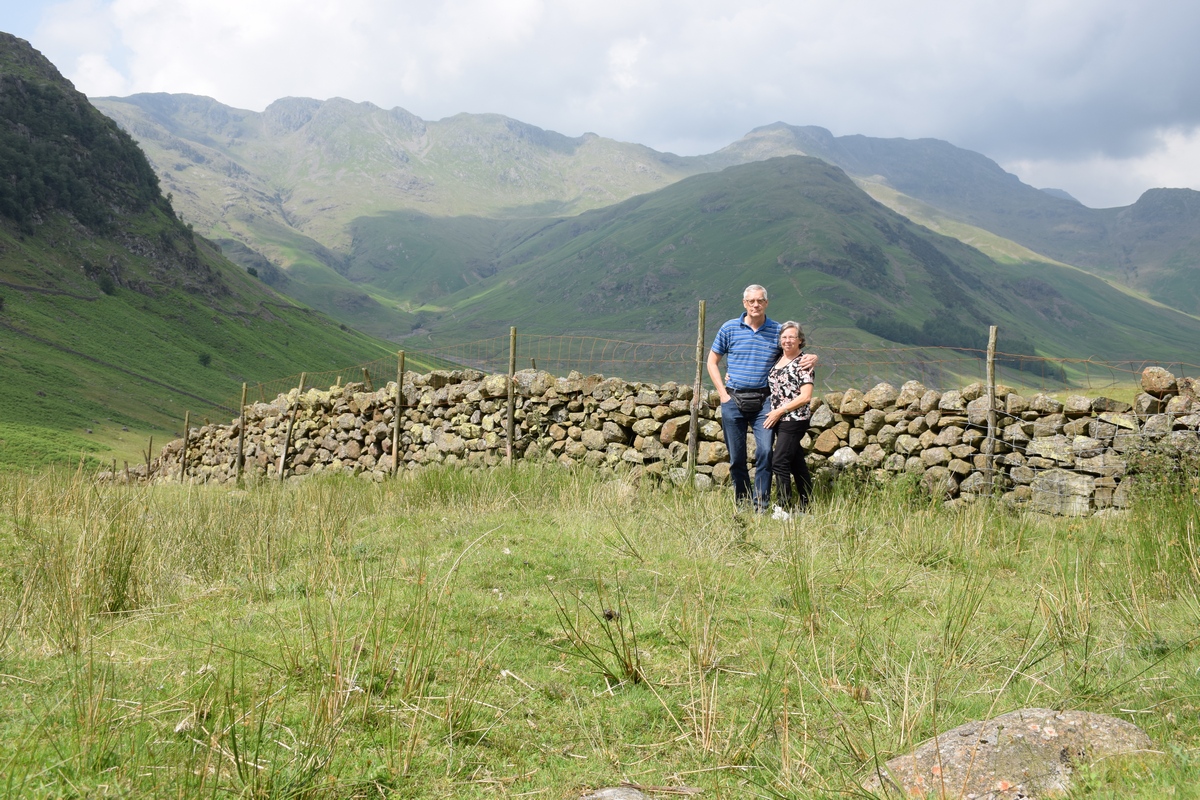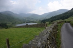 Het is ongeveer 21 graden als we verder rijden. We rijden over wildroosters. Langs de weg in de weilanden lopen en liggen overal schapen met hun jongen. Bij Wynrose Pads is een wegomlegging. Hier moeten we zelf de wegen uitzoeken hoe we verder gaan. Het lukt ons. We komen dan ook nog 30 % hellingen tegen. De bergen gaan tot 1440 meter hoogte. We gaan door naar Hardknottpass. Die gaat ook 30 % omhoog. Overal zien we alleen maar varens. Dan zien we een schaap met lam midden op de straat. De ooi laat daar rustig het lam drinken.