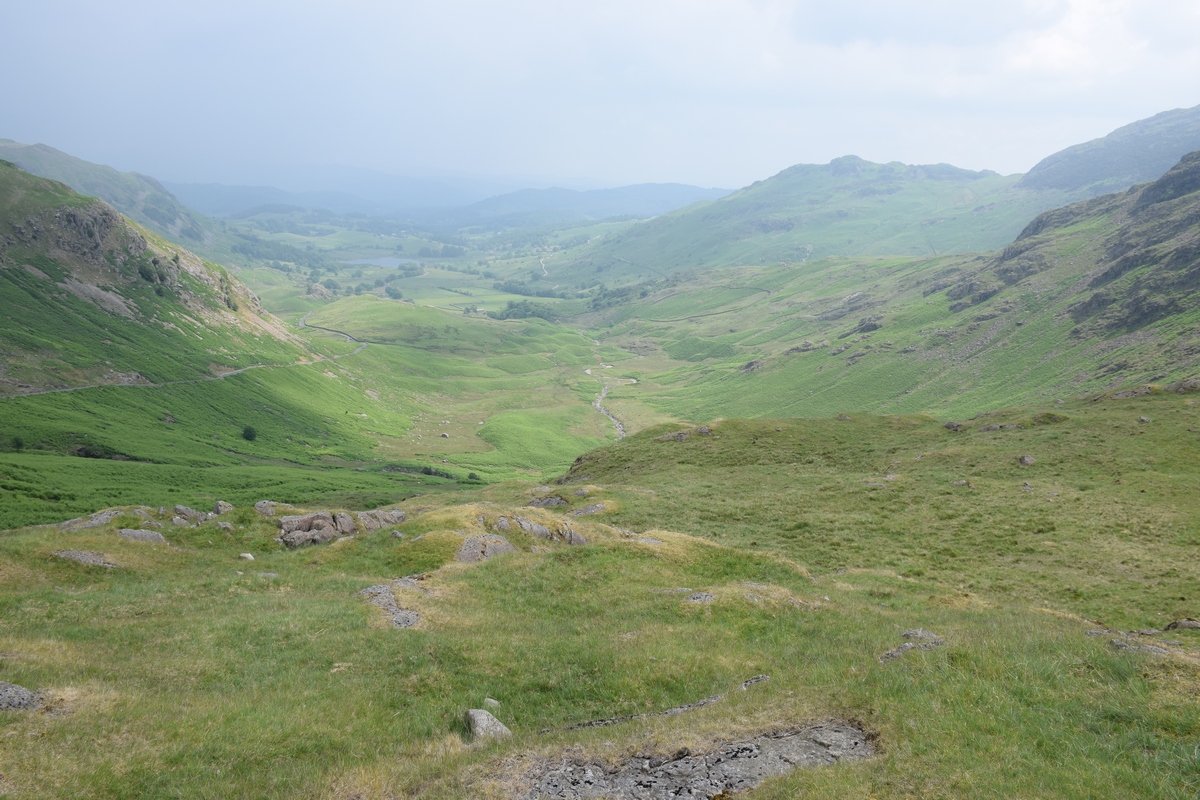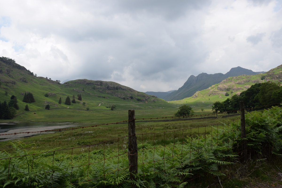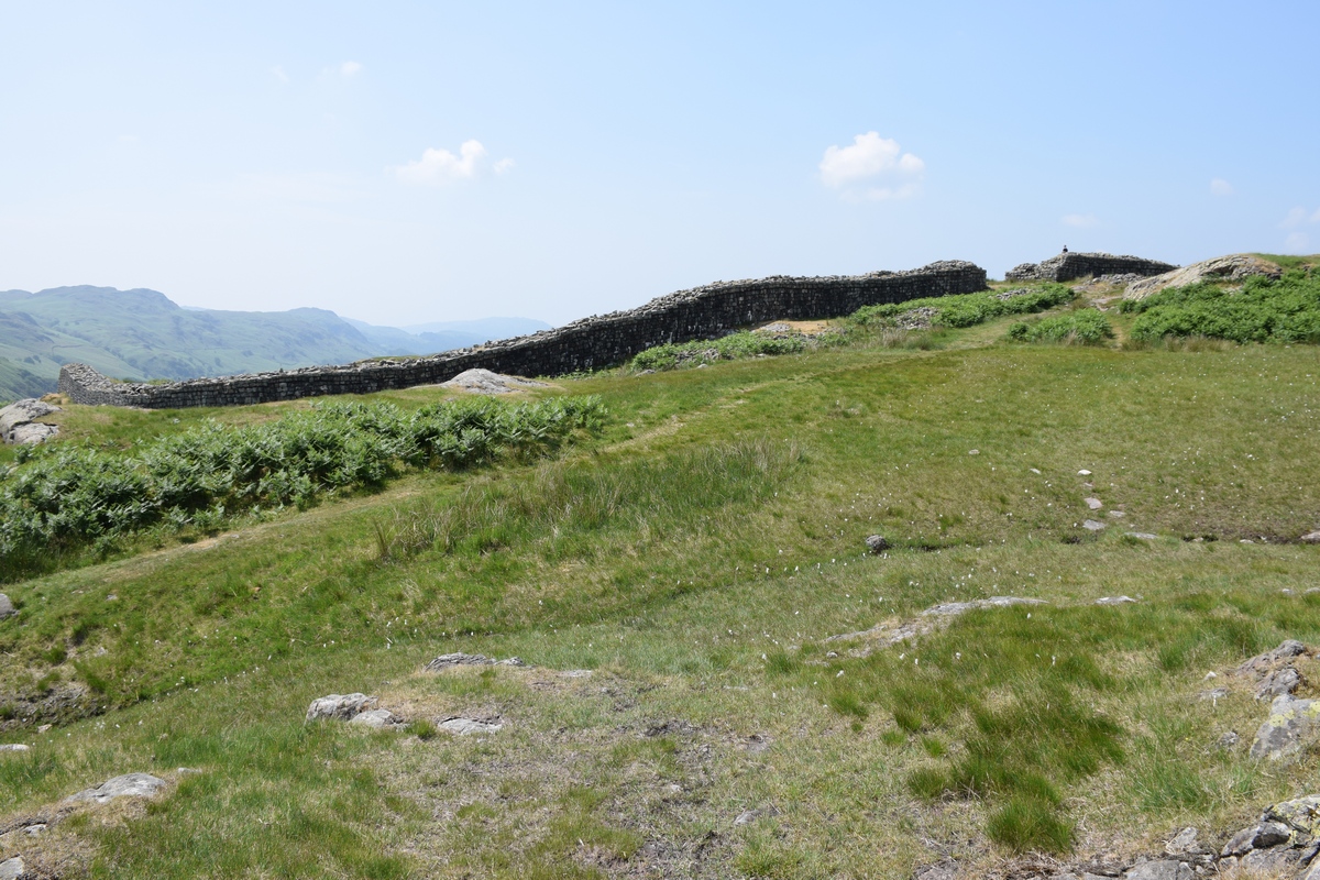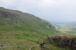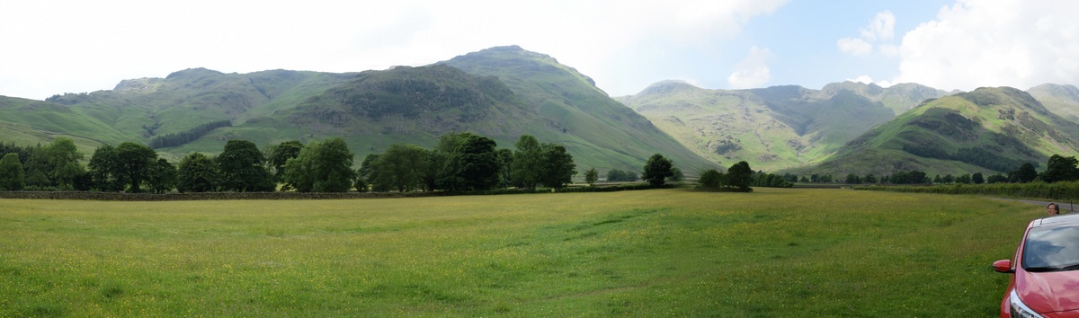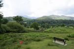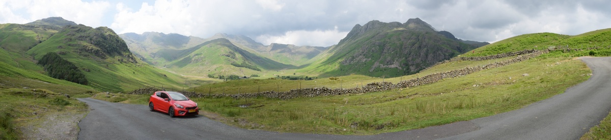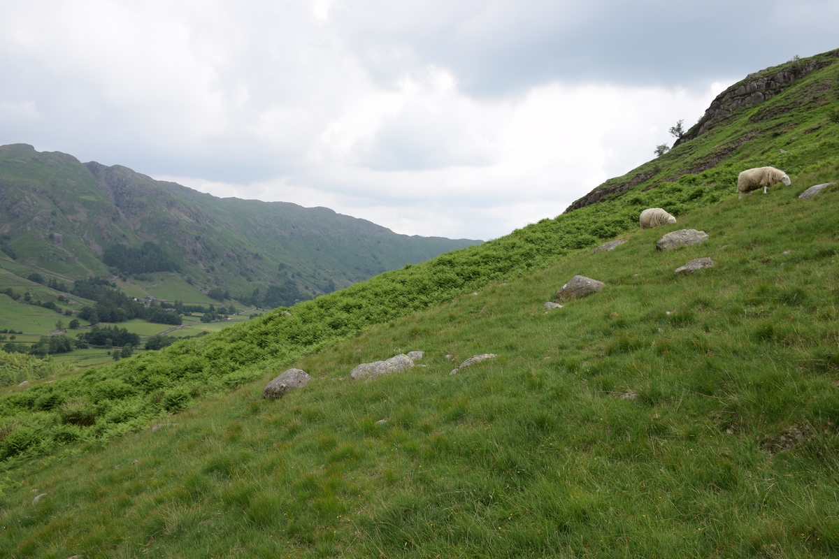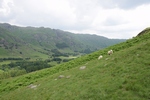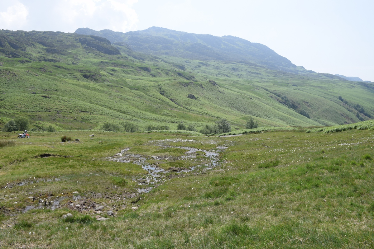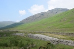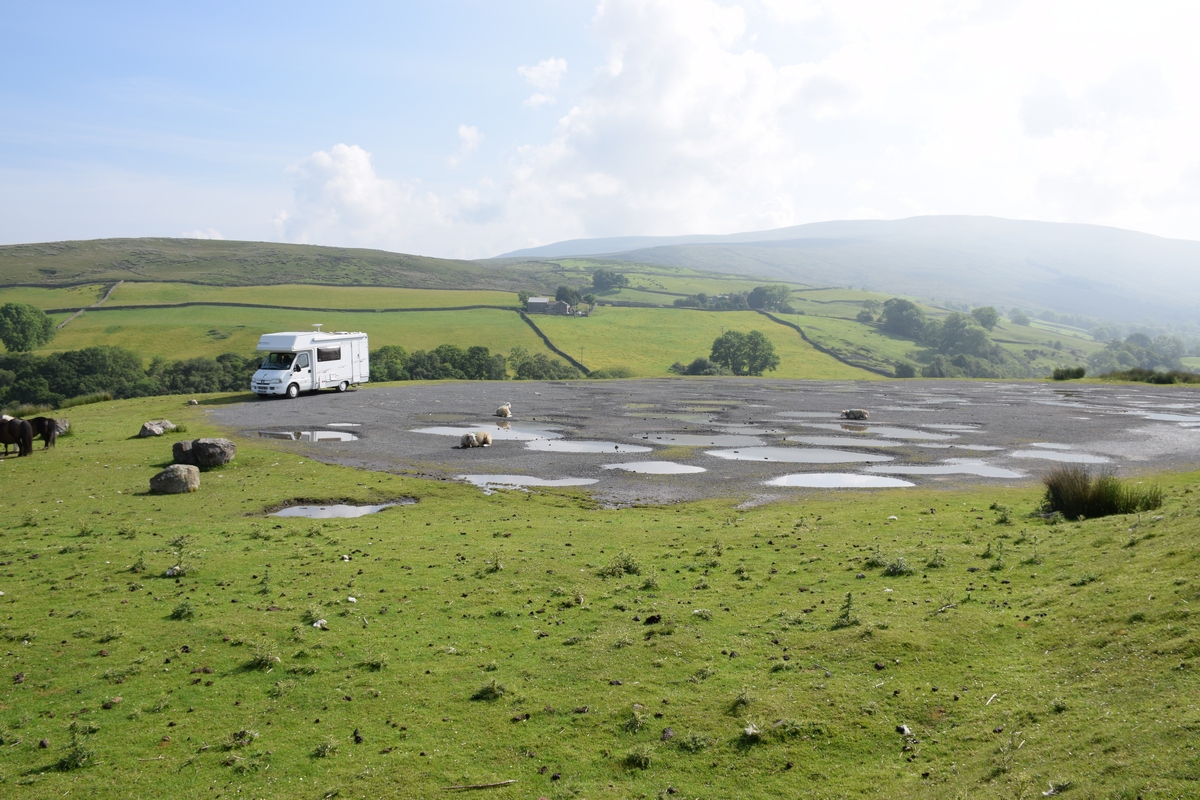 Het is ongeveer 21 graden als we verder rijden. We rijden over wildroosters. Langs de weg in de weilanden lopen en liggen overal schapen met hun jongen. Bij Wynrose Pads is een wegomlegging. Hier moeten we zelf de wegen uitzoeken hoe we verder gaan. Het lukt ons. We komen dan ook nog 30 % hellingen tegen. De bergen gaan tot 1440 meter hoogte. We gaan door naar Hardknottpass. Die gaat ook 30 % omhoog. Overal zien we alleen maar varens. Dan zien we een schaap met lam midden op de straat. De ooi laat daar rustig het lam drinken.