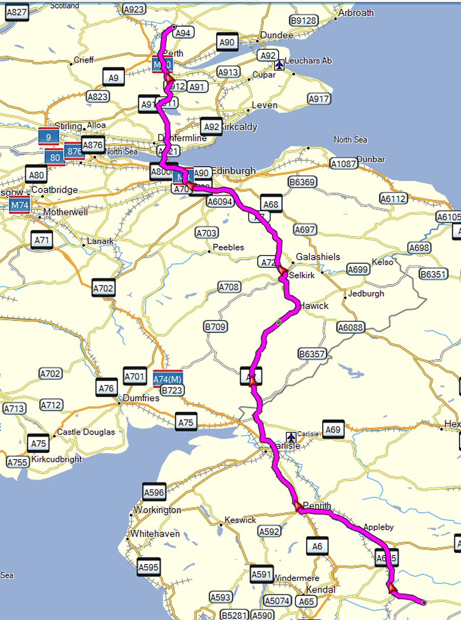De route is: van Camping Bainbridge Ings in Hawes (Yorkshire Dales) Engeland) naar Camping Beech Hedge in Cargill-Perth (Schotland) (335 Km)