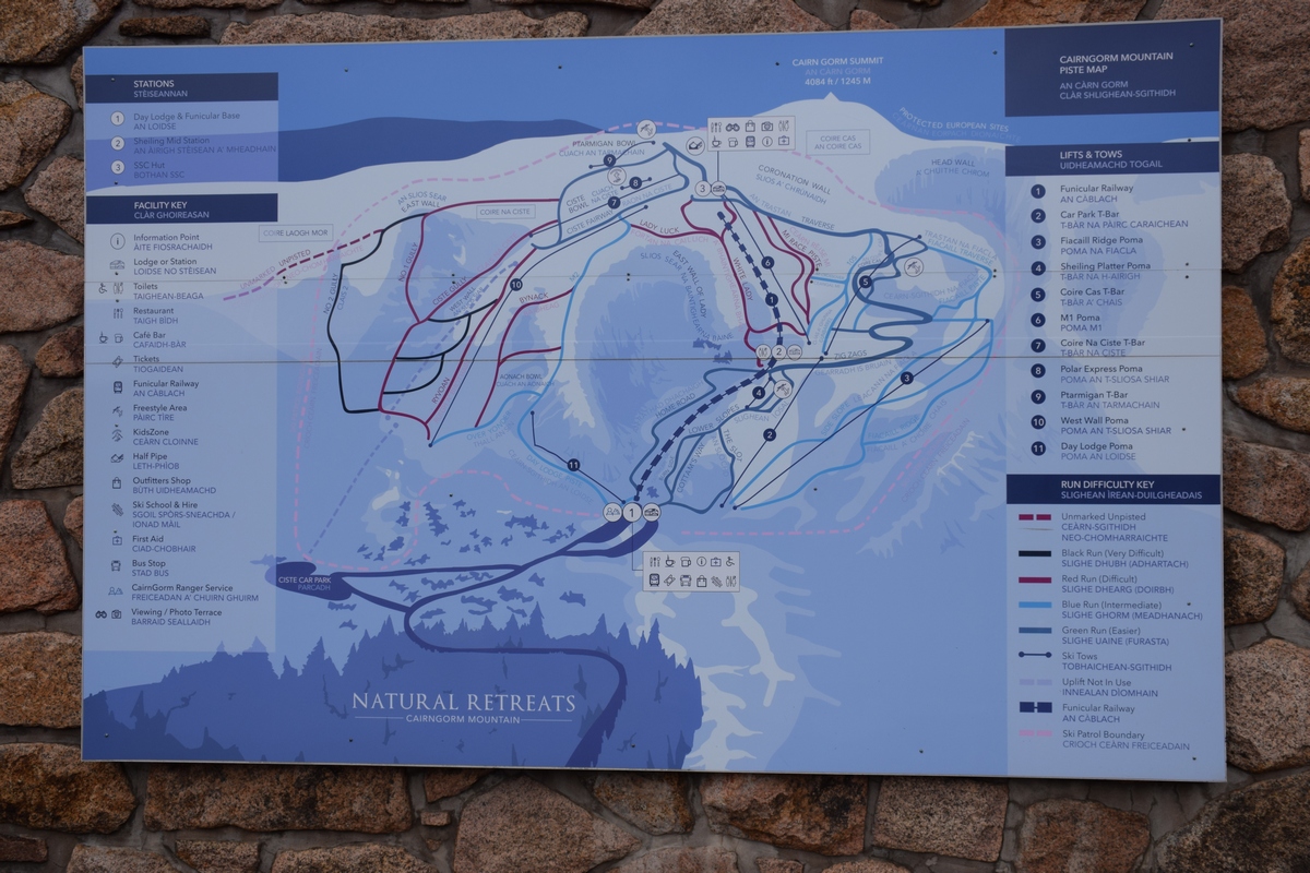 We rijden door het Glenn More Forrest Park. We zien weer meren en maken foto’s. Alles is hier mooi en je kunt foto’s blijven maken. Bij Aviemore gaan we een berg omhoog. Op 624 meter hoogte beginnen de skiliften. Hier is ook een restaurant waar we koffie drinken en natuurlijk ook foto’s maken. Ook nog even een magneet kopen. We hebben deze vakantie weer heel veel magneten gekocht en natuurlijk ook mokken.