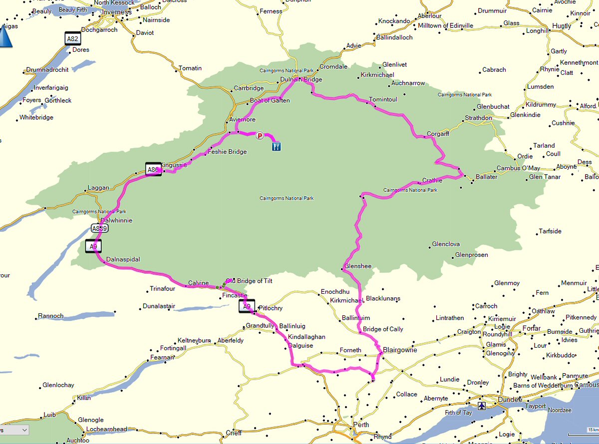 We hebben een route rondom Cairngorm Mountains. We vinden geen mooie uitzicht punten.