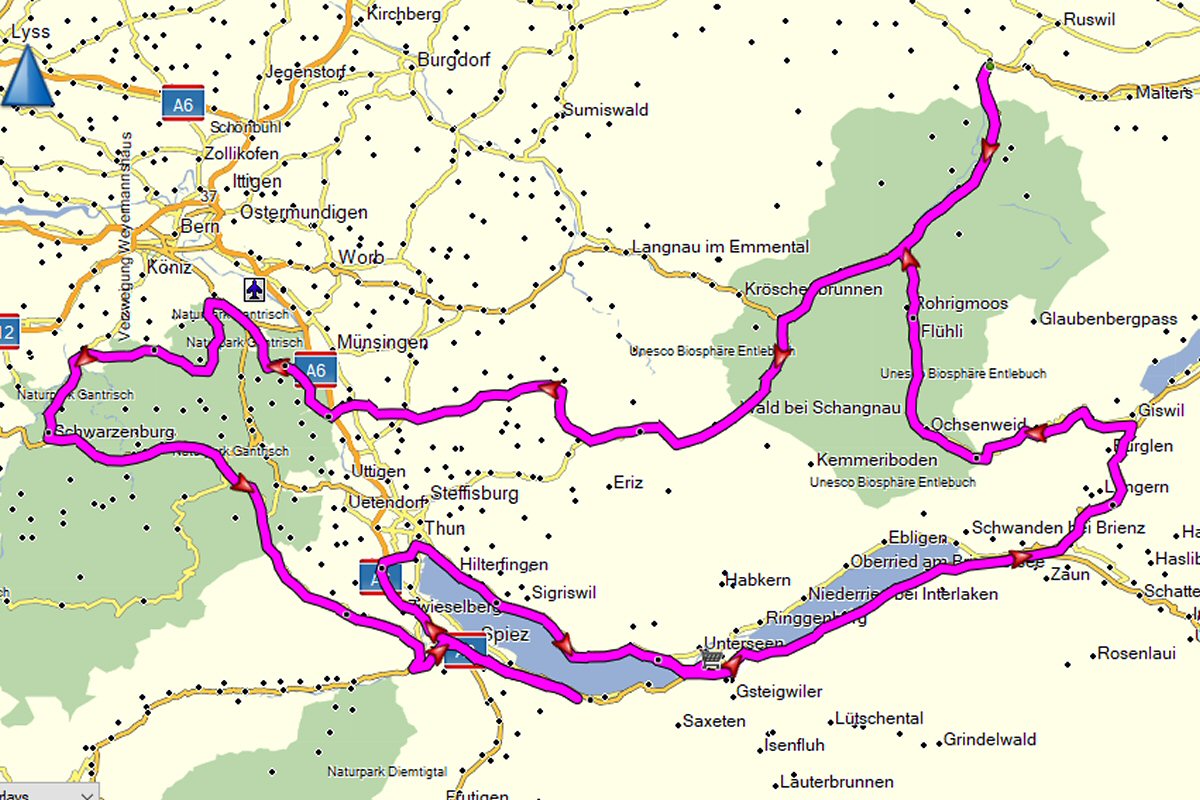 Toerrit: Giswil, Biosphäre Entlebuch, Wolhusen, Marbach, NP Gantrisch, Belpberg, Schwarzenburg, Leisingen, Thun, Interlaken (303Km)