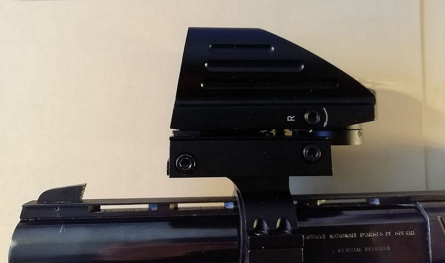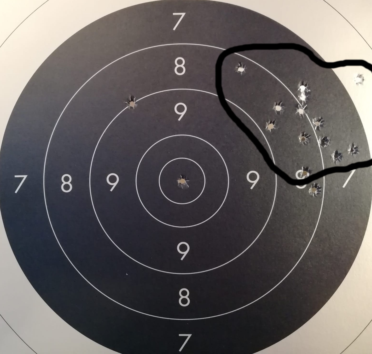 Er werd door een collega schutter gevraagd om zijn pistool met red-dot kijker in te schieten. Aangezien Toos een vast hand heeft en we niet wisten hoe gevoelig de afstelling was, heeft het een tijdje geduurd en menige kogels. 😀