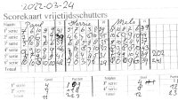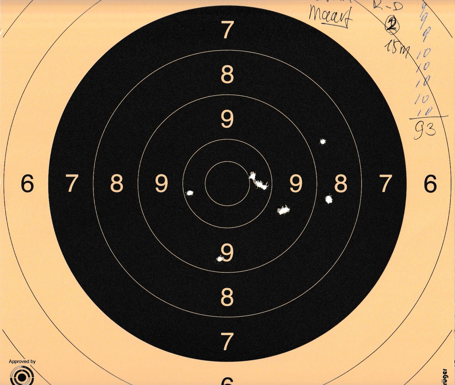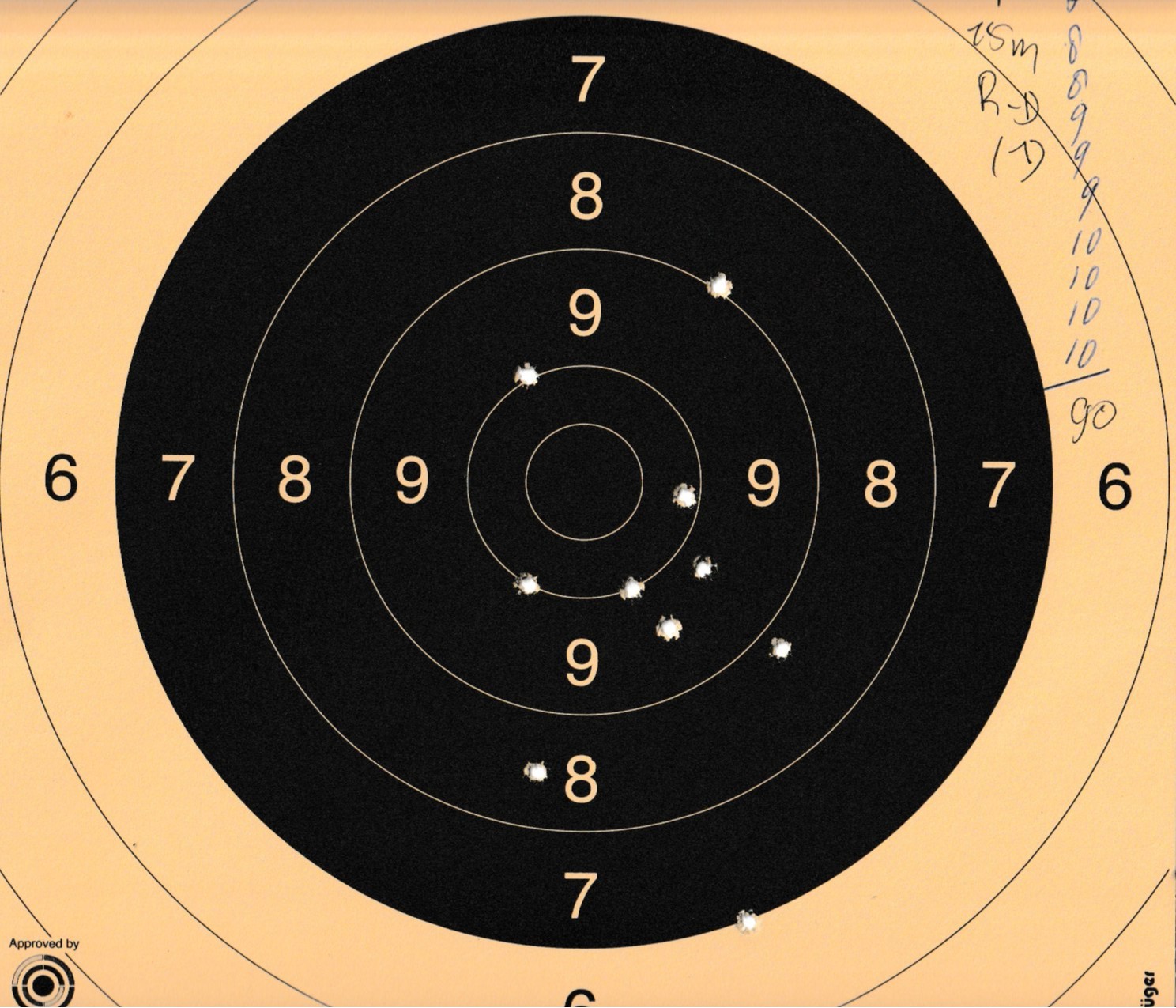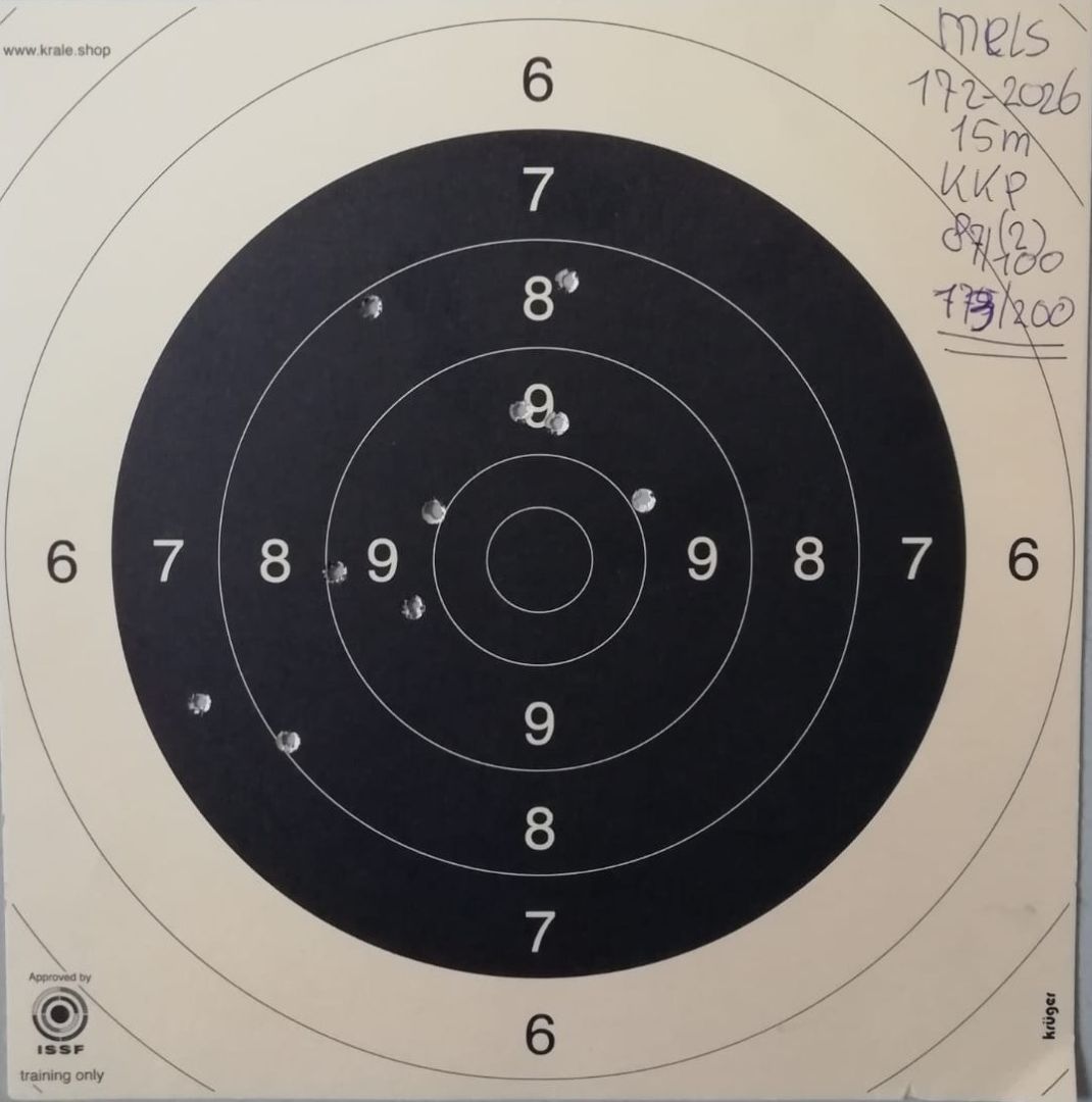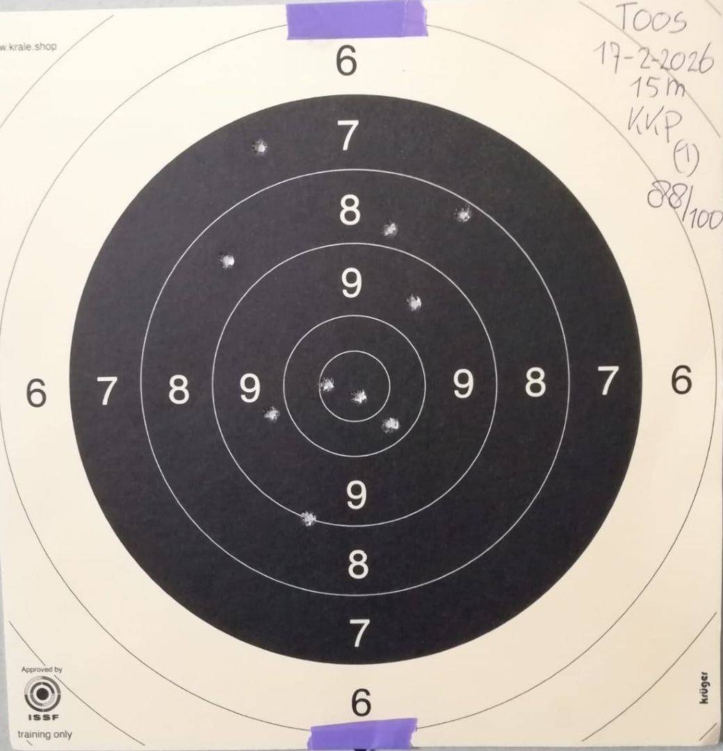 Mels (geschoten op 19 Mrt. 2026) en Toos (op 21 Mrt. 2026) hebben hun 2de pistool wedstrijd geschoten, staand op 15m. Dit keer met Mels met zijn eigen Browning Buck Mark Rosewood .22LR