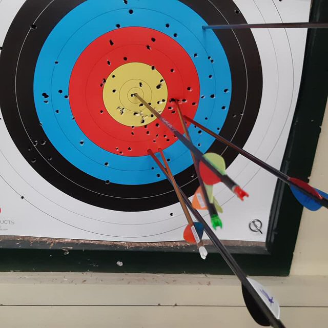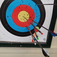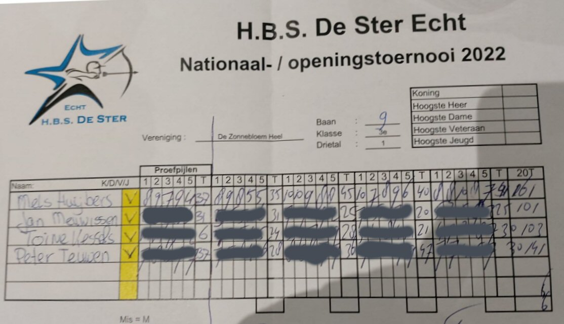 Mels heeft de eerste keer een 8+ gem. geschoten (20 pijlen) bij een handboog wedstrijd.